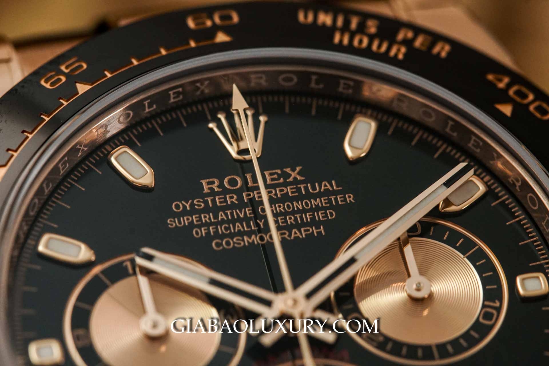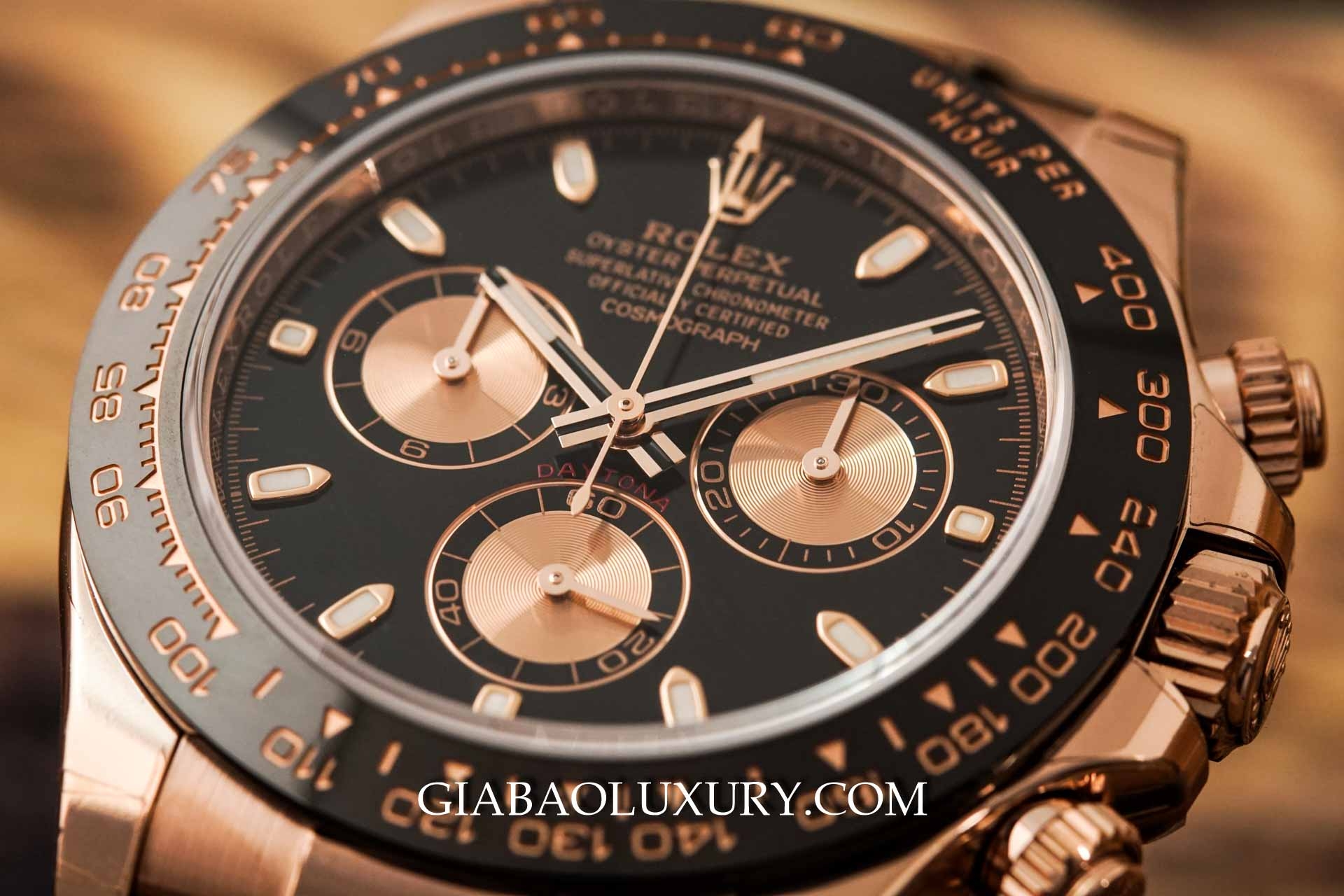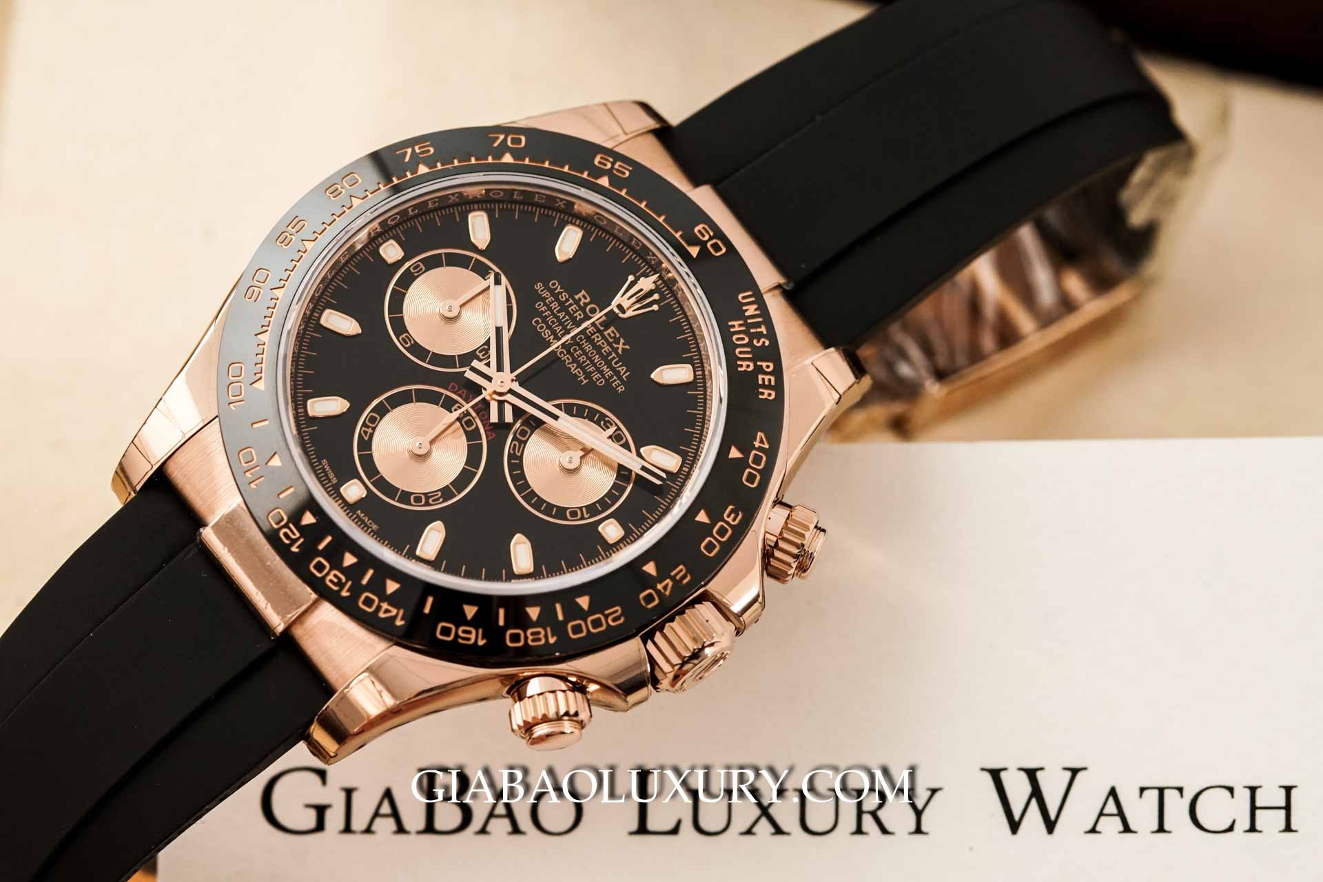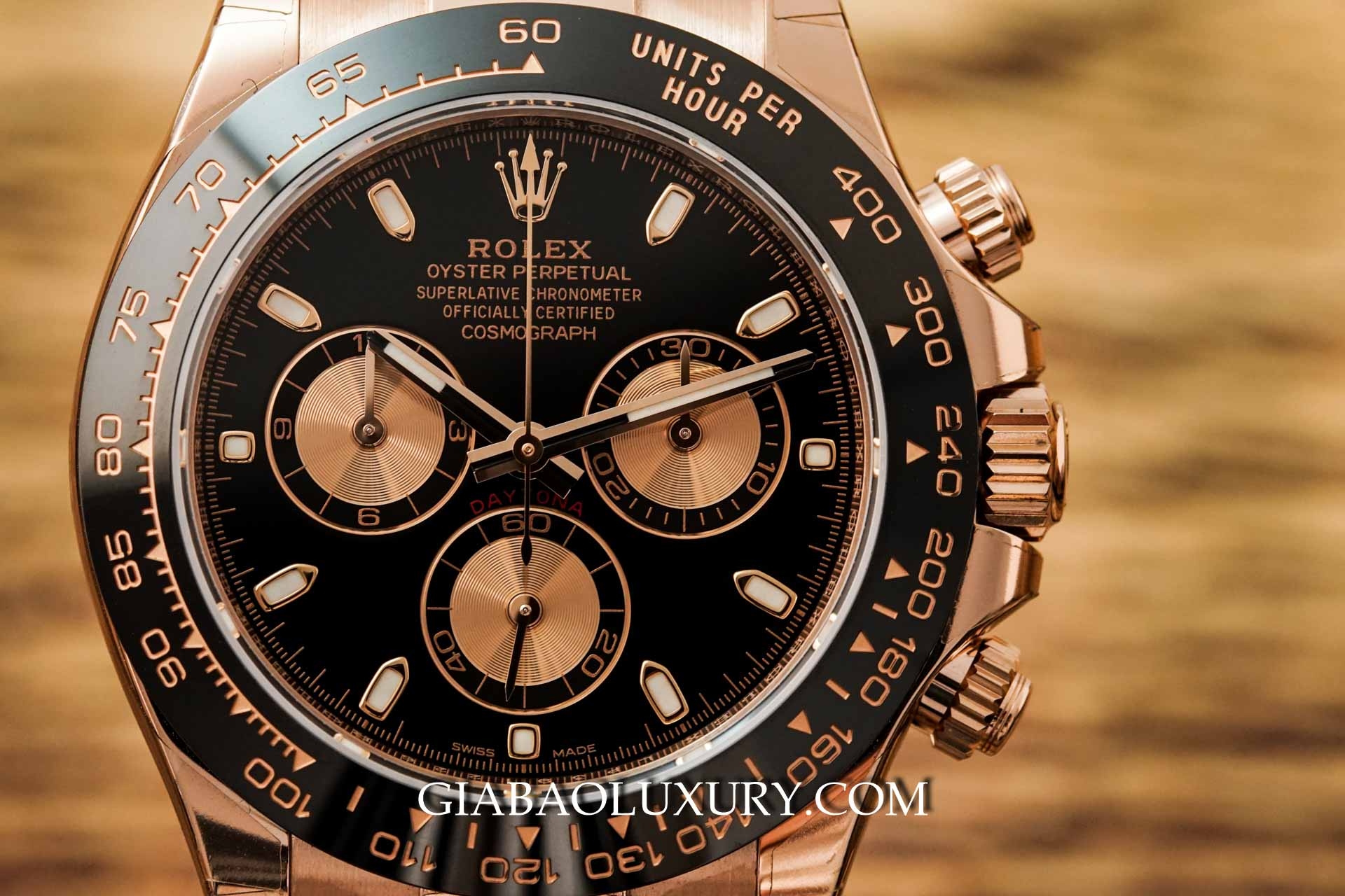 Rolex Cosmograph Daytona 116515 hoàn thiện từ chất liệu vàng hồng 18k kết hợp cùng với dây cao su. Mặt số đen-hồng cuốn hút và nổi vật với các cọc kim bằng vàng hồng. Ba mặt số phụ biểu hiện cho tính năng bấm giờ chronograph bao gồm: mặt số phụ chỉ 12 tiếng ở vị trí 9 giờ, mặt số phụ chỉ 30 phút ở vị trí 3 giờ và mặt số phụ góc 6h hiển thị kim giây của đồng hồ. Nổi bật trên mặt số duy nhất có lẽ là tên bộ sưu tập Daytona được thiết kế màu đỏ - tách biệt hẳn với tên các chi tiết khác như tên thương hiệu, logo và các chữ số khác bằng màu trắng.
