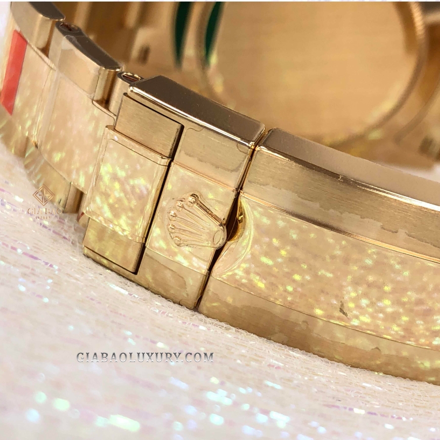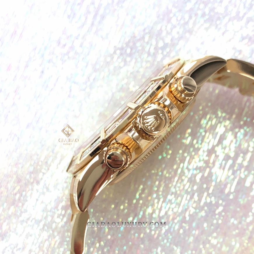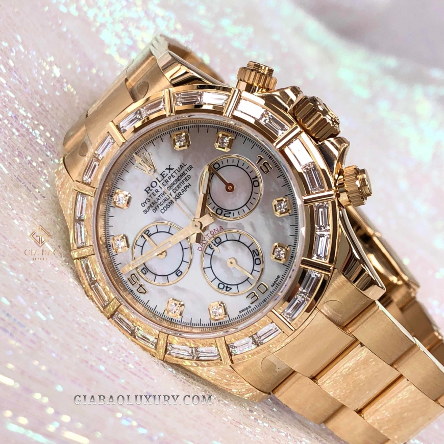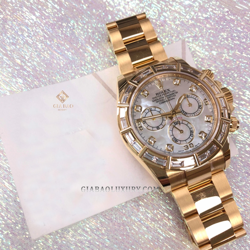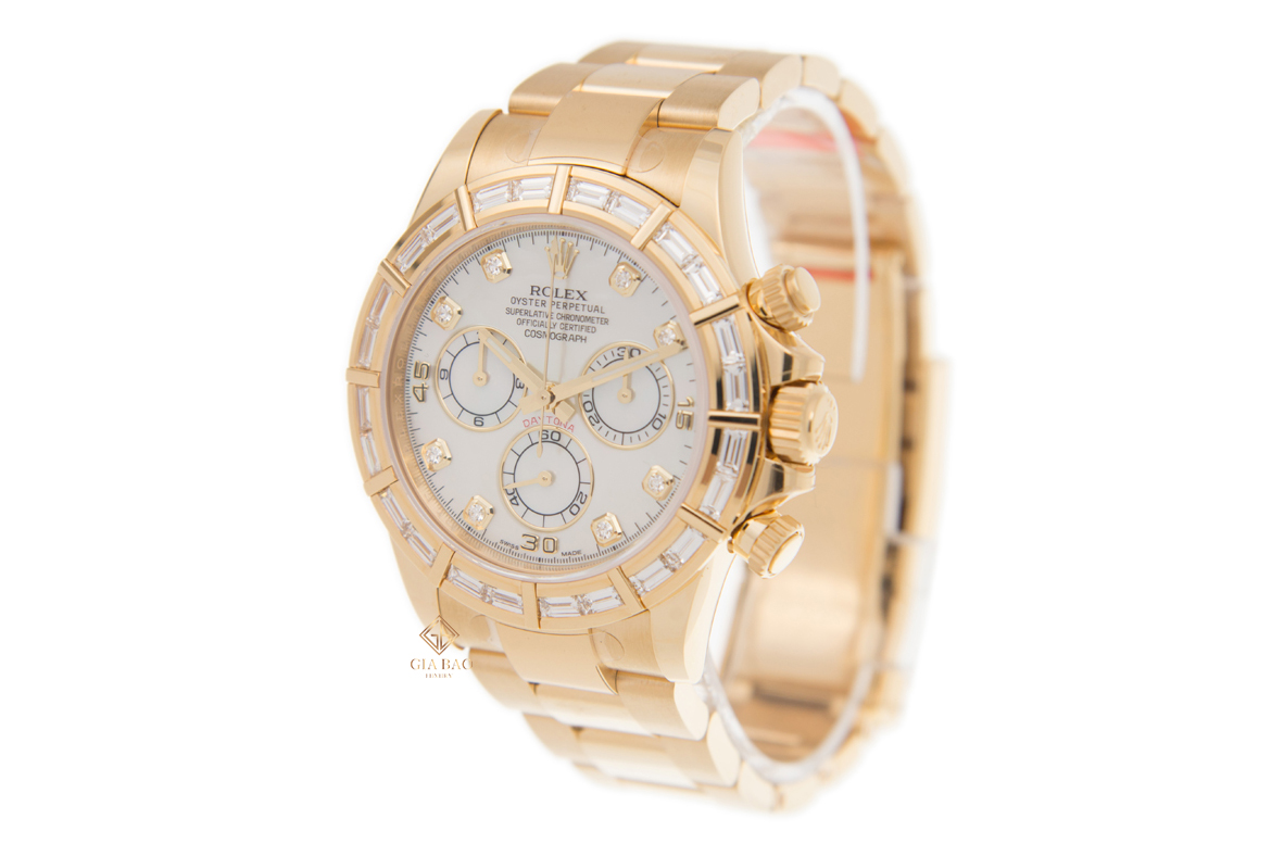 Cosmograph Daytona 116568BR Mặt Số Vỏ Trai có khả năng chịu được áp lực nước tốt ở độ sâu 100m, hoàn thiện vỏ ngoài với chất liệu vàng 18k nhẵn bóng có giá trị thẩm mỹ cao. Mặt đồng hồ vỏ ngọc trai kết hợp cùng 24 viên kim cương cắt gọt theo hình Baguette đính chắc chắn trên vành bezel càng làm tăng thêm vẻ sang trọng và khẳng định đẳng cấp của những chiếc Rolex Cosmograph Daytona.