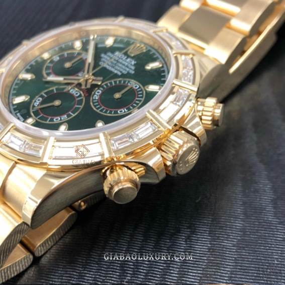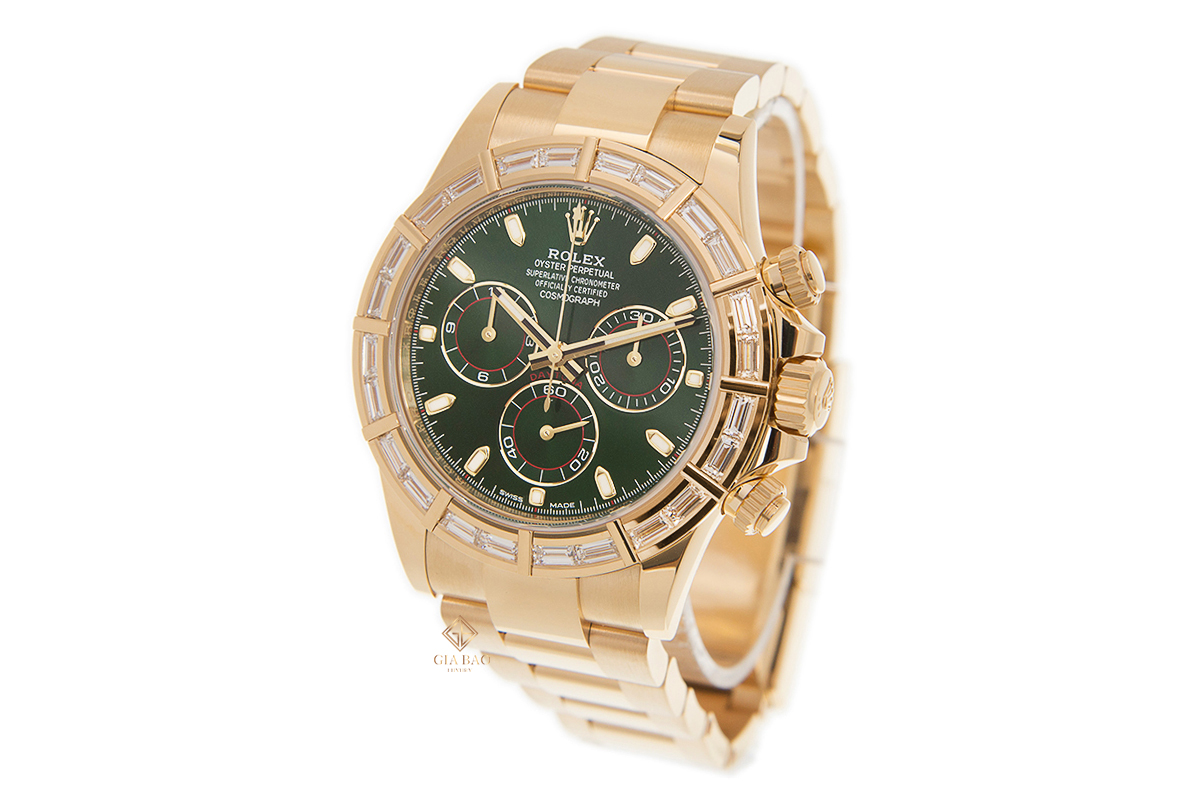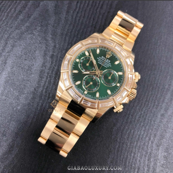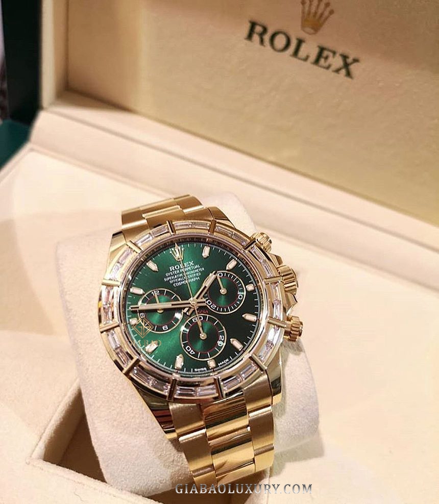 Không còn đóng vai trò là công cụ chuyên dụng như trước, đồng hồ đeo tay hiện nay thiên về mặt thẩm mỹ nhiều hơn. Chính vì vậy, những thiết kế thể thao như Daytona của thương hiệu Rolex cũng được thêm phiên bản đính đá quý, như trường hợp của chiếc Rolex Cosmograph Daytona 116568BR Mặt Số Xanh.