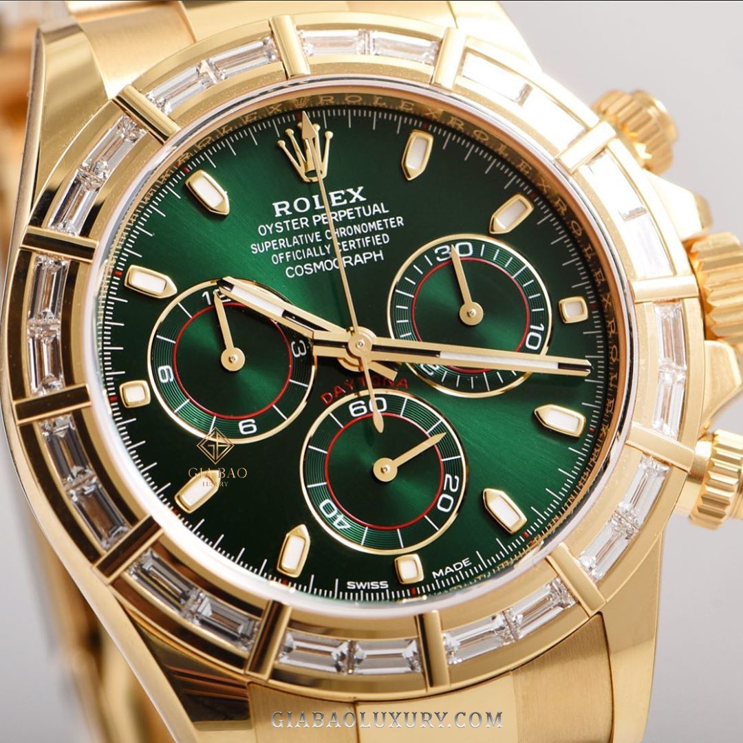 Trên mặt số xanh lá chải tia, những mốc giờ bằng vàng khối trở nên nổi bật hơn rất nhiều, đồng thời làm tăng chiều sâu cho thiết kế. Daytona không phải là dòng đồng hồ lặn như Submariner, nên kim và cọc số không cần quá lớn để sử dụng nhiều chất phản quang. Mặt số đồng hồ còn có thêm ba mặt số phụ hiển thị tính năng Chronograph và kim giây nhỏ, được trang trí bởi viền vàng, điểm xuyết thêm một chút màu đỏ.