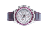 Bộ sưu tập Daytona gắn liền với tên tuổi của diễn viên, tay đua Paul Newman trong quá khứ, ngày hôm nay đã được Rolex tân trang trong nhiều diện mạo khác biệt. Hiếm có và đắt đỏ hang đầu chính là mẫu đồng hồ Rolex Cosmograph Daytona 116589SALV. Bộ ba chất liệu đem đến giá trị cho mẫu đồng hồ Daytona 116589SALV chính là vàng trắng từ bộ vỏ khung, thiên thạch có trong mặt số và dĩ nhiên là 24 viên đá ruby với màu hồng sang trọng trên vành bezel.