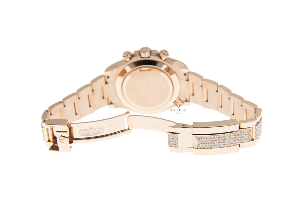 Phong cách đính kim cương trên bộ dây Oyster được Rolex tiết kế bớt, chỉ làm ở phần mắt dây trung tâm. Đây là một lựa chọn thông minh, giúp cho chiếc đồng hồ giữ lại một số bề mặt bằng vàng và cũng làm cho thiết kế đỡ chói mắt hơn. Bề mặt vàng còn được giữ lại trên các nút bấm Chronograph và cả núm chỉnh giờ, tạo sự thoải mái khi thao tác.