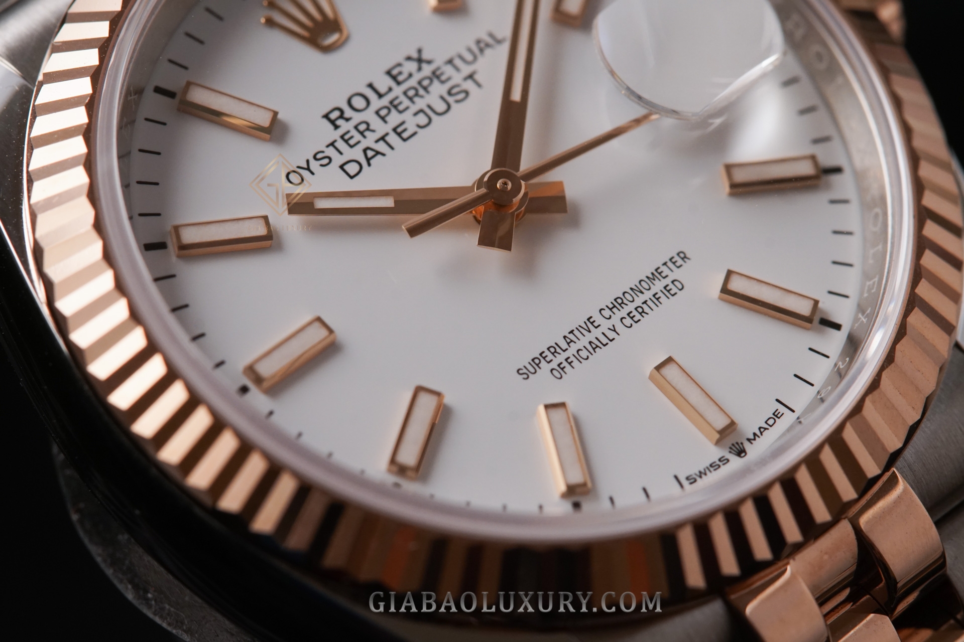 Trên mặt số trắng là các cọc số dạ quang nổi bật. Những cọc chỉ giờ đều bằng vàng Everose và được đính nổi trên mặt số, sau đó thì được phủ kín chất phát quang bên trên. Xen giữa hệ thống cọc chỉ giờ là ô cửa sổ báo ngày nhỏ gọn đặt góc 3 giờ. Để người đeo xem giờ dễ dàng nhất có thể, Rolex đã tích hợp kính phóng đại dạng lồi mang tên Cyclops trên mặt kính sapphire chống lóa.