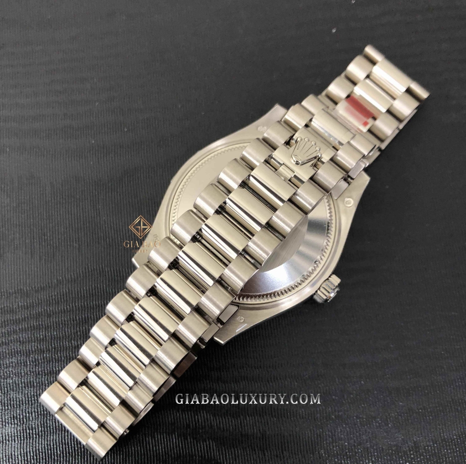 Ref. 278289RBR được trang bị dây đeo President hay còn có tên khác là dây đeo Tổng thống. Dưới chất liệu white gold dây đeo 3 mối nối hình bán tròn được kết hợp với khóa gập Crownclasp thế hệ mới, được mở ra với vương miện Rolex đây được xem là bộ dây hoàn hảo giúp tôn lên vẻ đẹp thanh lịch trên cổ tay nữ giới.