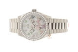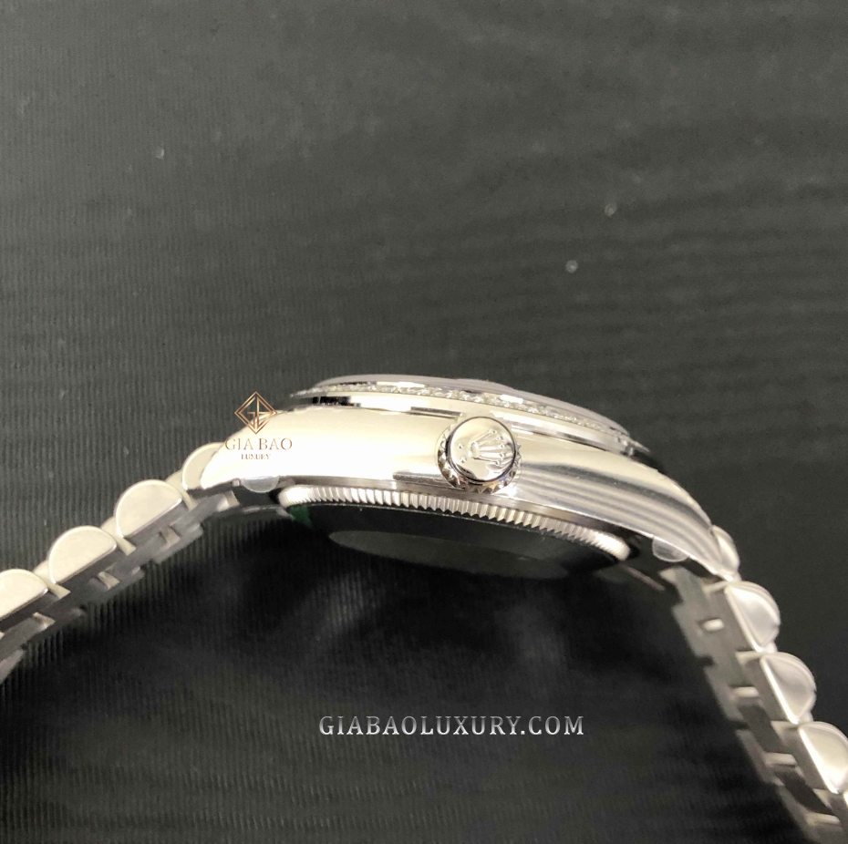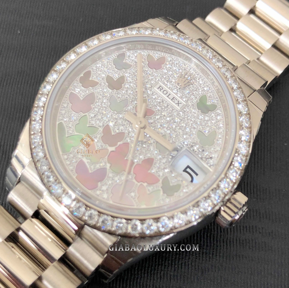 Nhìn qua mặt trên của chiếc đồng hồ, bộ vành bezel được đính những viên kim cương lấp lánh. Những nghệ nhân tay nghề cao của nhà Rolex đã thể hiện trình độ chạm khắc và đính kim cương của mình một cách hoàn hảo để có thể đem đến những khúc dạo đầu lấp lánh cho chiếc đồng hồ. Dưới mặt kính saphire đường kính 31mm là mặt số đồng hồ chạm khắc kim cương, đây là một sự kết hợp lấp lánh giúp nâng tầm chiếc đồng hồ và sự quyến rũ người đeo. Bên cạnh chất lượng của những viên kim cương là họa tiết Butterfly được tạo hình từ chất liệu vỏ trai trắng, mặt số đồng hồ trở thành điểm nhấn nổi bật cho chiếc đồng hồ.