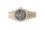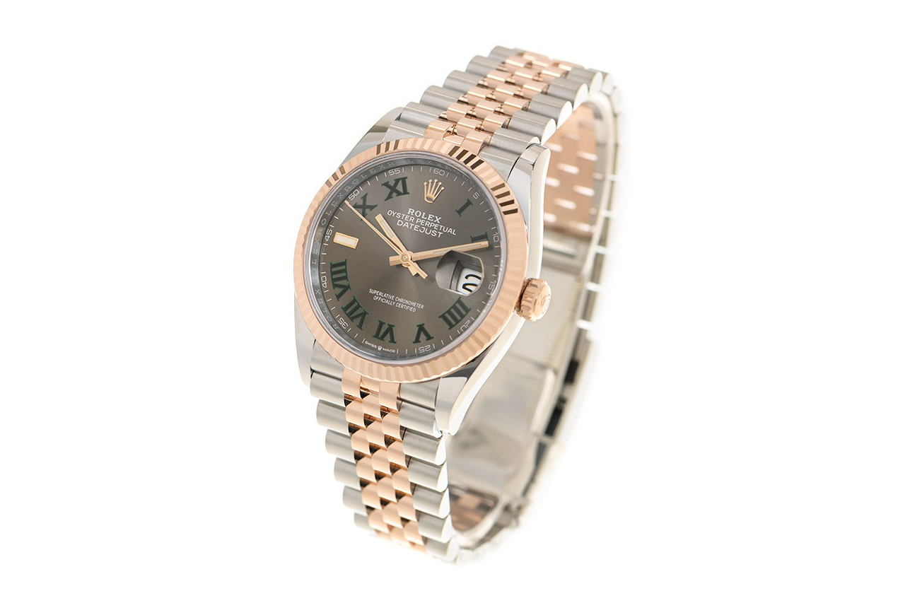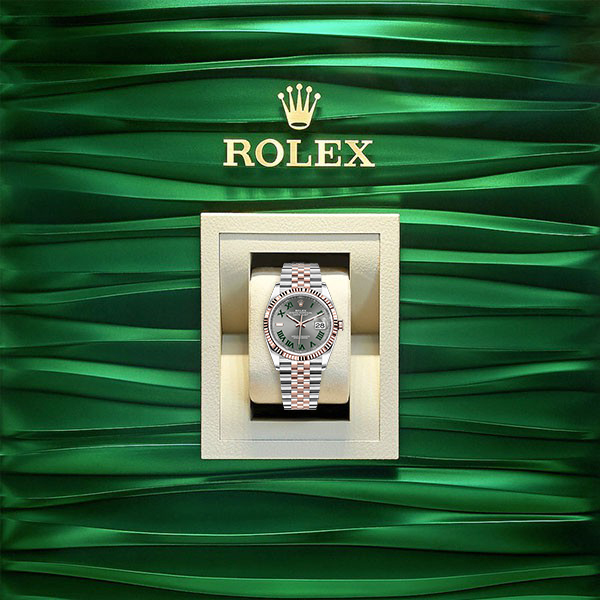 Ref. 126231 sở hữu một mặt số với tông màu xám đặc biệt của mặt số Wimbledon cùng với sự kết hợp của cọc số la mã màu xanh lá. Sự lựa chọn của nhà thiết kế khi chọn mặt số này trong chất liệu Demi vàng hồng càng làm tăng thêm sự lôi cuốn cho chiếc đồng hồ và không hề thua kém những mặt số nạm kim cương.
