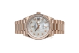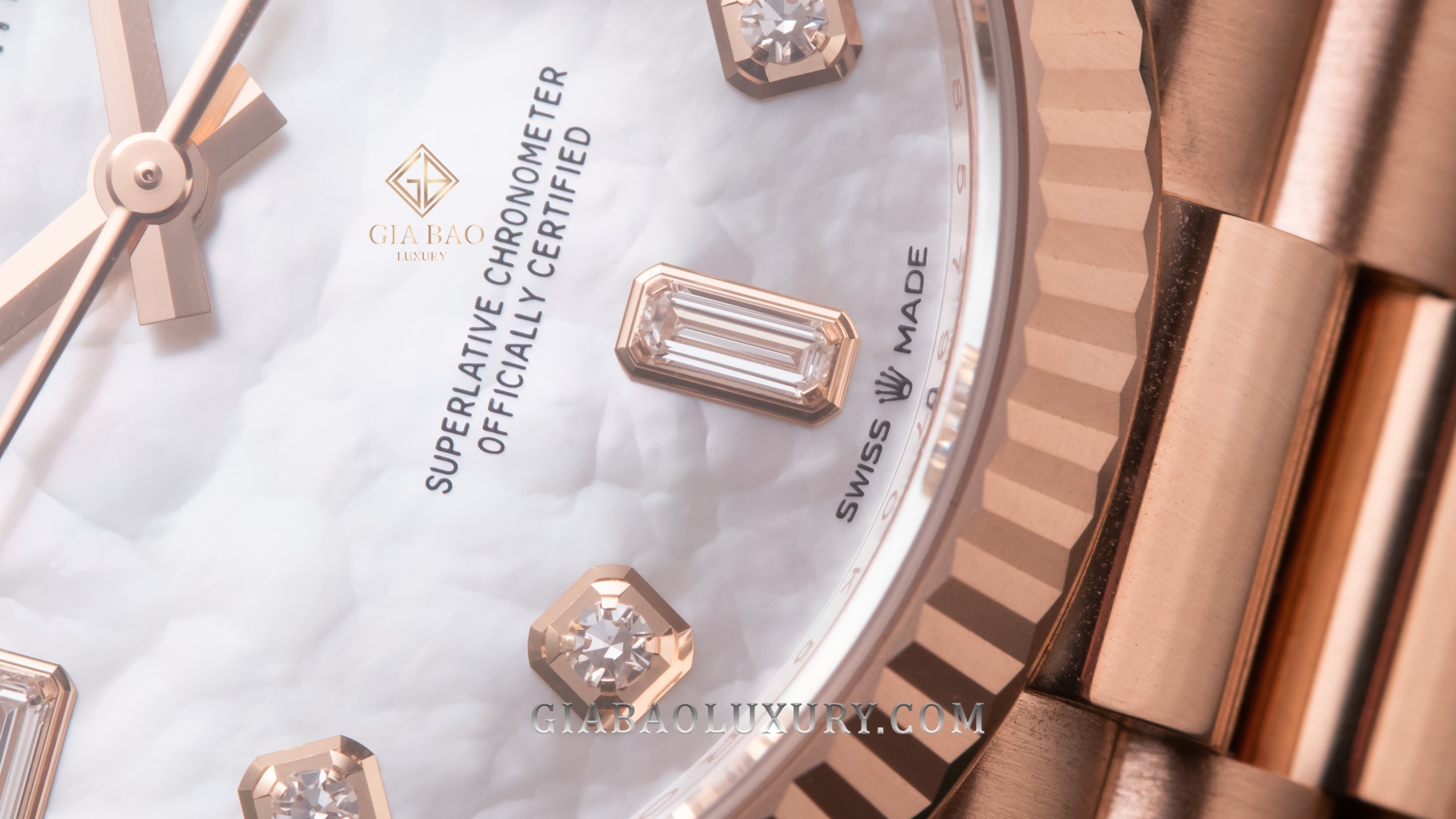 Day-Date 128235-0029 hiển thị thời gian thông qua mặt số vỏ trai trắng tuyệt đẹp. Dưới ánh sáng Mặt Trời, lớp vỏ trai tỏa sáng kỳ diệu với các dải màu khác nhau. Kết hợp cùng kim cương lấp lánh ở 10 cọc số trong đó có 2 viên kim cương baguette, ref. 128235-0029 xứng đáng là món phụ kiện hoàn hảo hoàn thiện vẻ đẹp cho bất cứ trang phục nào.