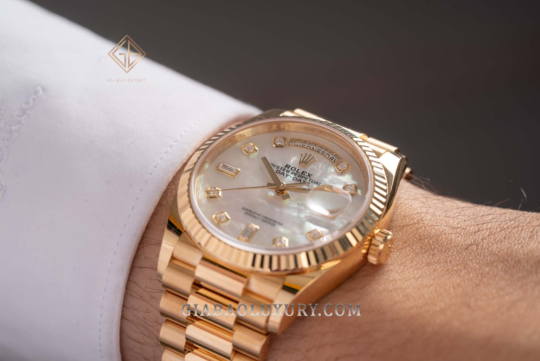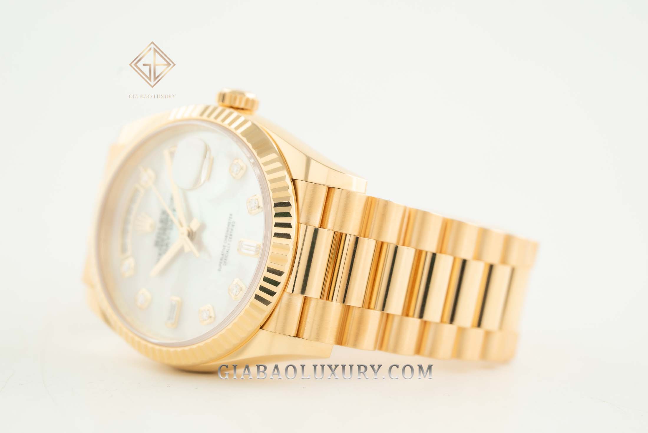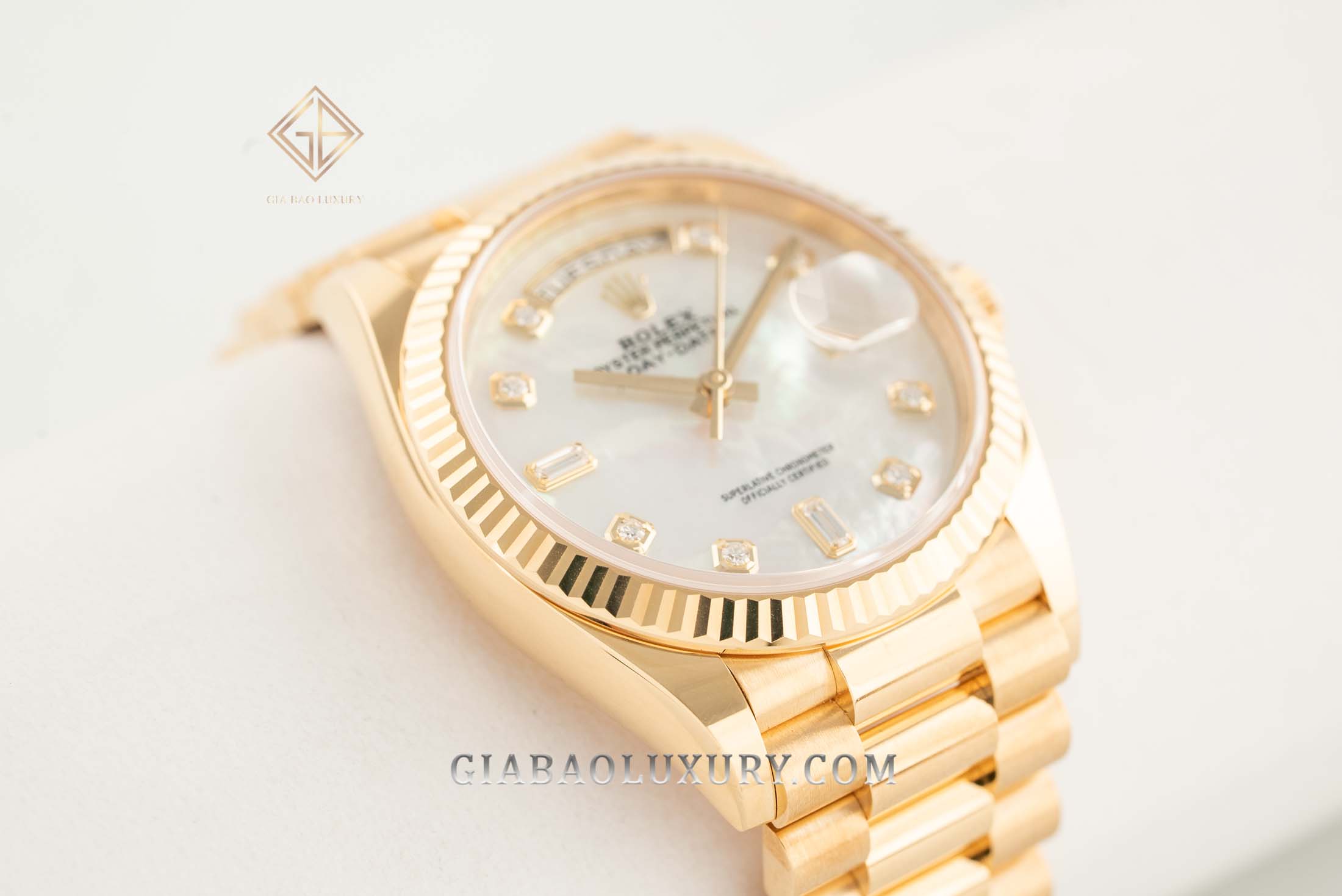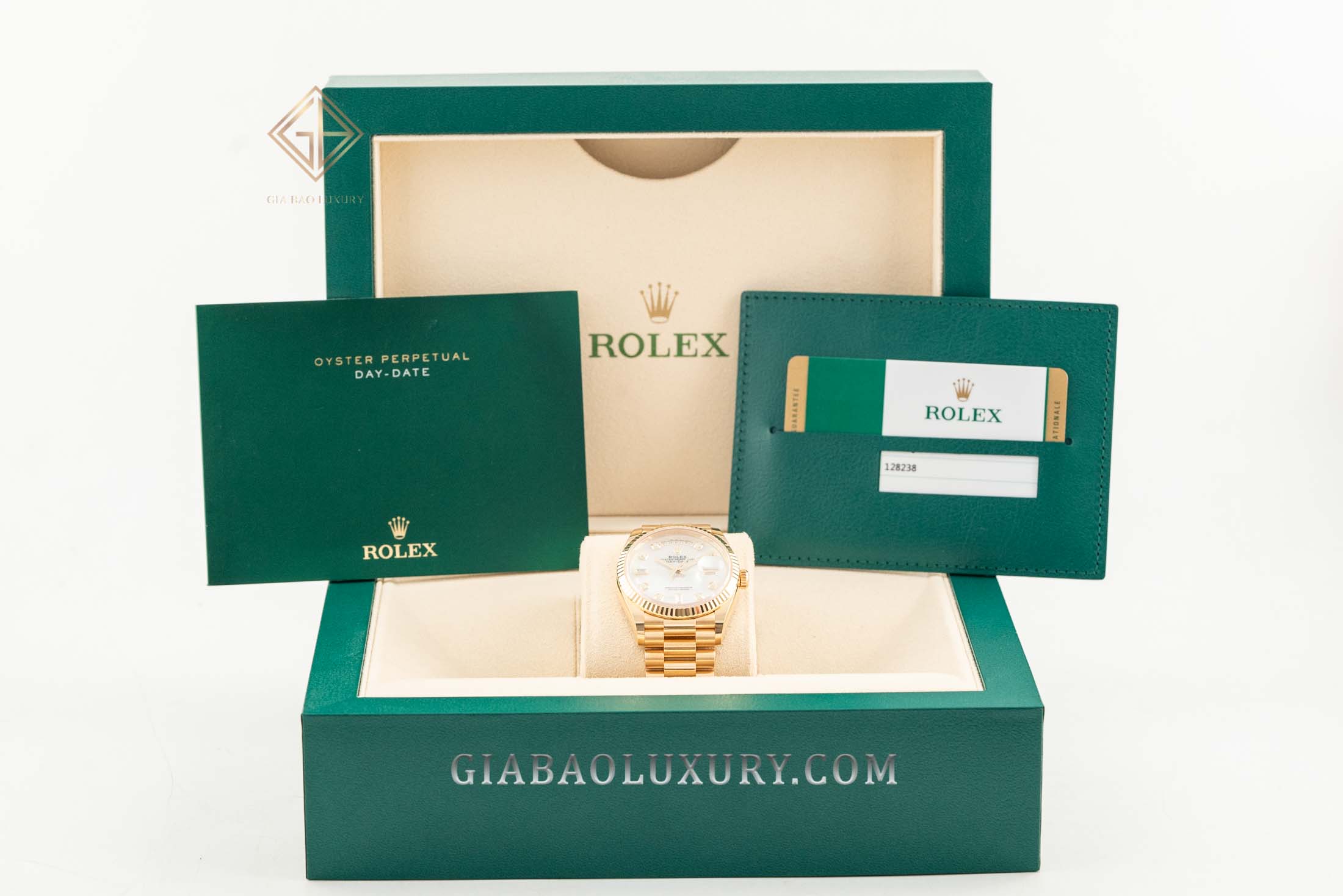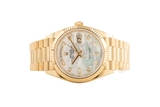 Ví như người nghệ sĩ tài ba, thương hiệu Rolex liên tục trình làng những kiệt tác đồng hồ có diện mạo tuyệt đẹp, chất liệu sang trọng và bộ máy tân tiến, phức tạp. Kỹ nghệ chế tác đồng hồ bậc thầy của nhà Rolex đã được thể hiện rõ nét qua những model trong bộ sưu tập Day-Date huyền thoại. Một trong những phiên bản đồng hồ mới của Rolex Day-Date hiện đang có mặt tại Gia Bảo Luxury là chiếc đồng hồ mang mã hiệu 128238 có bộ vỏ vàng gold nguyên khối và mặt số khảm trai lộng lẫy.