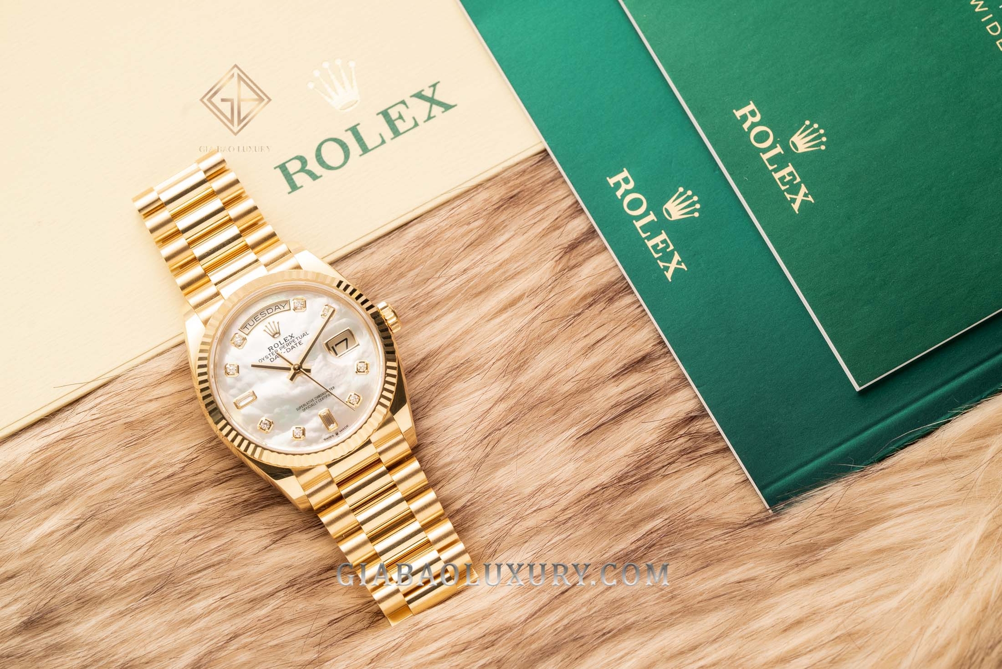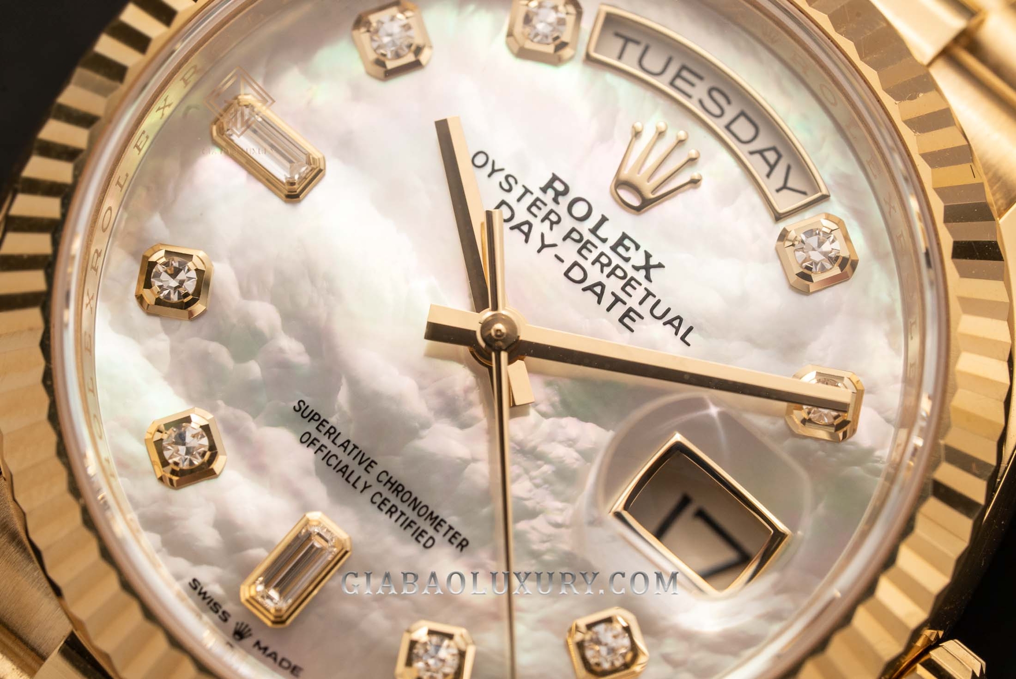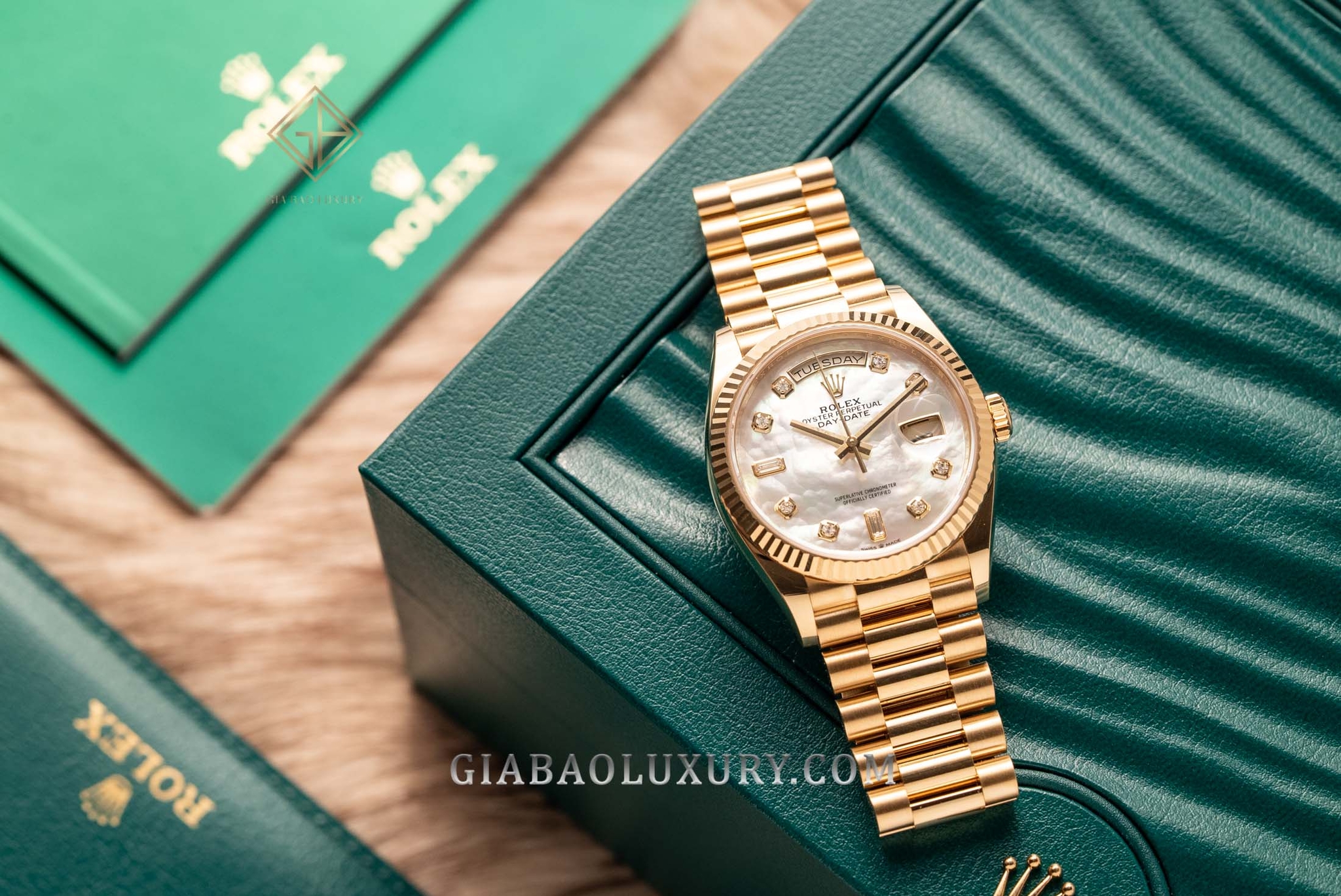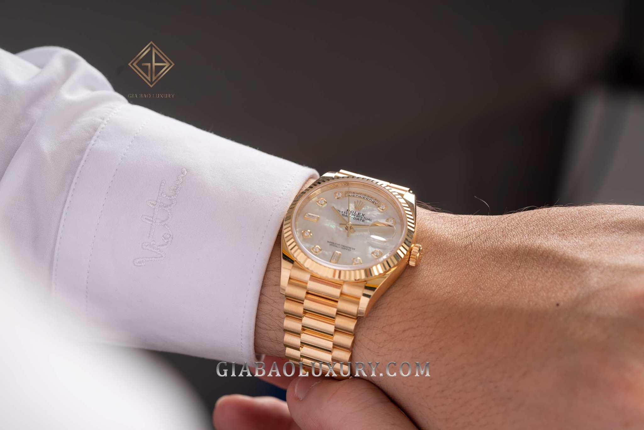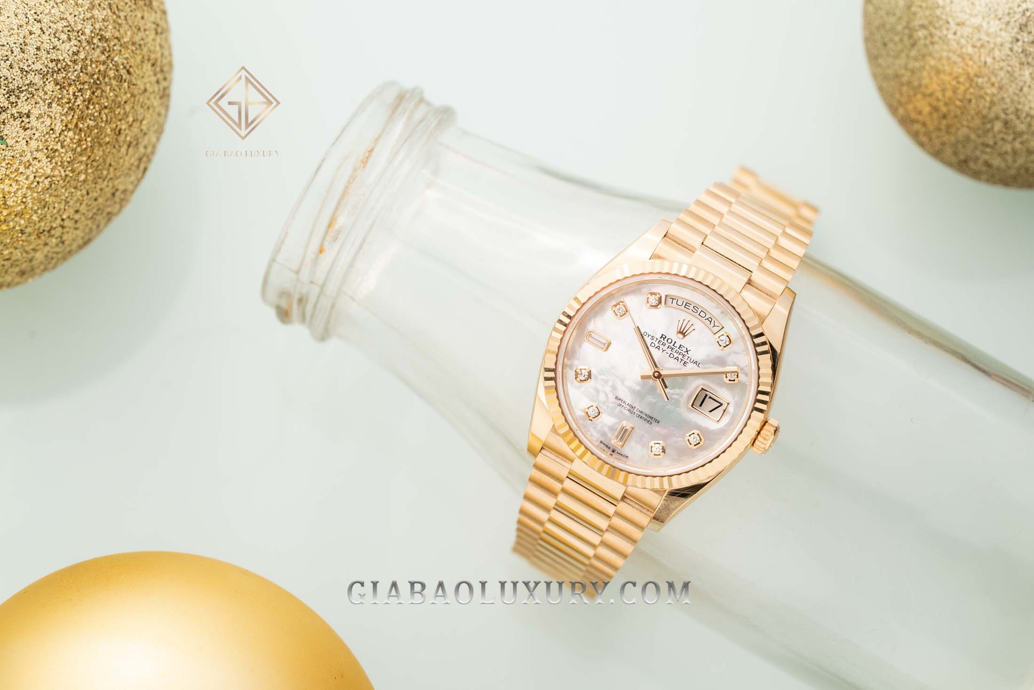 Ví như người nghệ sĩ tài ba, thương hiệu Rolex liên tục trình làng những kiệt tác đồng hồ có diện mạo tuyệt đẹp, chất liệu sang trọng và bộ máy tân tiến, phức tạp. Kỹ nghệ chế tác đồng hồ bậc thầy của nhà Rolex đã được thể hiện rõ nét qua những model trong bộ sưu tập Day-Date huyền thoại. Một trong những phiên bản đồng hồ mới của Rolex Day-Date hiện đang có mặt tại Gia Bảo Luxury là chiếc đồng hồ mang mã hiệu 128238 có bộ vỏ vàng gold nguyên khối và mặt số khảm trai lộng lẫy.