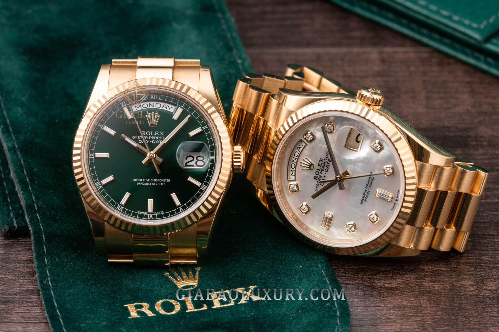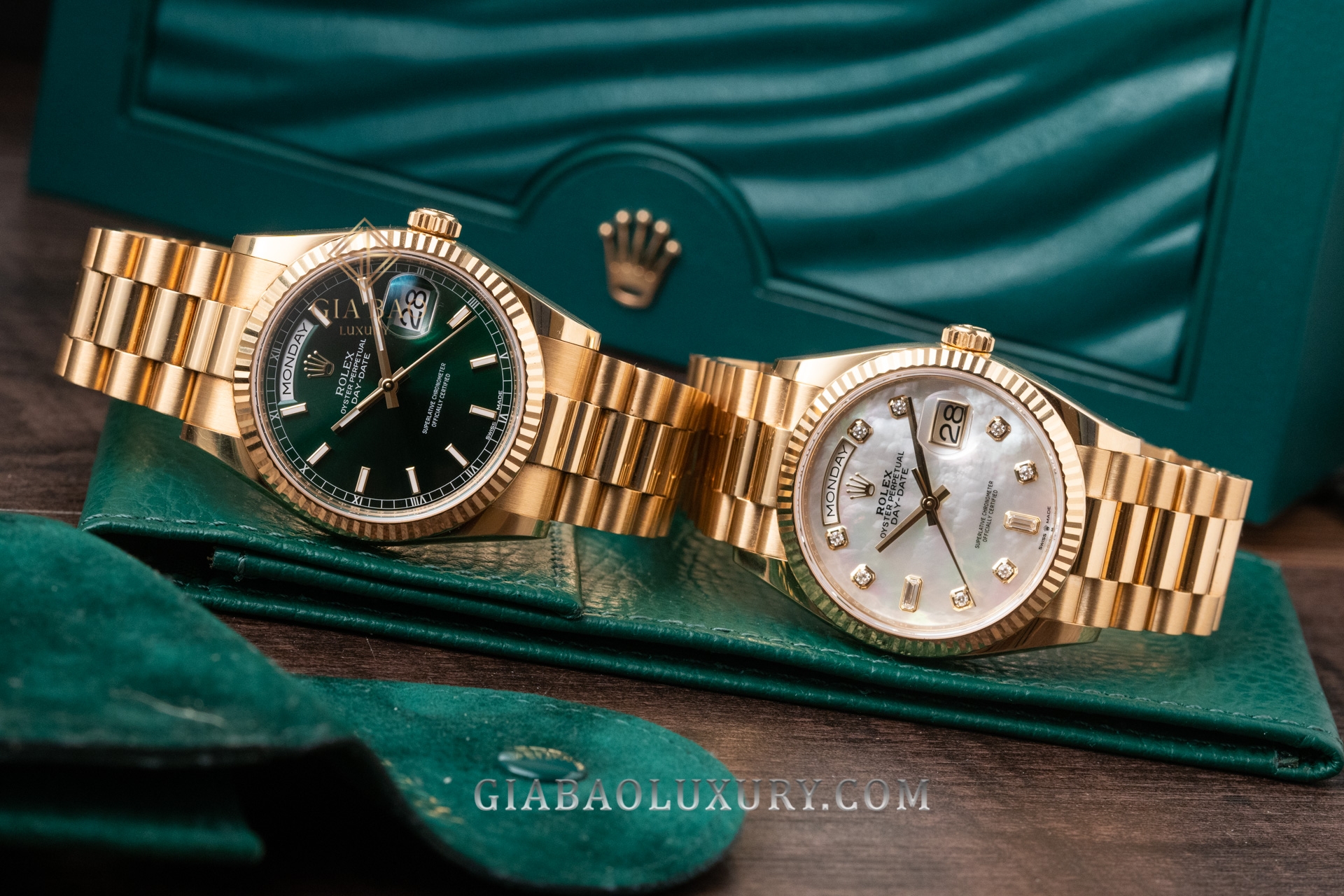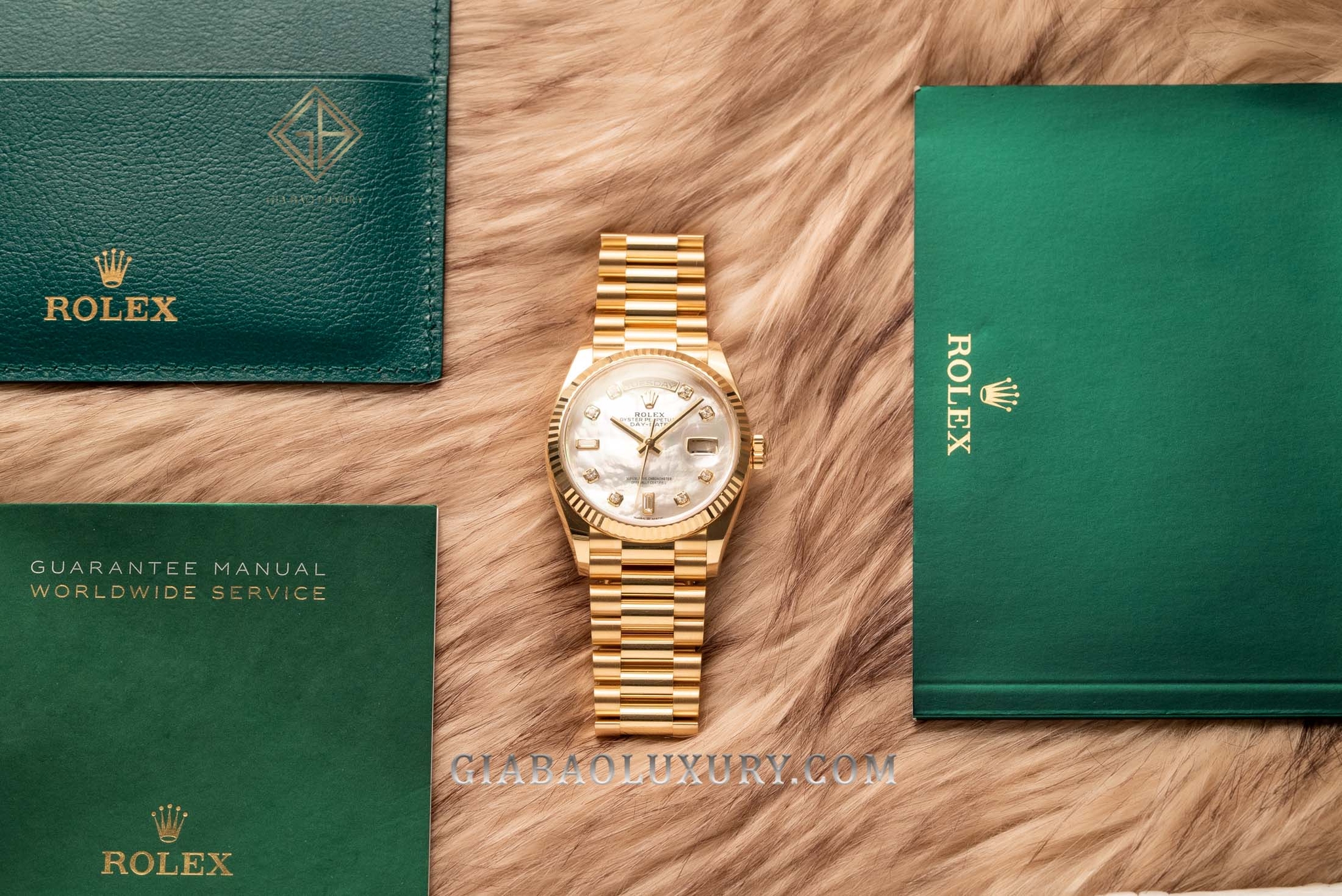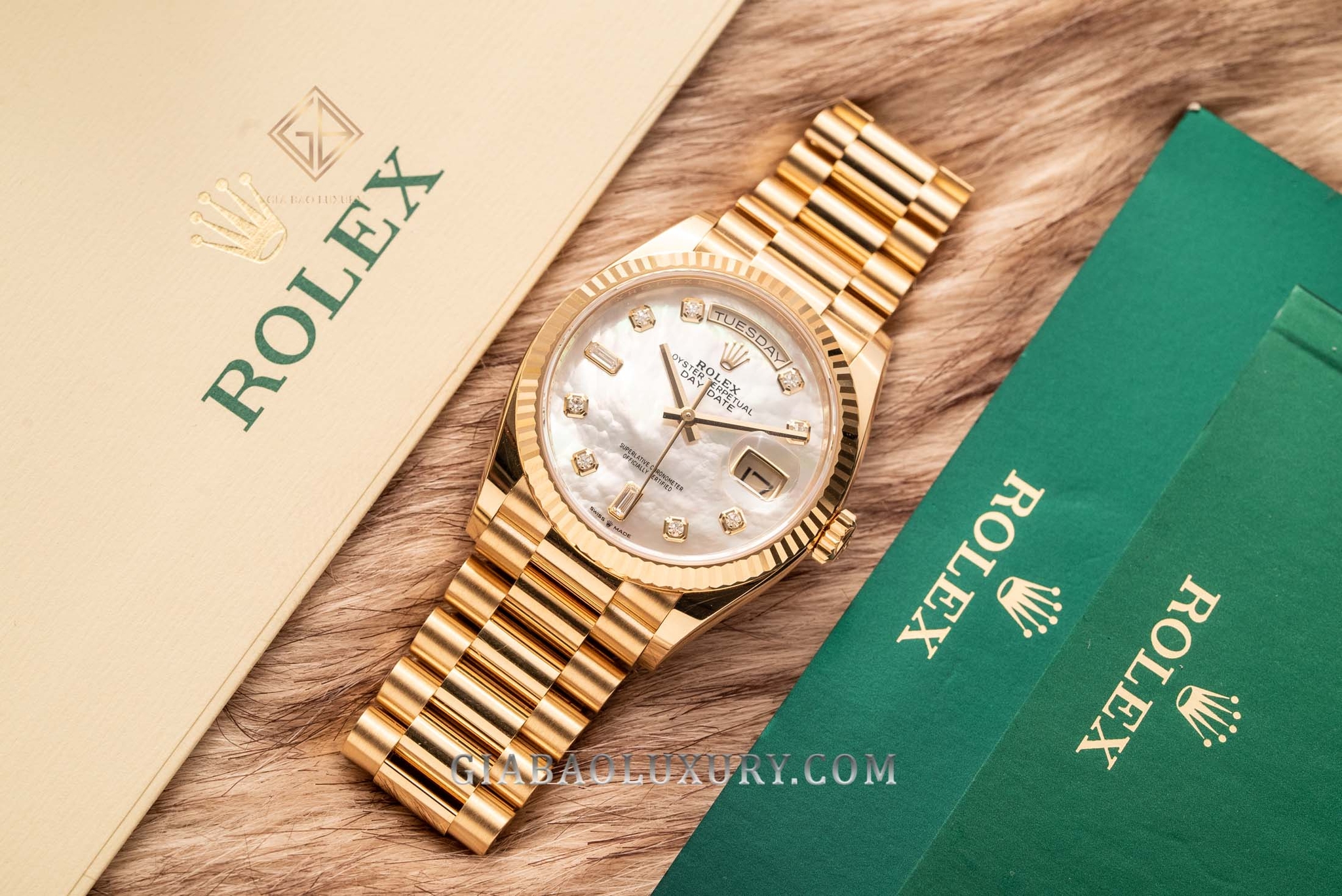 Ví như người nghệ sĩ tài ba, thương hiệu Rolex liên tục trình làng những kiệt tác đồng hồ có diện mạo tuyệt đẹp, chất liệu sang trọng và bộ máy tân tiến, phức tạp. Kỹ nghệ chế tác đồng hồ bậc thầy của nhà Rolex đã được thể hiện rõ nét qua những model trong bộ sưu tập Day-Date huyền thoại. Một trong những phiên bản đồng hồ mới của Rolex Day-Date hiện đang có mặt tại Gia Bảo Luxury là chiếc đồng hồ mang mã hiệu 128238 có bộ vỏ vàng gold nguyên khối và mặt số khảm trai lộng lẫy.