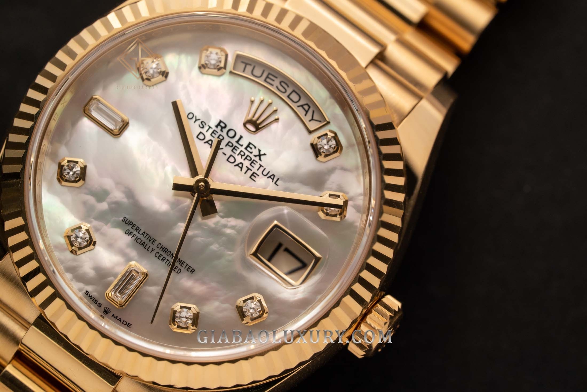 Mặt số khảm trai đi cùng các cọc số kim cương viền vàng mang một sức hút rất riêng bởi cả hai đều có tính chất hút sáng, nhưng không có cái nào làm lu mờ cái nào. Trung tâm mặt số là bộ kim dáng gậy thanh mảnh, vị trí 12 giờ và 3 giờ lần lượt là ô cửa báo thứ và báo ngày đặc trưng của dòng đồng hồ Tổng thống.