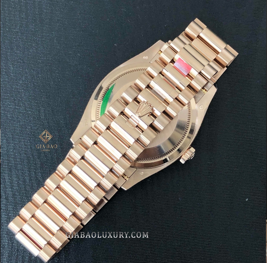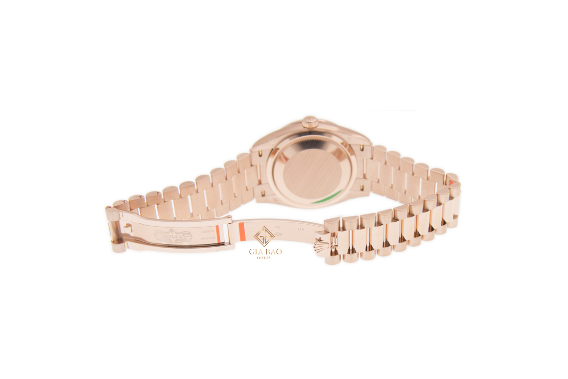 Toàn bộ mẫu đồng hồ hiện lên với tông hồng cam đặc biệt ấm áp mà vẫn sáng bóng nhờ kỹ thuật đánh bóng đỉnh cao từ nhà sản xuất. Trong chất liệu vàng Everose độc quyền, Rolex Day-Date 36 128345RBR đảm bảo khả năng chống xước, chống xỉn màu xuất sắc. Hơn nữa, trong kết cấu nắp vặn chặt, núm vặn xoáy sâu, bộ vỏ Oyster đảm bảo Rolex Day-Date 36 128345RBR có thể hoạt động trong môi trường tương đương ở độ sâu 100m.