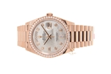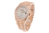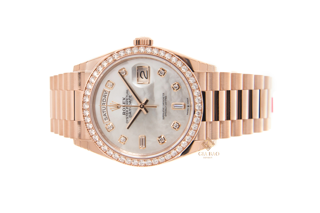 Nếu đồng hồ bằng vàng vàng đã thống trị thị trường trong nhiều năm qua thì giờ đây, khách hàng lại tìm đến những thiết kế bằng vàng hồng và vàng trắng vì vẻ đẹp sang trọng và tinh tế, không quá khoa trương. Rolex Day-Date 36 128345RBR là một thiết kế đẹp mắt và sang trọng khi sở hữu lớp vỏ vàng Everose cùng mặt số rất được ưa thích - mặt số khảm trai với những cọc số kim cương baguette cao cấp.