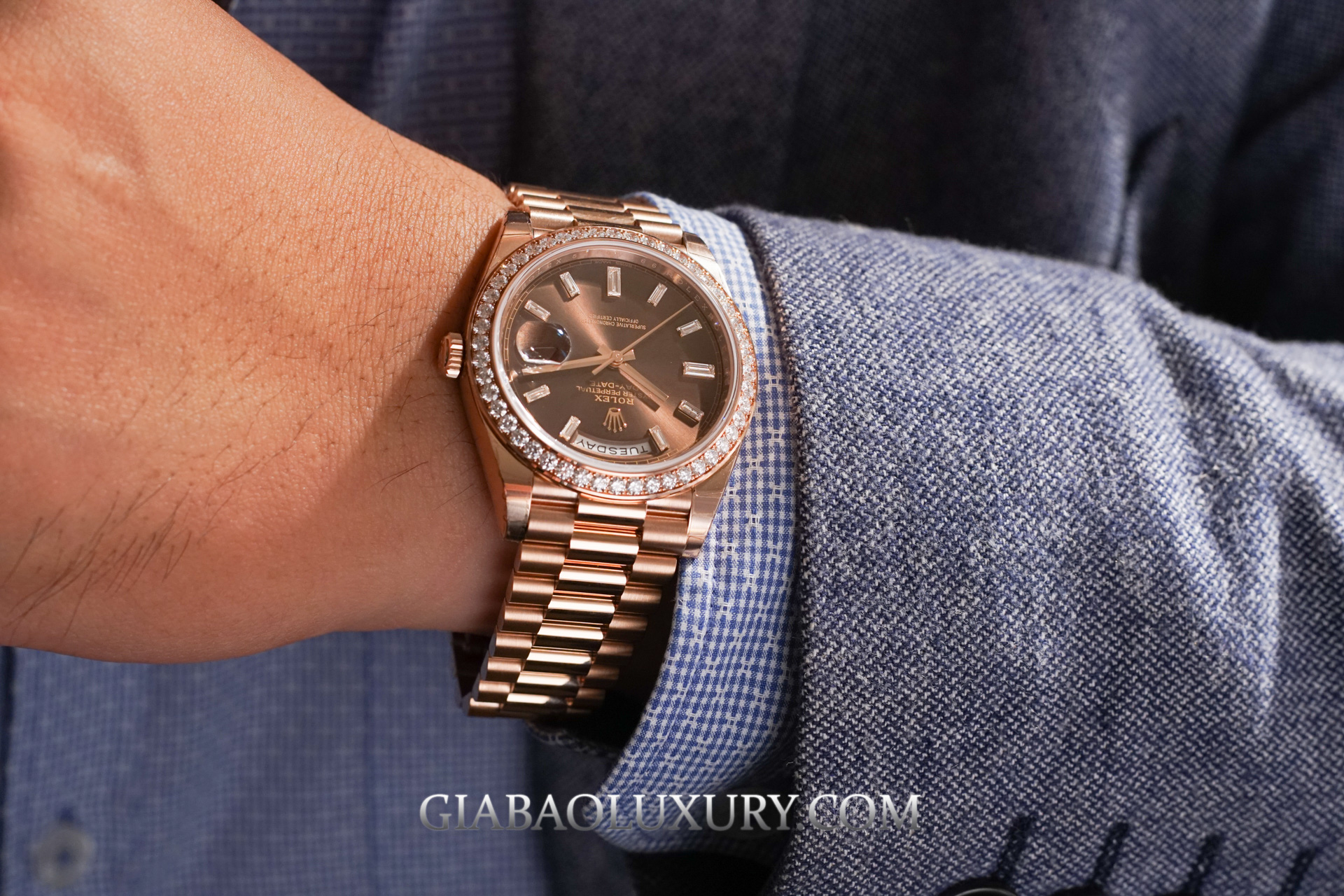 Giới thiệu đồng hồ Rolex Day-Date 40 228345RBR Mặt Số Chocolate Cọc Kim Cương
