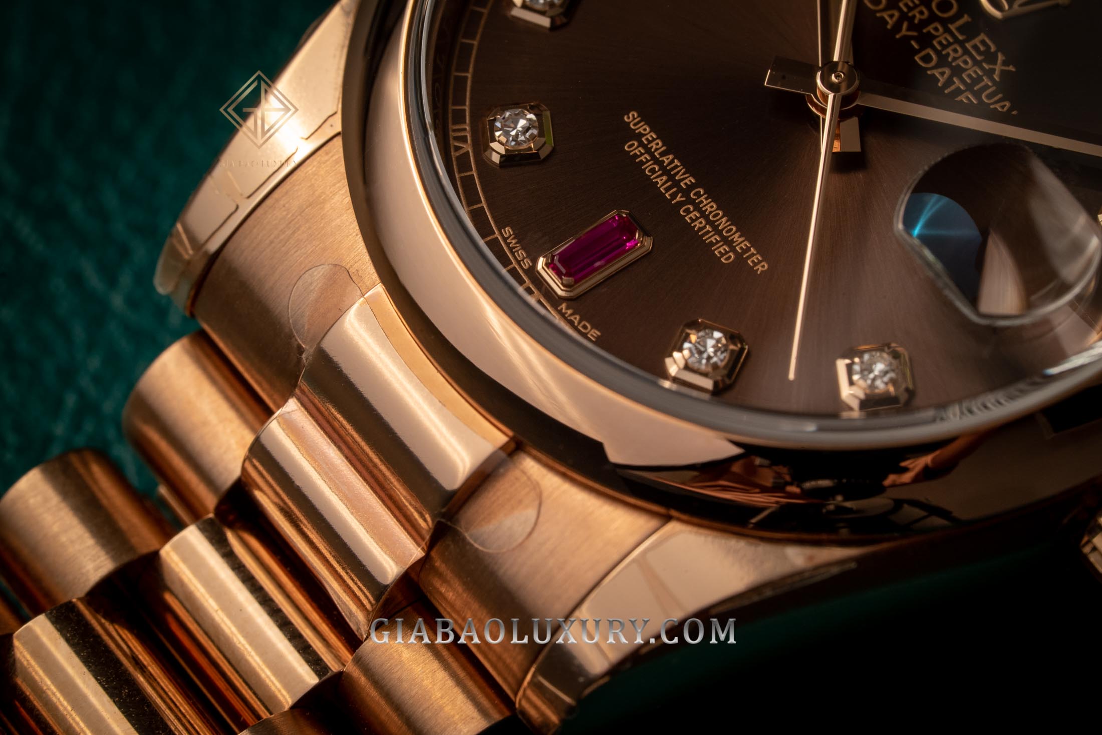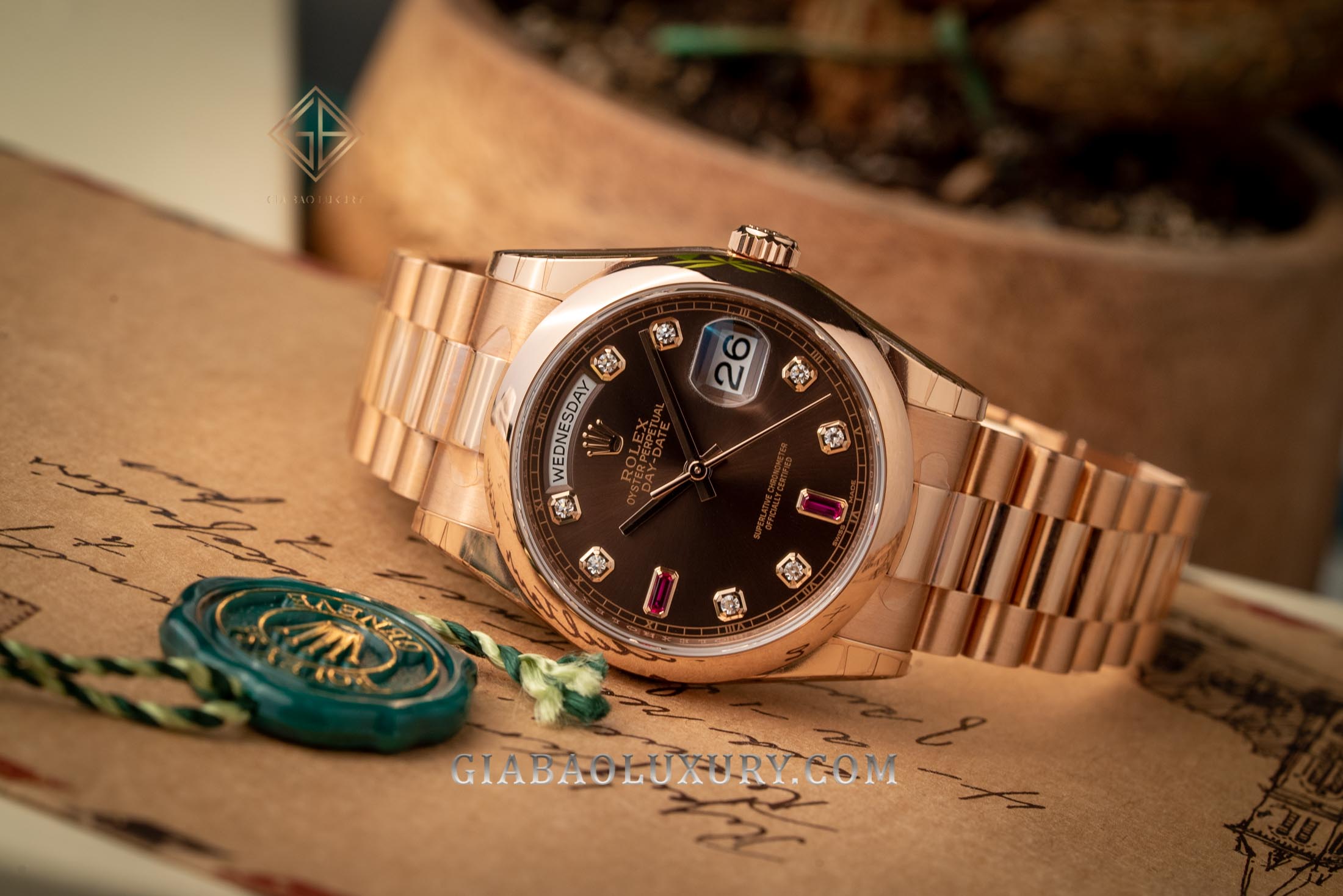 Giới thiệu đồng hồ Rolex Day-Date 36 118205 Mặt Số Chocolate Nạm Đá Ruby Đỏ