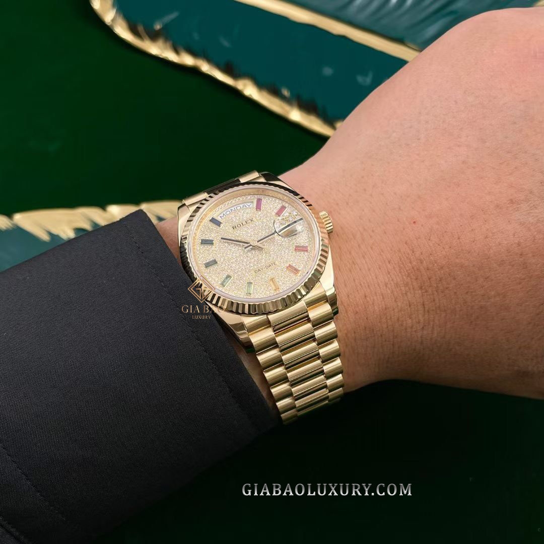 Xuất hiện trong lớp vỏ vàng vàng 18k, mặt số nạm kim cương và bộ cọc số từ đá quý nhiều màu tạo thành lớp cầu vồng cực kỳ bắt mắt, chiếc Rolex Day-Date 36 128238-0051 gây ấn tượng ngay từ ánh nhìn đầu tiên. Với những quý khách yêu thích sự óng ánh và quý tộc từ chất liệu vàng của Rolex thì chiếc Rolex Day-Date 36 128238-0051 là sự lựa chọn không thể phù hợp hơn.