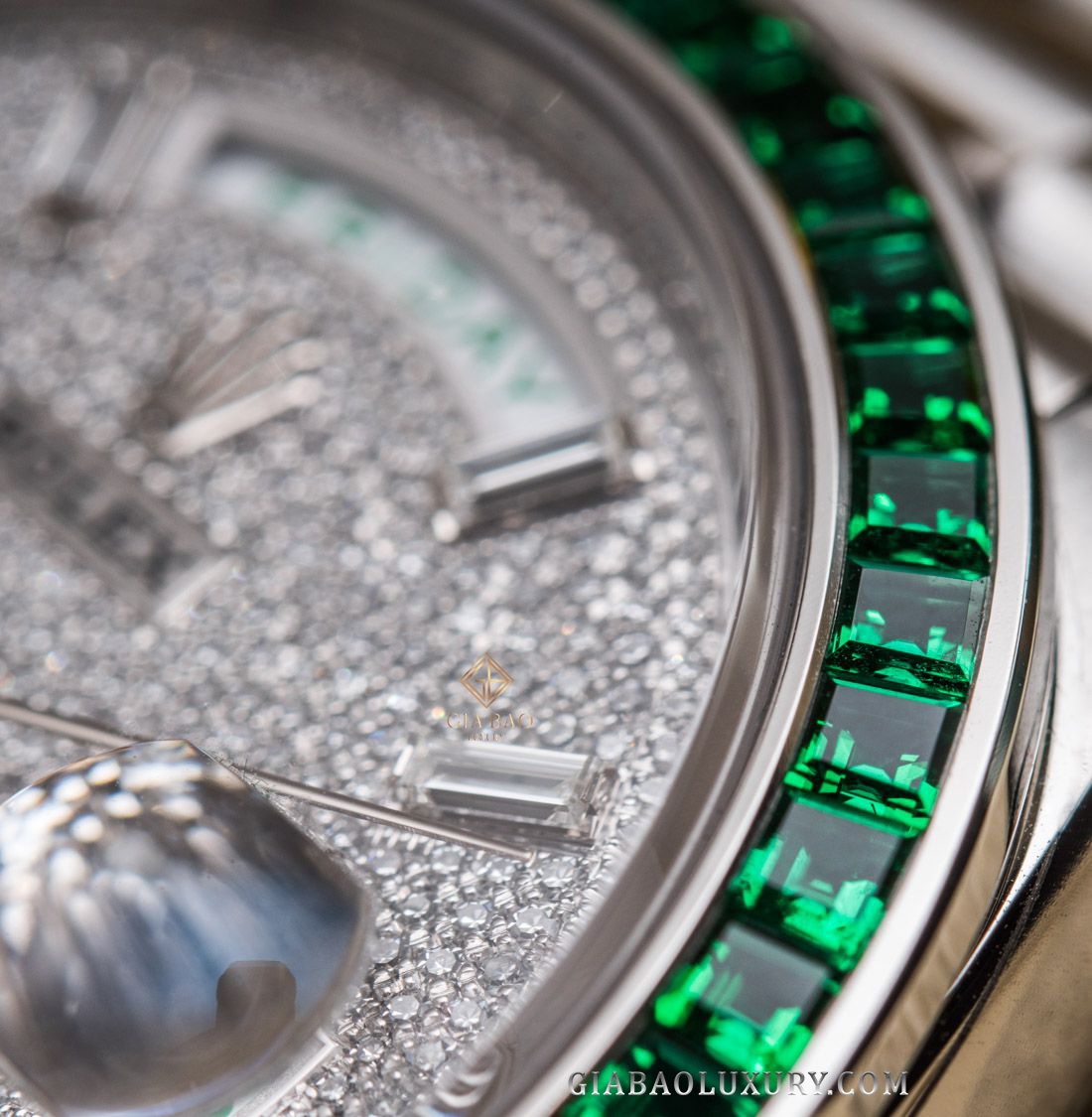 Ngoài ra, những viên kim cương tấm vô cùng vô cùng sáng và đều được khảm kín mặt số, các vị trí cọc số còn lại được nhà sản xuất sử dụng kim cương Baguette. Thông qua hình ảnh chúng ta có thể thêm một lần khẳng định thương hiệu Rolex đã không làm đồng hồ đá quý thì thôi, nhưng đã làm thì cả Thế Giới phải khát khao vô cùng. Cũng như tôi nói ở trên, bởi khâu đầu vào của nguồn đá tự nhiên là rất khan hiếm, hơn thế nữa đá Emerald có màu xanh tinh khiết của Ngọc lục bảo lại là loại đá đắt nhất, được ưa chuộng nhất trên thị trường châu Á và Trung Đông đã khiến chiếc đồng hồ đã hiếm lại càng hiếm.