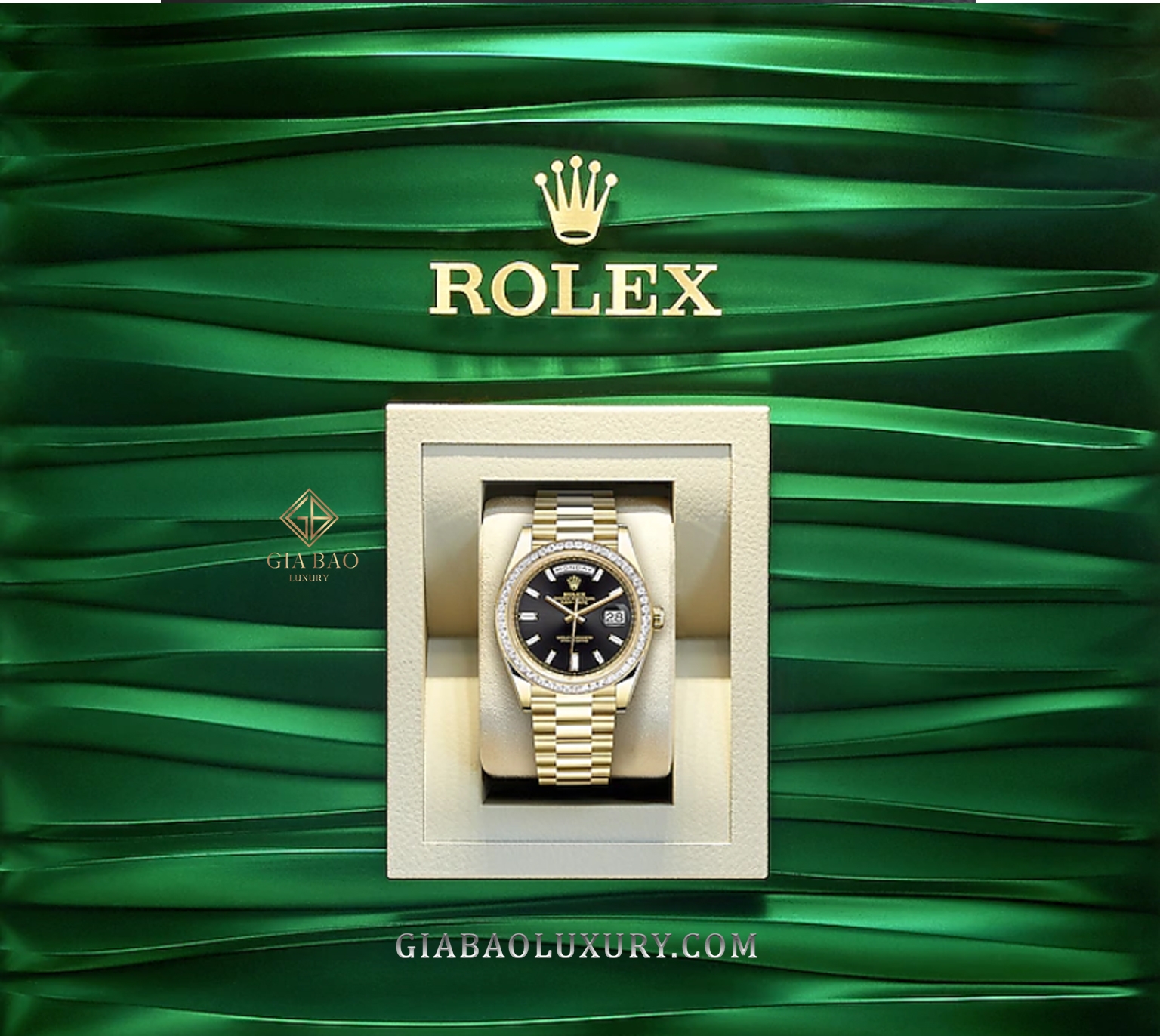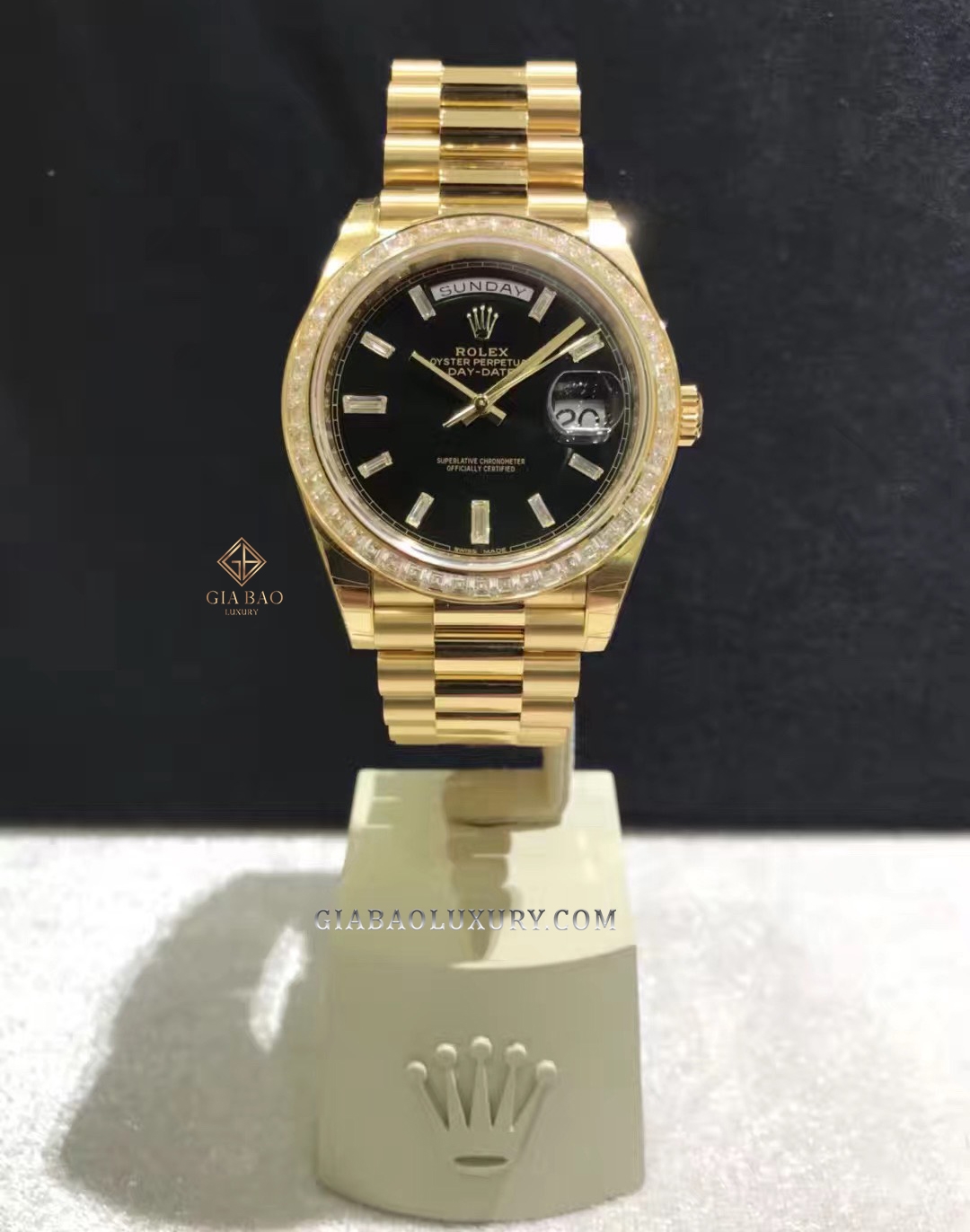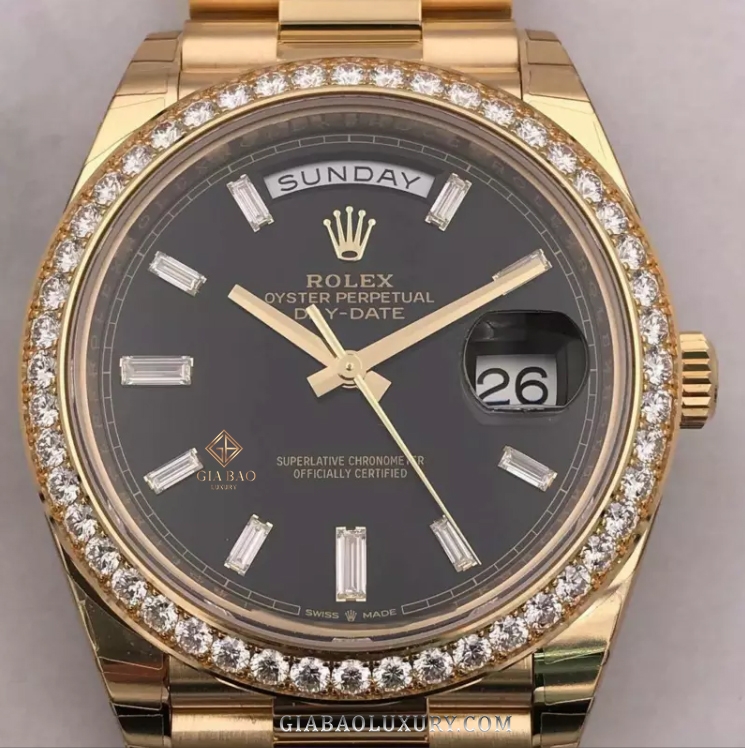 Kết hợp cùng với chất liệu xa xỉ – “Vàng” chính là những kim cương lấp lánh. Mẫu đồng hồ Rolex Day-date 40 mm model 2019 mang mã hiệu 228398tbr-0001 chính là minh chứng cho những gì Gia Bảo Luxury đề cập ở trên. Chiếc đồng hồ này sở hữu vành bezel được nạm kín kim cương, kết hợp hoàn hảo với mặt số đen với kim cương baguette trên cọc số.