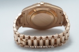 Nhắc đến Rolex Day-Date thì phải nhắc đến dây đeo President với 3 khớp nối mảnh bán tròn đại diện cho sự tinh tế và xa hoa. Thêm vào đó là núm chỉnh giờ được cải tiến theo hệ thống chống nước Twinlock giúp chiếc đồng hồ này đạt khả năng chống nước tốt lên tới 100m.