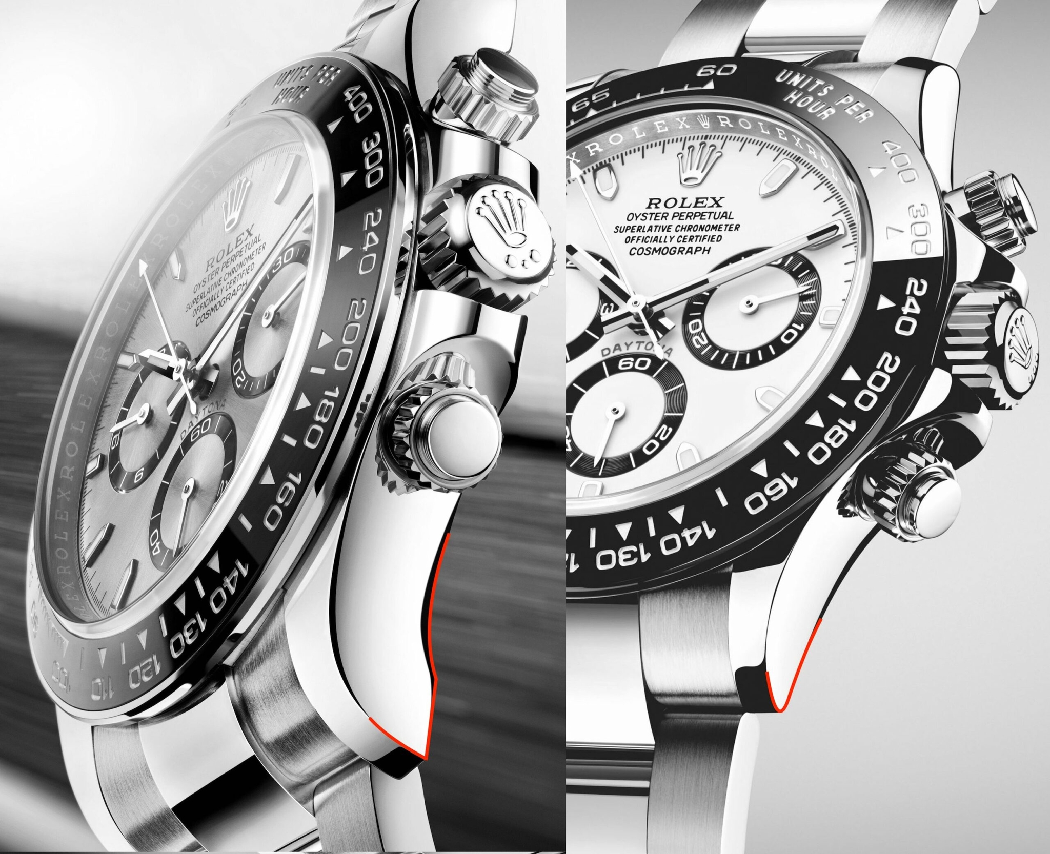 Cho đến năm 2023, các mẫu Daytona phiên bản bằng thép và hai tông màu giờ đây đều đã được trang bị càng nối dây nhọn, đóng vai trò lớn tạo ra vẻ đẹp tinh tế cho tổng thể. Ngược lại, ở những chiếc Daytona bằng vàng nguyên khối và bạch kim, phần chân đế lại được làm phẳng, tăng thêm sức nặng cũng như sự hiện diện trên cổ tay. Còn bắt đầu từ năm 2023, tất cả đồng hồ Rolex Daytona, bao gồm cả mẫu thép và hai tông màu, đều có càng nối dây phẳng, như ở hình bên trái ngay dưới đây.