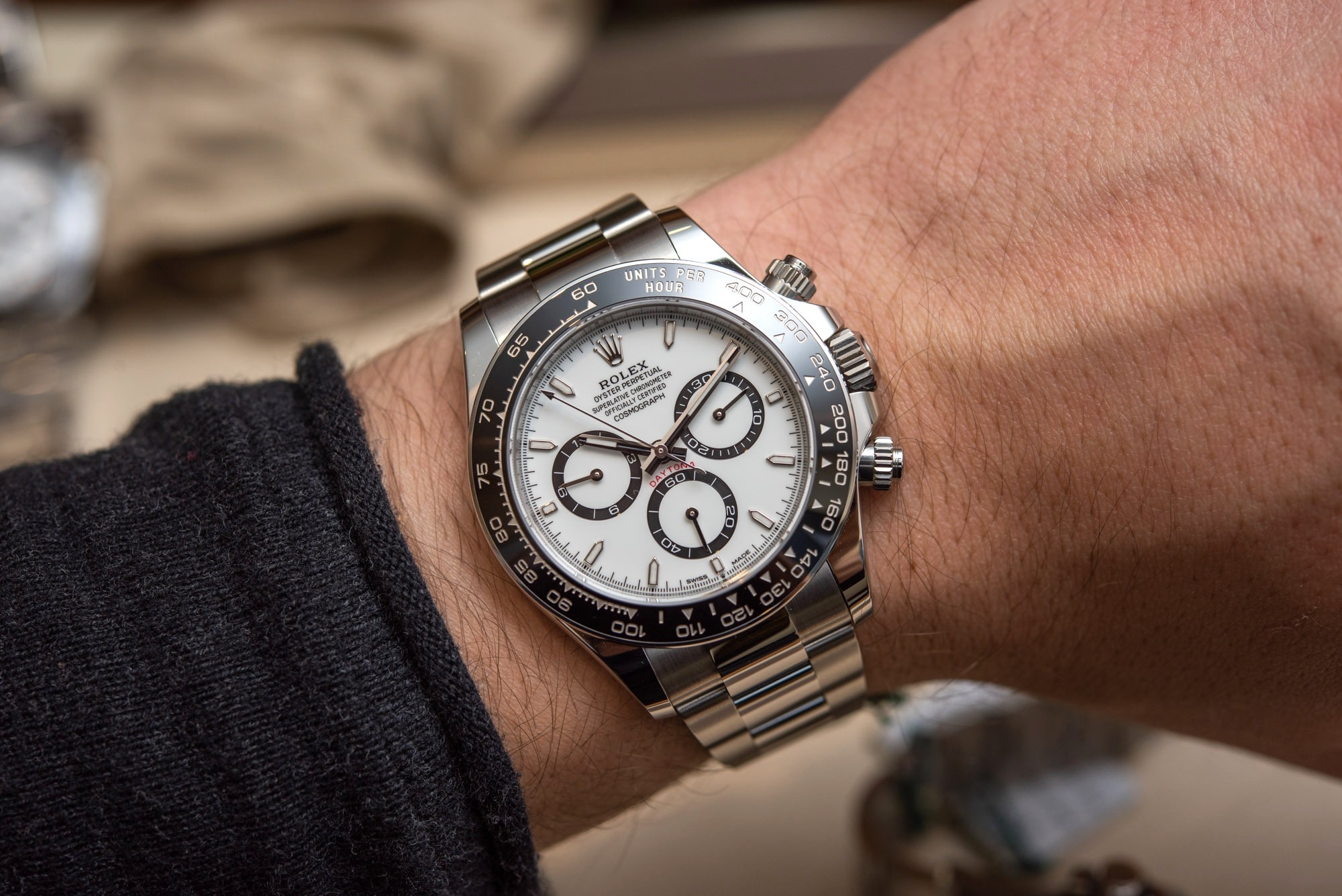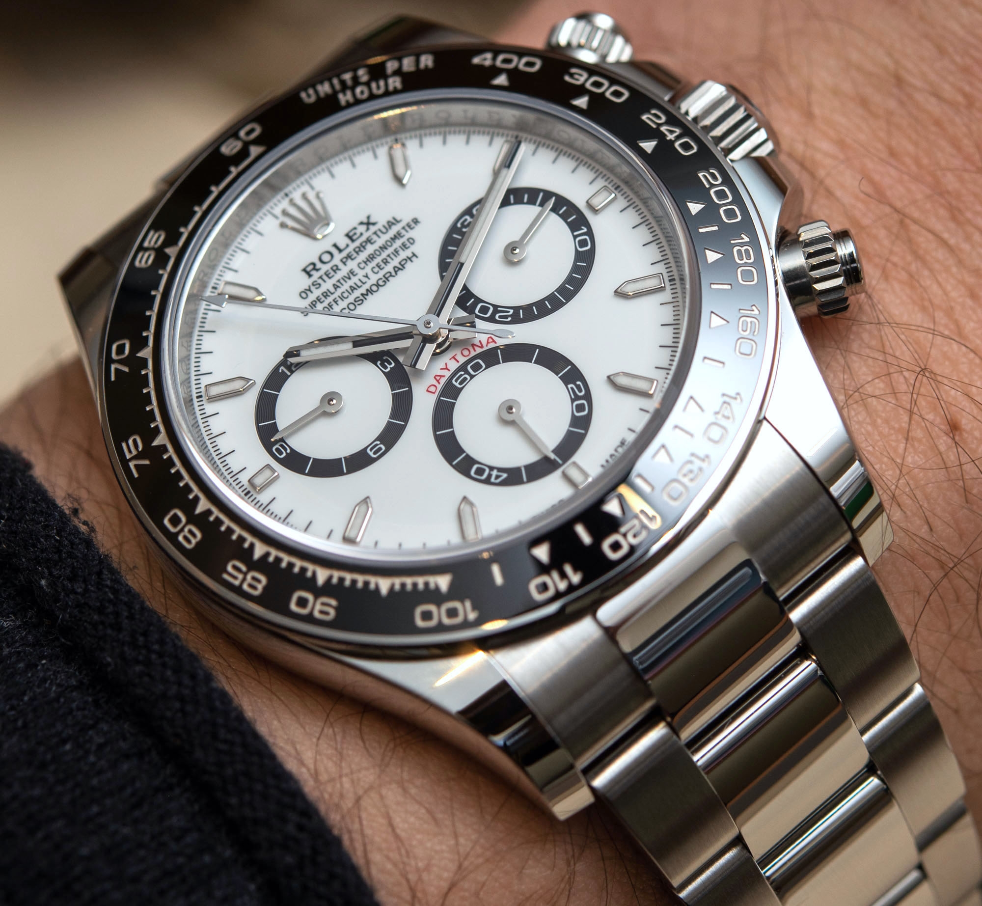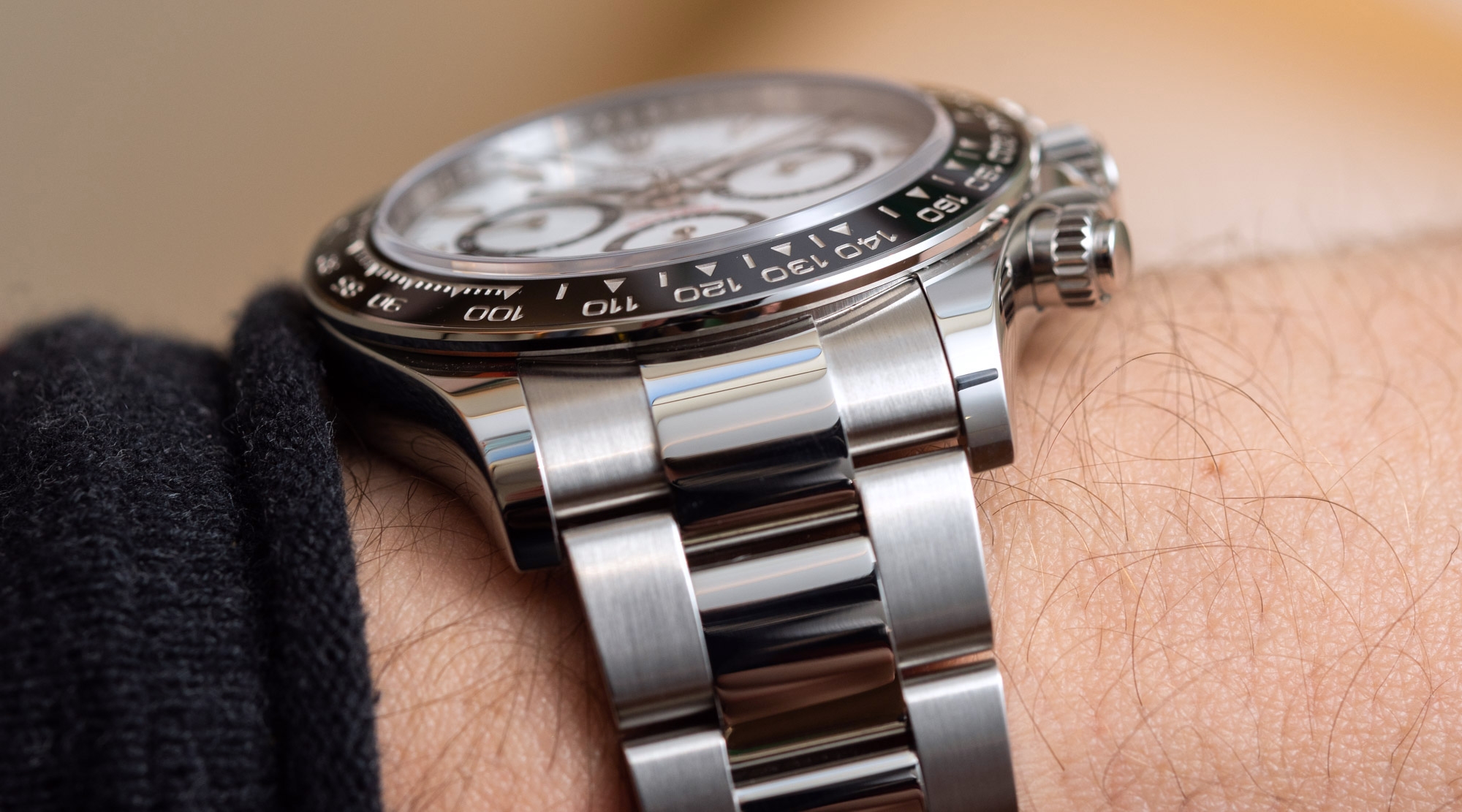 Rolex Daytona 2023 cũng rộng hơn, chiếm nhiều không gian trên cổ tay hơn đáng kể so với phiên bản tiền nhiệm. Rolex, vì bất cứ lý do gì, thích đơn giản hóa mọi thứ quá mức và tiếp tục gọi Daytona là chiếc đồng hồ 40mm. Cái sự “rộng” hơn nhờ vào phần càng nối dây, cũng như cả phần đường kính. Khoảng chéo từ góc 2h đến 8h của chiếc 116500LN đã ngừng sản xuất chỉ là 38,88mm (không tính nút bấm), trong khi ở chiếc 126500LN mới rộng hơn chính xác là 1mm, giữ mức 39,88mm. Điều thú vị là phần mặt số vẫn giữ nguyên kích thước, điều khiến nhiều người vẫn nghĩ không có thay đổi gì ở đây.