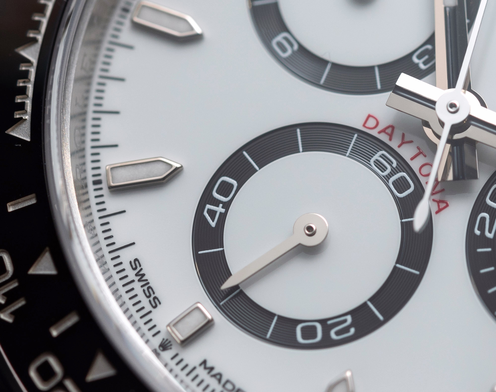 Sau khi lặng lẽ tăng kích thước vỏ, mặt số phải tuân theo để giữ nguyên tỷ lệ. Mặt số Daytona mới có khung viền của mặt số phụ mỏng hơn đáng kể. Một đặc điểm bí mật khác của Daytona, các mặt số phụ ở vị trí 3 và 9 giờ được đặt cao hơn một chút tất nhiên dòng chữ Daytona màu đỏ phía trên vị trí 6 giờ vẫn ở lại.