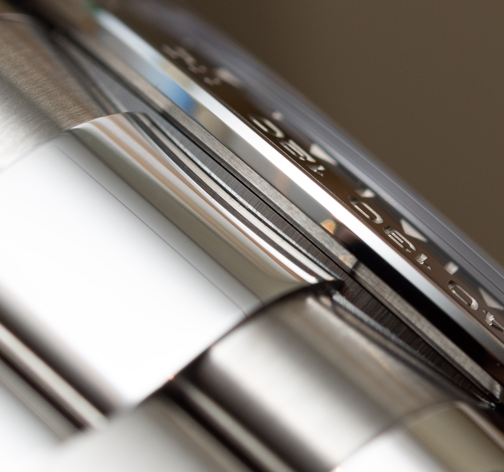 Nằm trong bộ sưu tập Daytona mới nhất năm nay, model bằng thép mang mã hiệu 126500LN là phiên bản kế nhiệm của mẫu 116500LN “hot hit" ngoài thị trường xám. Nếu xem xét kỹ, bạn sẽ thấy điều này, trên phiên bản thép, bao gồm cả chiếc Daytona two-tone (vỏ thép, viền vàng), vỏ cũng không hoàn toàn đối xứng. Lí do ở đây: phần càng bên trái được thiết kế rộng hơn so với bên phải để bù lại phần “trọng lượng” của các nút bấm chronograph, núm vặn và hai tai bảo vệ vốn nằm bên phải của đồng hồ. Có lẽ điều này thật khó tự mình nhận ra nếu như không có một ai chỉ ra cho bạn. Nhưng nếu đã biết rồi, bạn sẽ có quên được.