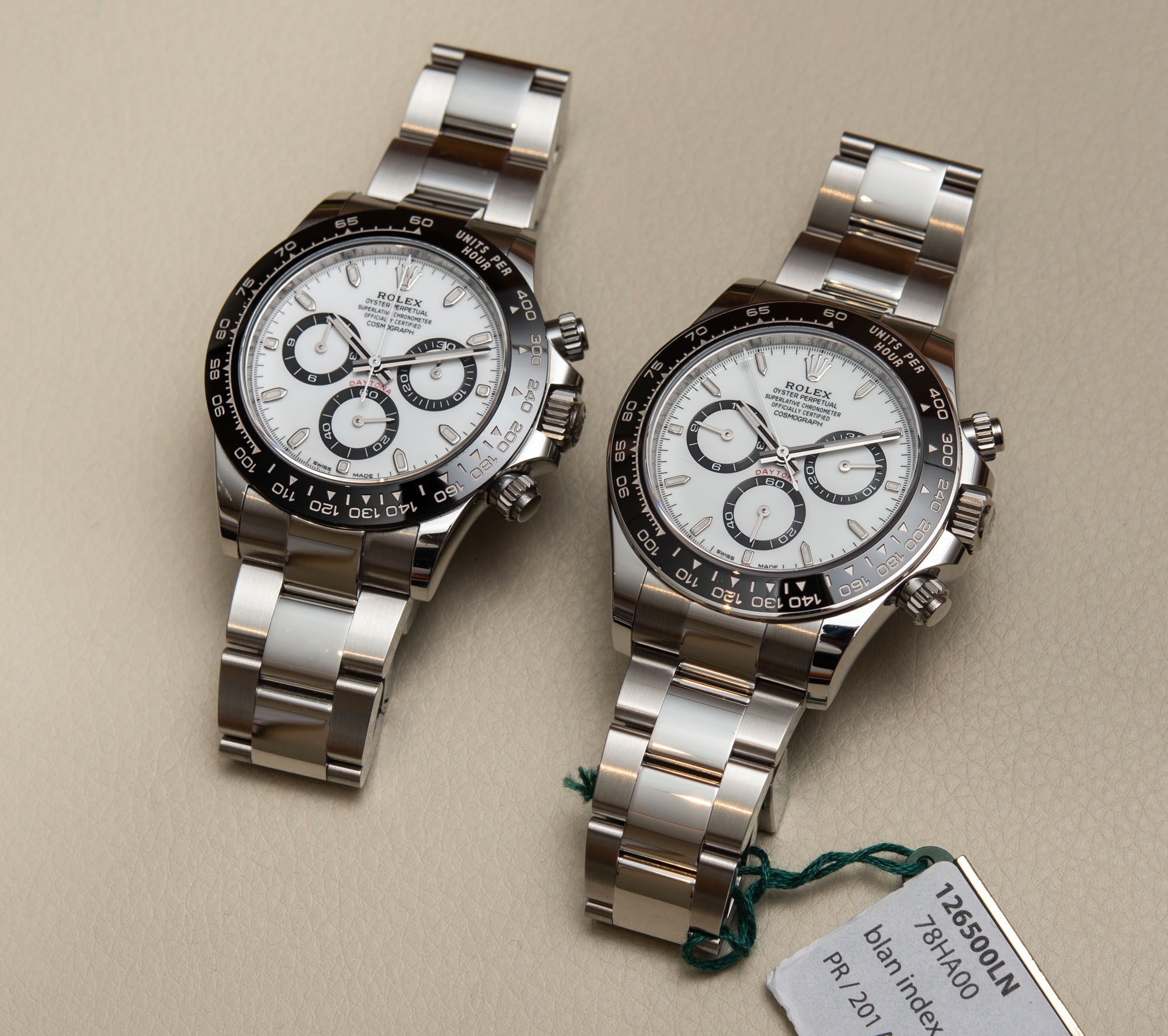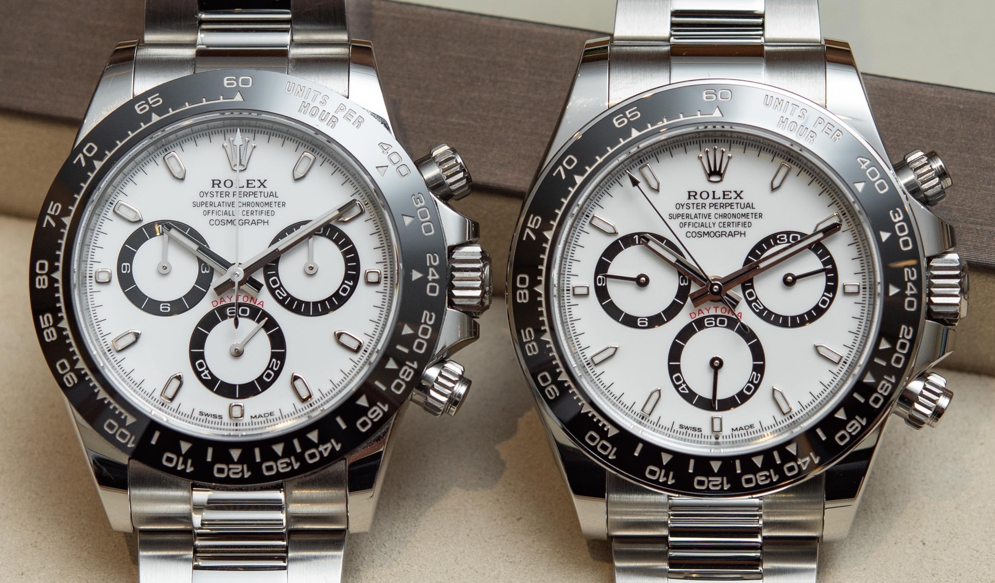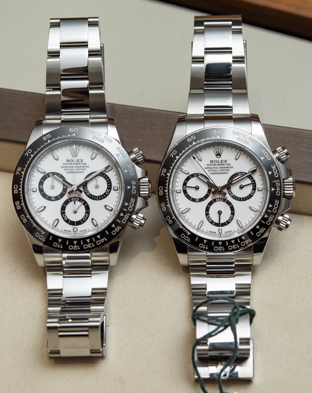 Cùng một cổ tay, Daytona: Chiếc mới (phía dưới) có cảm giác, hình dáng và kích thước lớn hơn, thật lạ với công bố từ hãng là cả hai đều là “40mm”.