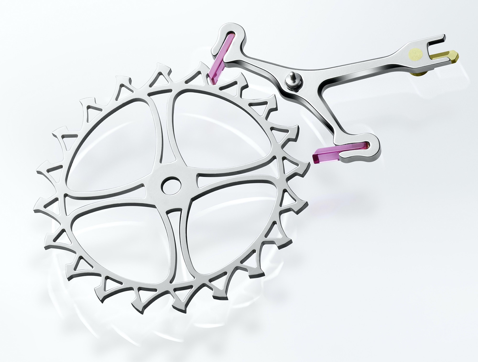 Tiếp đến, vòng tròn màu xanh lá cây là bộ giảm xóc Paraflex, một bản nâng cấp tiềm năng từ bộ giảm xóc KIF trên 4130. Ẩn trong lòng bộ máy và được khoanh tròn màu tím là bộ thoát Chronergy, bộ thoát hiệu quả cao của Rolex.