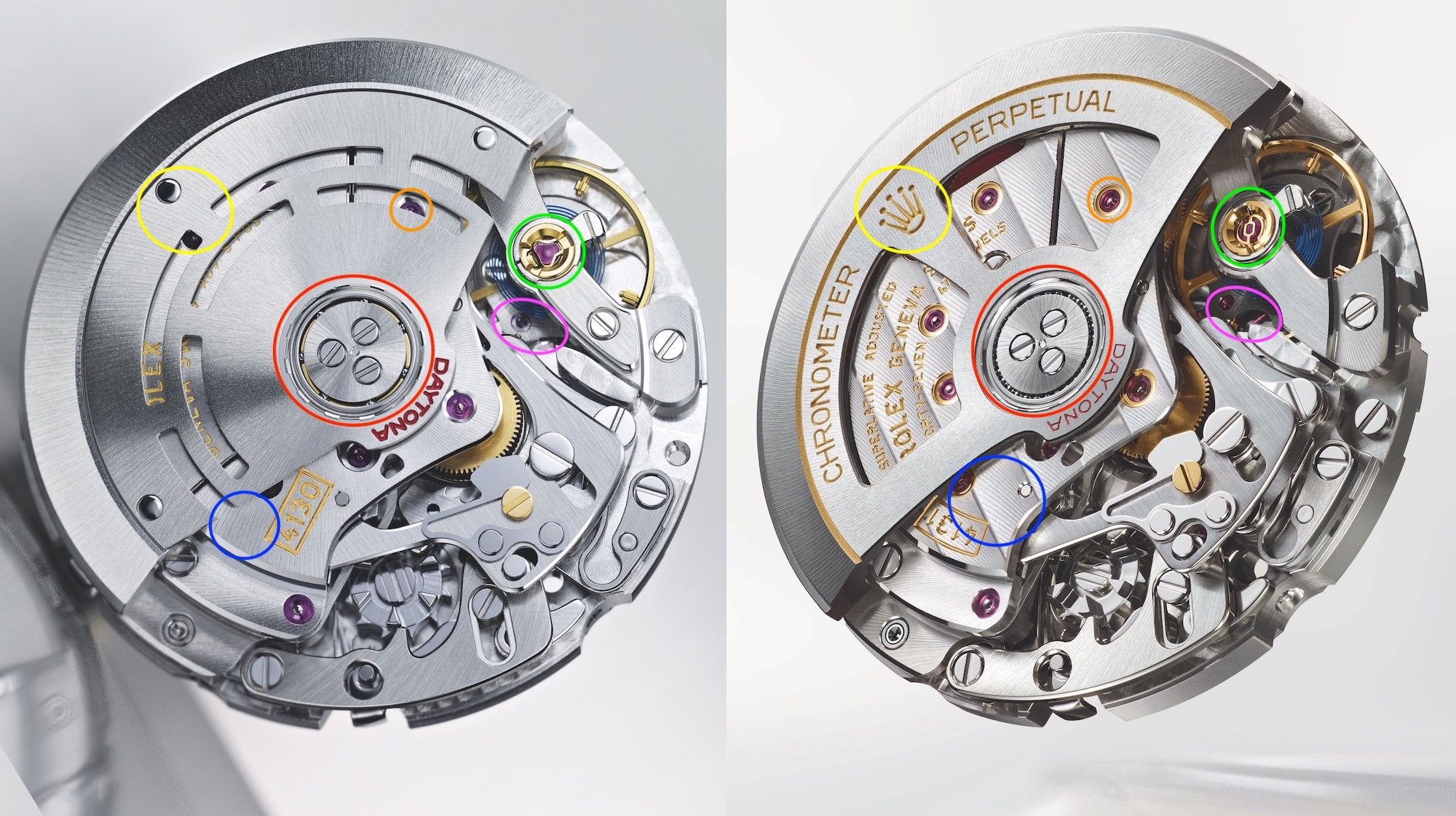 Những thay đổi còn lại tập trung vào tính thẩm mỹ của bộ máy: Caliber 4131 mới có sọc Rolex Côtes de Genève (được đánh dấu màu xanh lam), một cải tiến đáng kể so với lớp hoàn thiện đường cong trên 4130. Rolex đã tạo ra các sọc Geneva của riêng mình bằng cách thêm một rãnh được đánh bóng giữa các sọc. Cuối cùng, chân kính hiện có một chaton vàng (màu cam) và rôto được thiết kế mở để lộ nhiều chi tiết về bộ máy hơn cũng như có thêm logo Rolex cùng dòng chữ Chronometer Perpetual (được đánh dấu màu vàng).