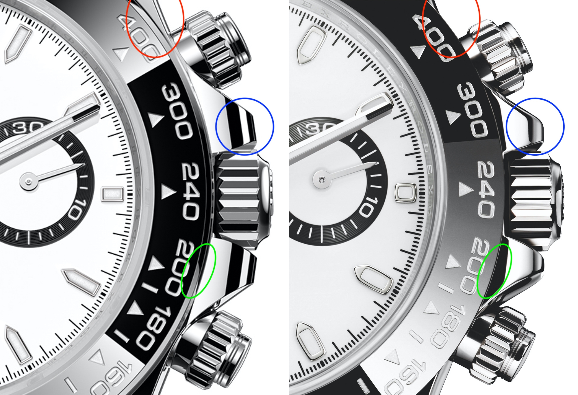 Sự so sánh này cũng kéo theo một số thay đổi đáng chú ý khác trên Rolex Daytona 2023 bằng thép. Phần tai bảo vệ núm vặn nhọn ứng với phần càng nối dây nhọn trên các model trước cũng không còn đó. Thay vào đó, diện tích phẳng đã được tăng lên (chú ý đến phần khoanh tròn màu xanh lam). Nhìn kỹ hơn vào các nút bấm phía trên sẽ thấy rõ hơn và thực sự rộng hơn vỏ trên Rolex Daytona 126500LN mới (khoanh đỏ). Cuối cùng, được khoanh tròn màu xanh lá cây là khung kim loại xung quanh đã được đề cập ở phía trên.