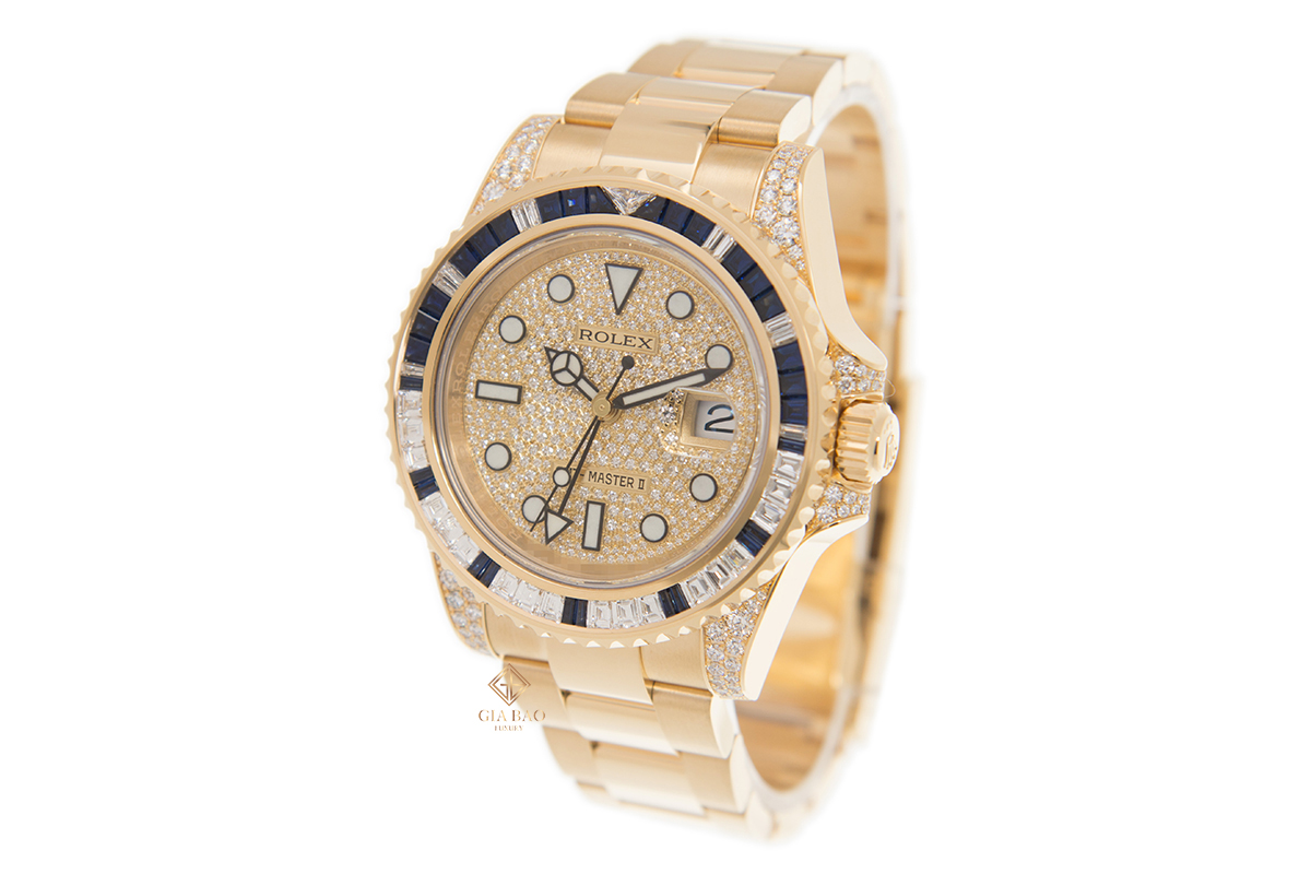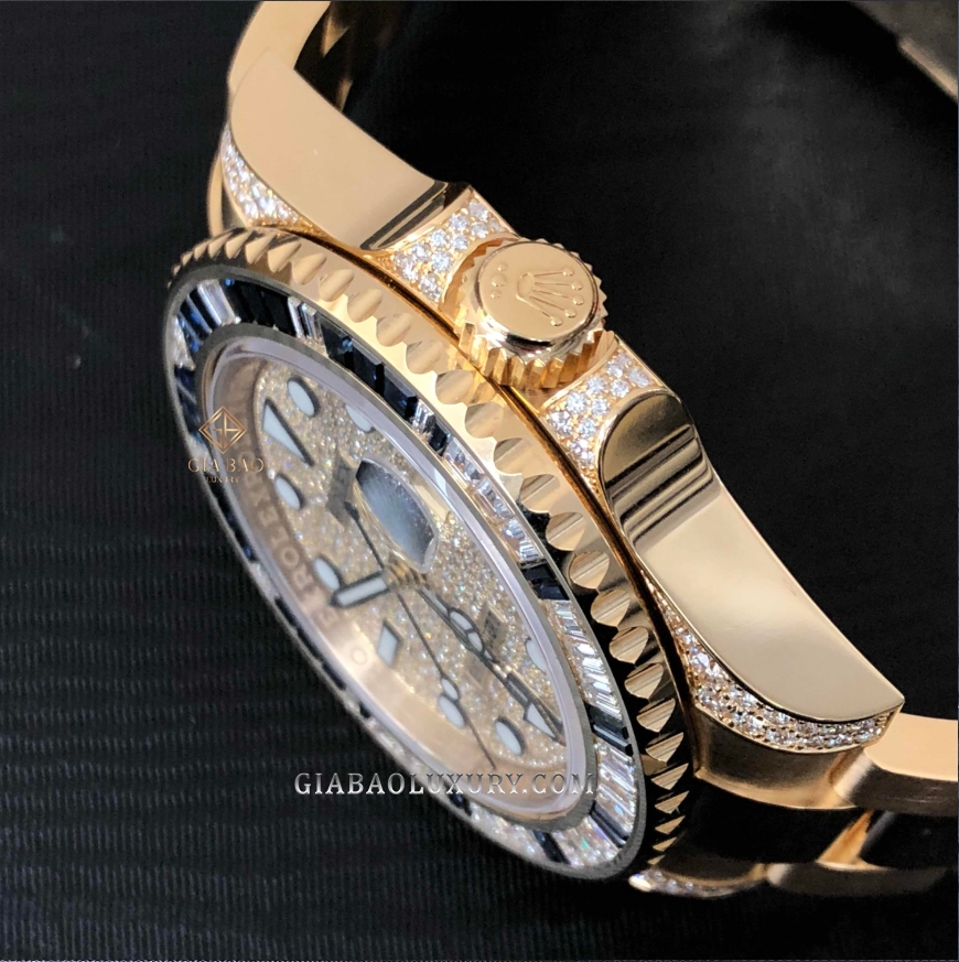 Chỉ cần đeo một chiếc đồng hồ vàng khối trên tay, bạn đã thu hút được sự chú ý của rất nhiều người. Tuy nhiên, điều đó là chưa đủ với Rolex. Bộ vỏ của chiếc GMT-Master II 116758SA còn được nạm kim cương dọc theo phần tai càng, và cả ở phần bảo vệ núm chỉnh giờ.