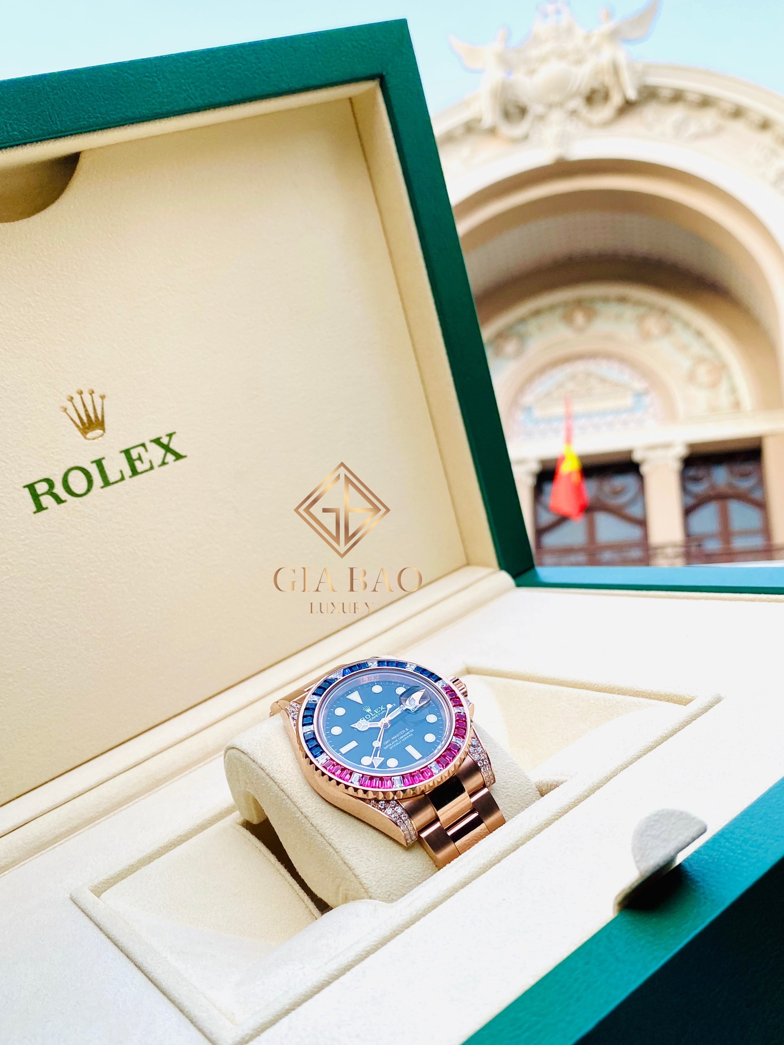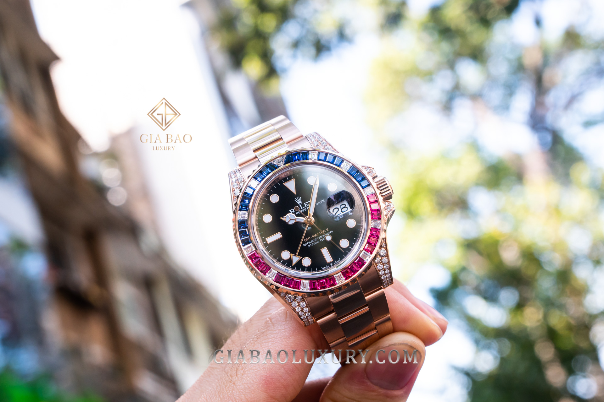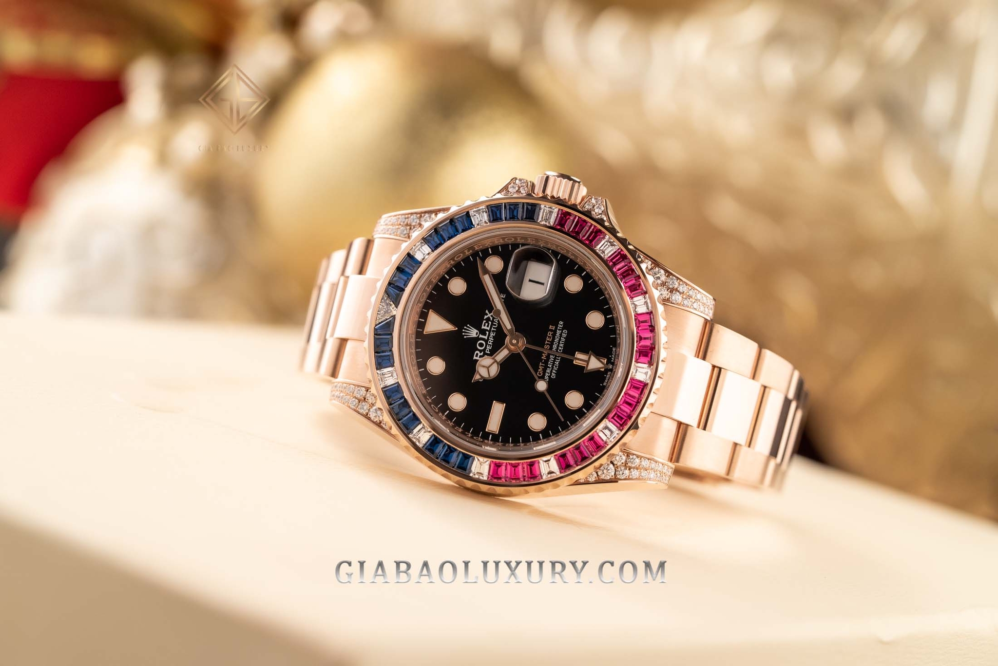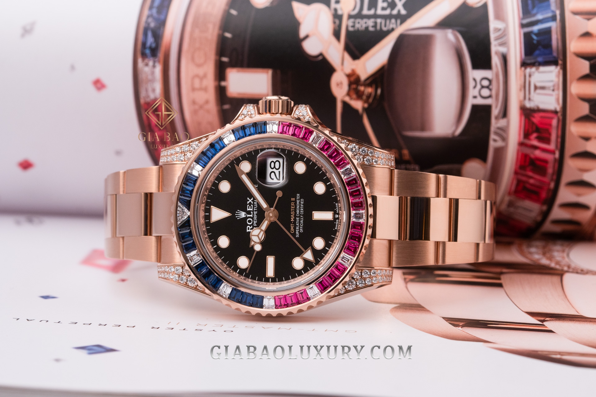 Hôm nay, Gia Bảo Luxury rất hân hạnh được giới thiệu đến quý khách hàng chiếc đồng hồ Rolex GMT-Master II mang mã hiệu 126755 SARU với bộ khung vỏ vàng hồng và vành bezel “Pepsi” nạm đá quý sang trọng.