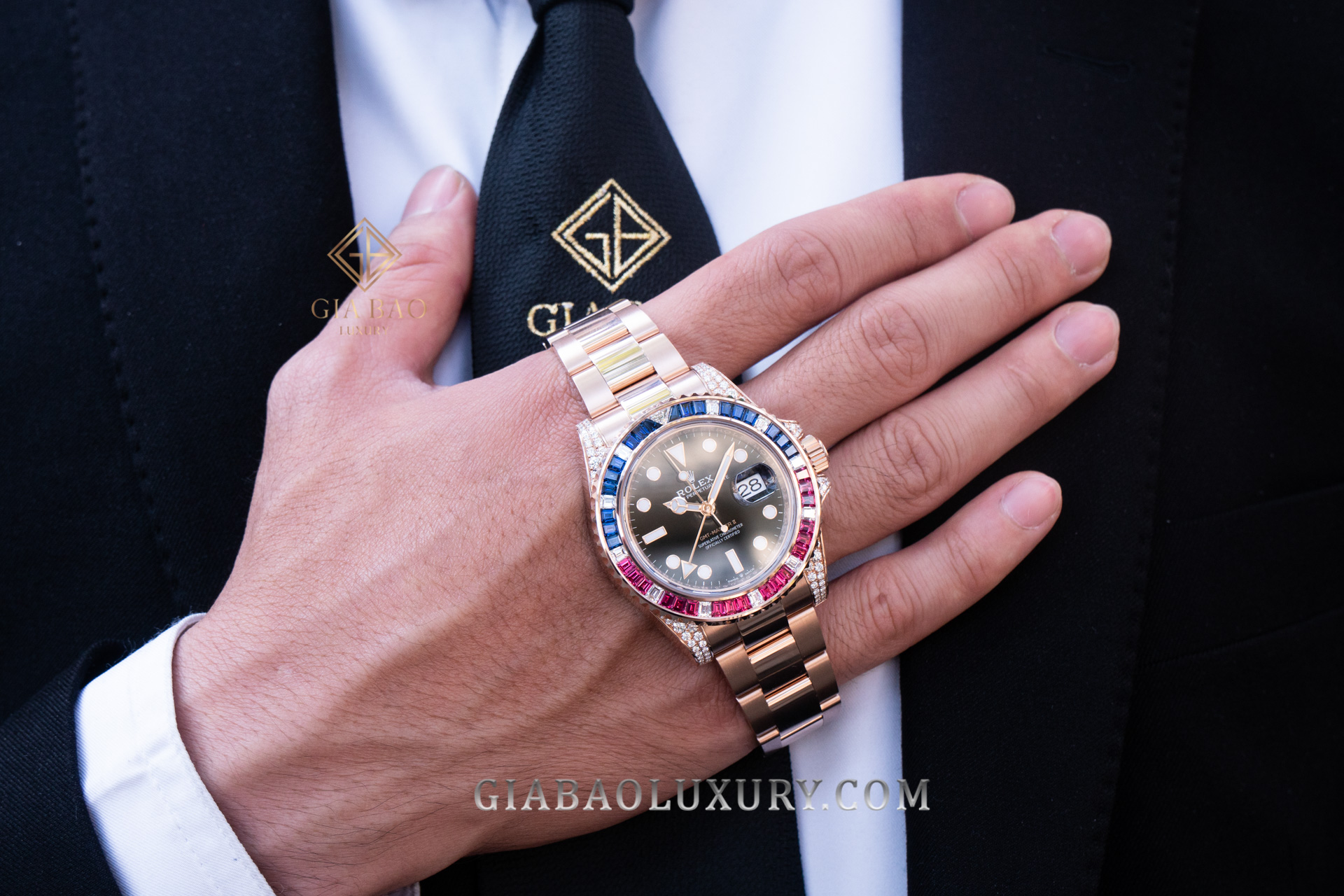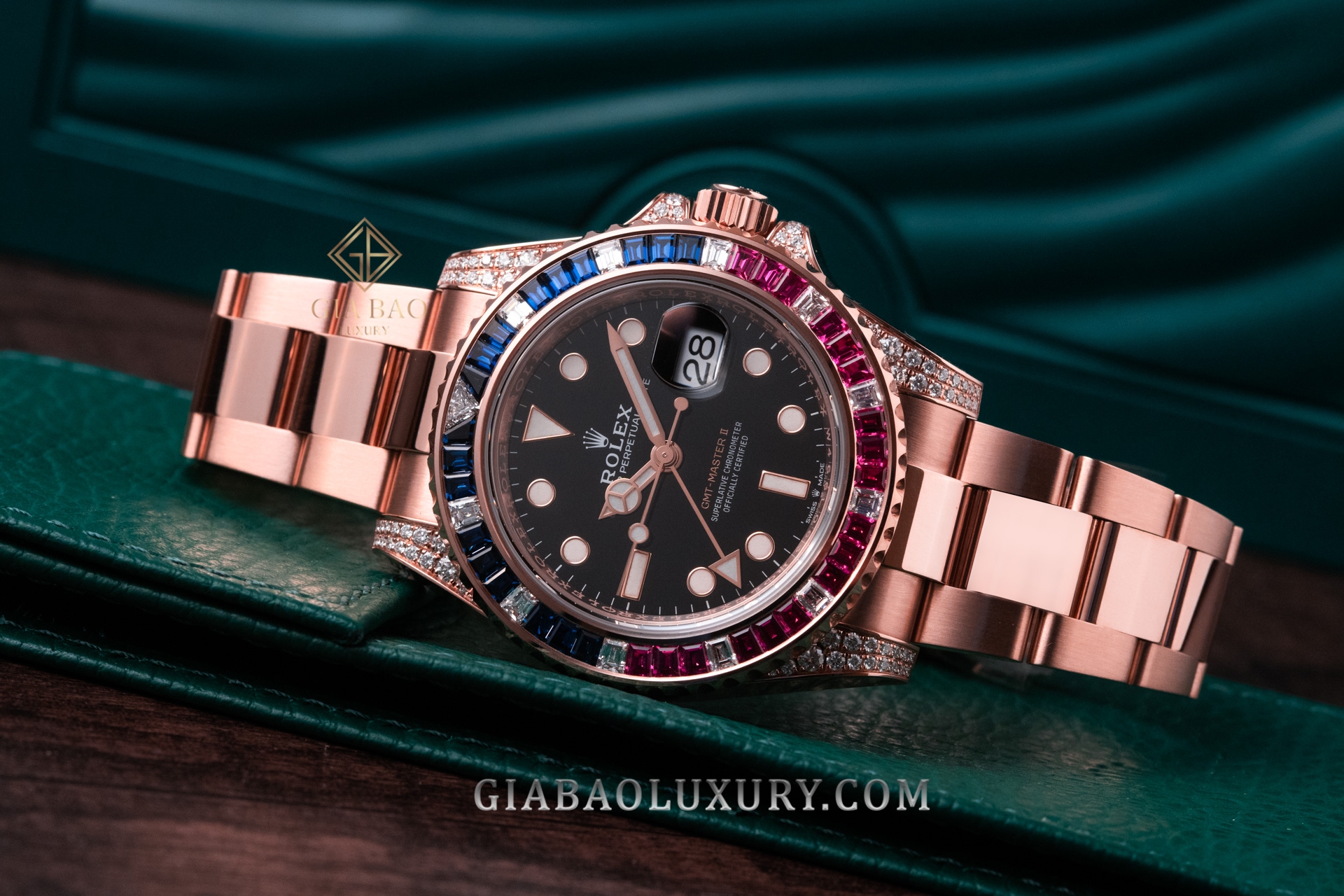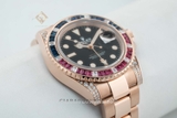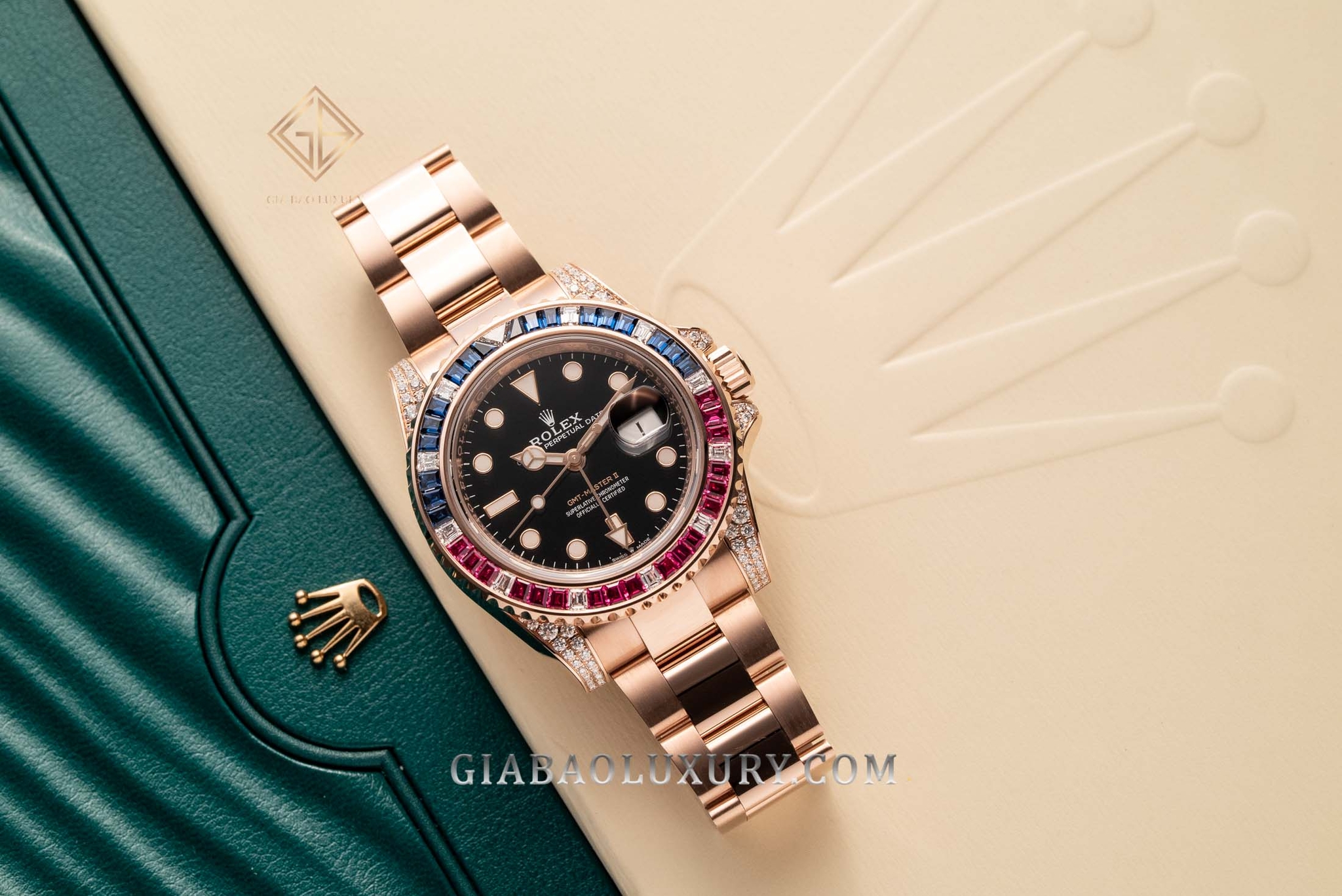 Hôm nay, Gia Bảo Luxury rất hân hạnh được giới thiệu đến quý khách hàng chiếc đồng hồ Rolex GMT-Master II mang mã hiệu 126755 SARU với bộ khung vỏ vàng hồng và vành bezel “Pepsi” nạm đá quý sang trọng.