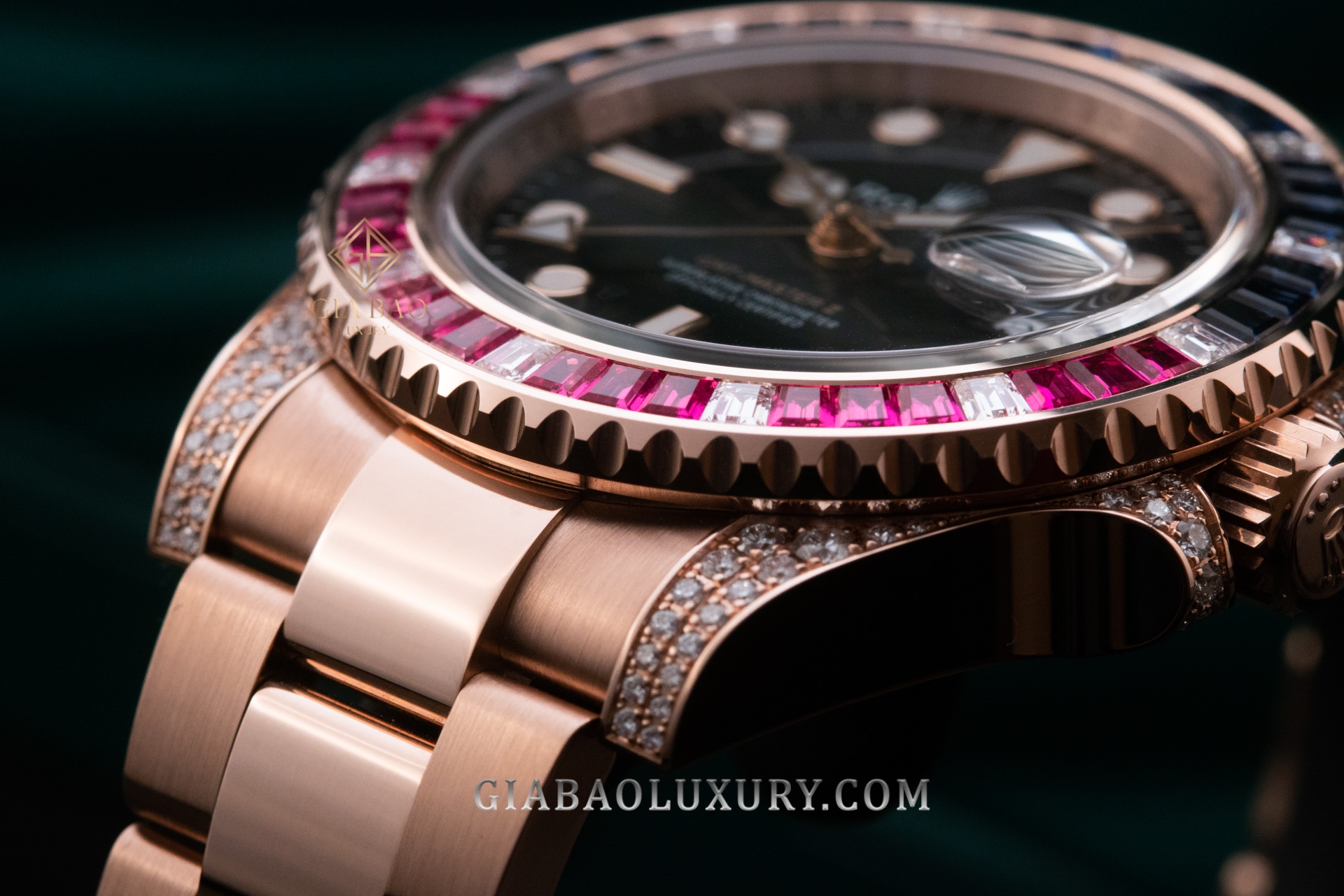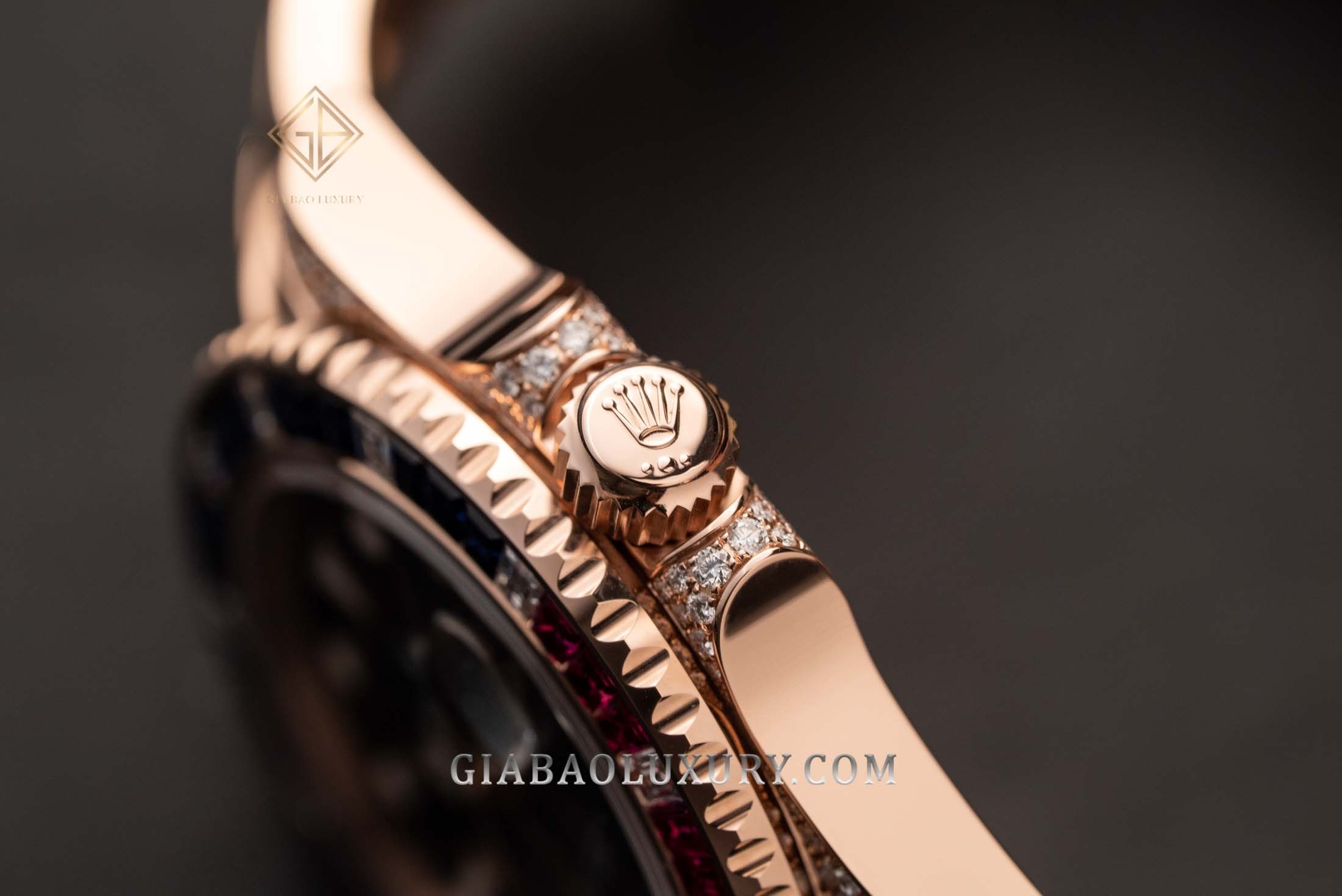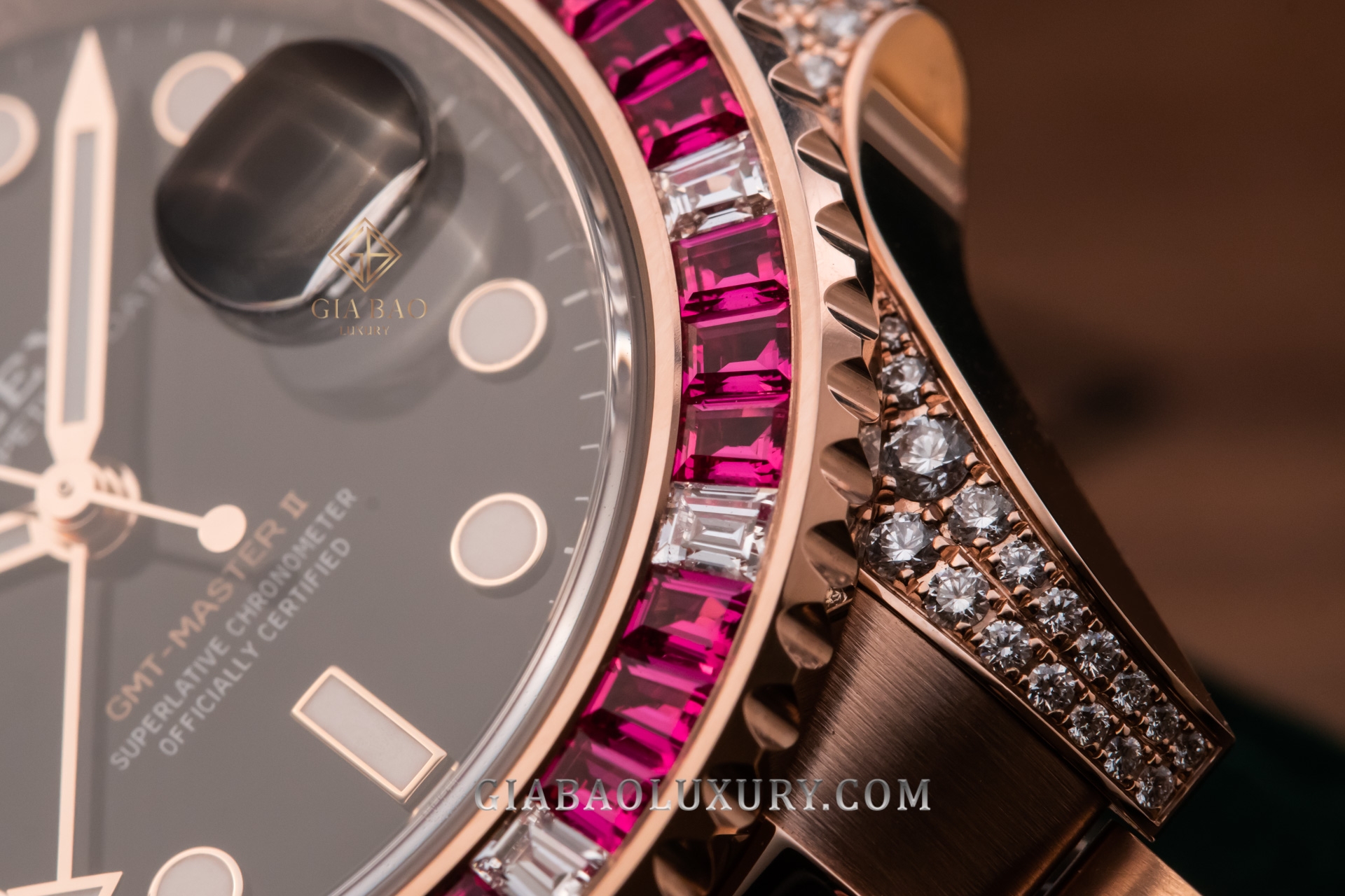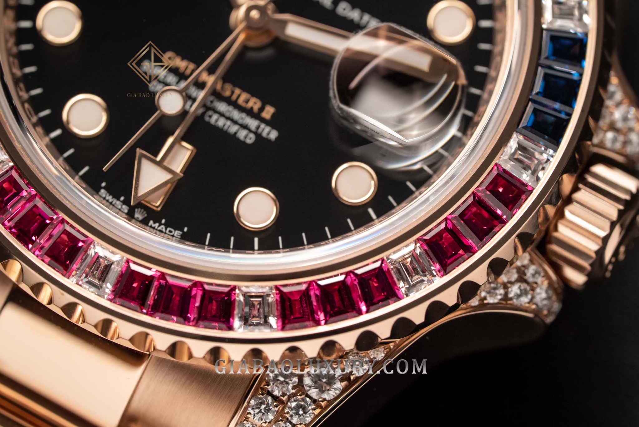 Sở hữu những thiết kế truyền thống của dòng Rolex GMT-Master II, tạo tác với vẻ đẹp thẩm mỹ nổi bật đã nhanh chóng thu hút người hâm mộ đồng hồ trên toàn thế giới. Đó là thiết kế vỏ Oyster huyền thoại bằng vàng hồng toát lên vẻ quý tộc, hiện đại, phù hợp với quan điểm thẩm mỹ của khách hàng hiện nay. Là vành bezel xoay chiều đặc trưng có lớp đệm Cerachrom chia 24 giờ được làm từ gốm Ceramic nay được thay thế bằng 48 viên đá hồng ngọc đang tỏa sắc màu khiến chiếc đồng hồ trở nên rực rỡ hơn bao giờ hết.