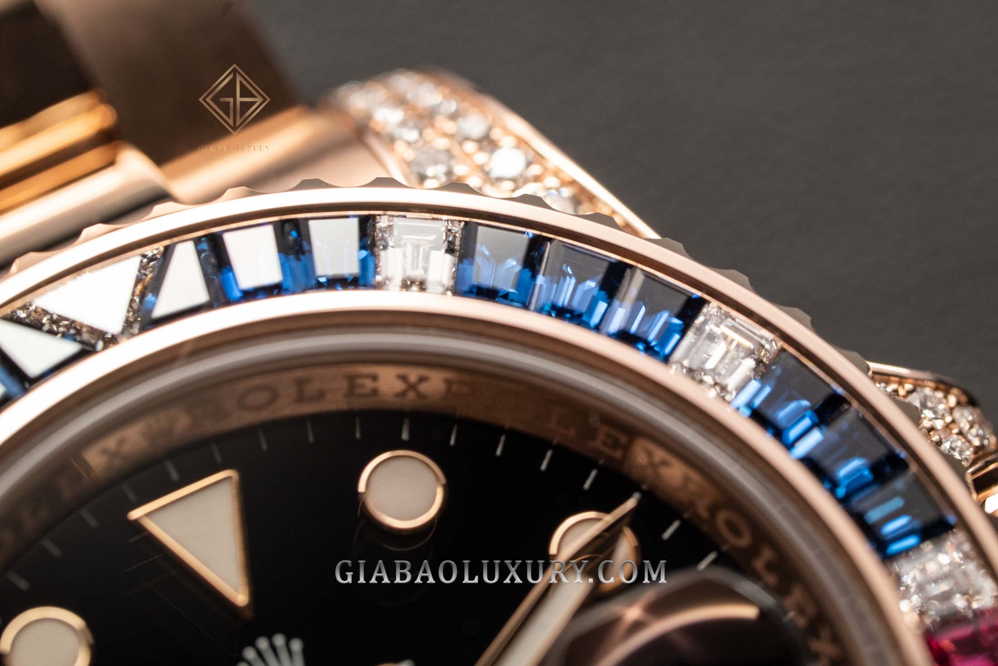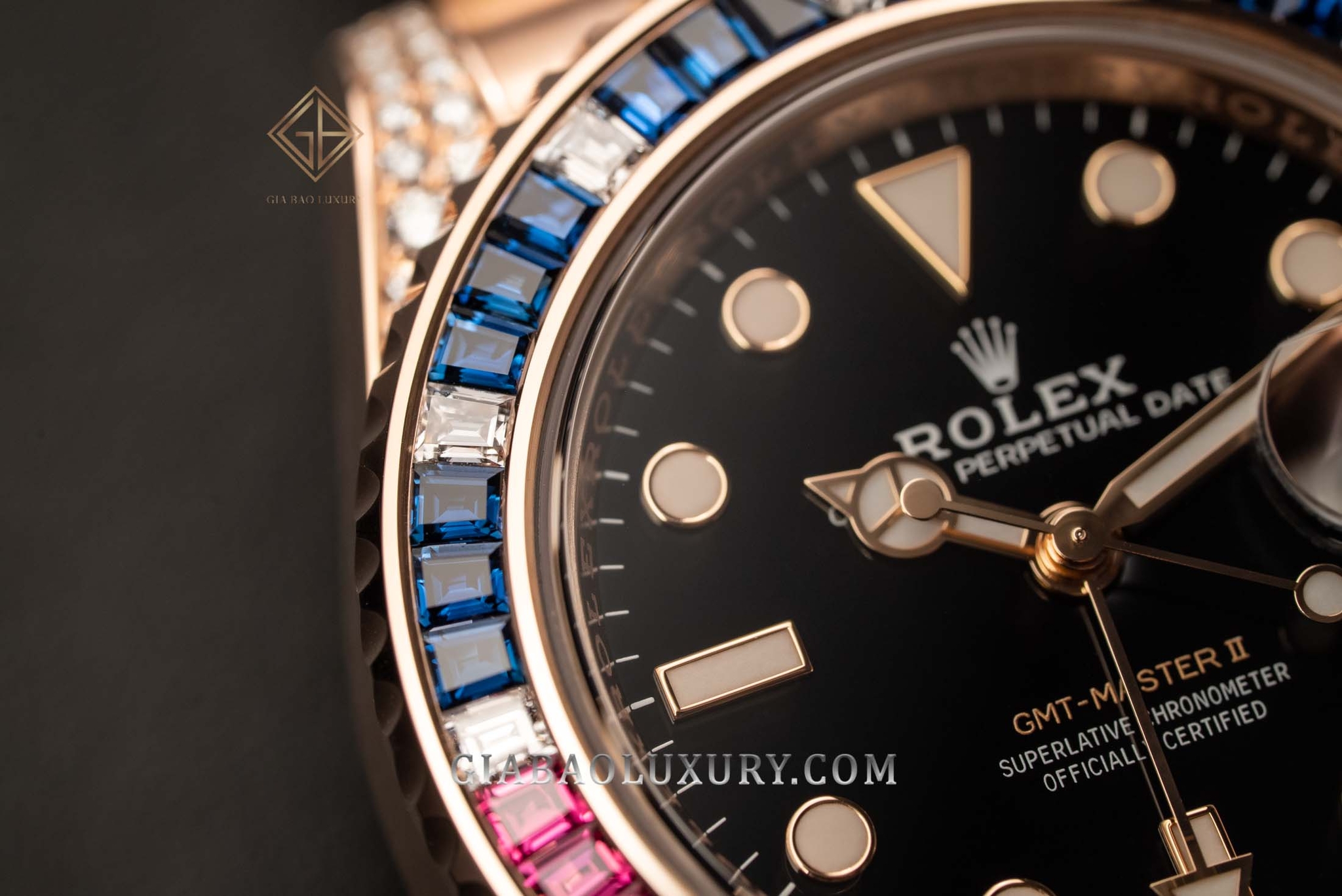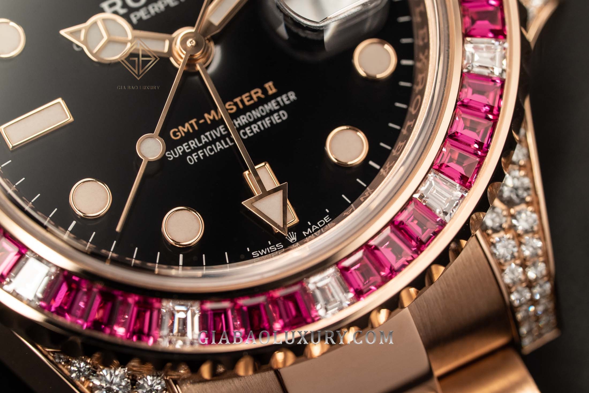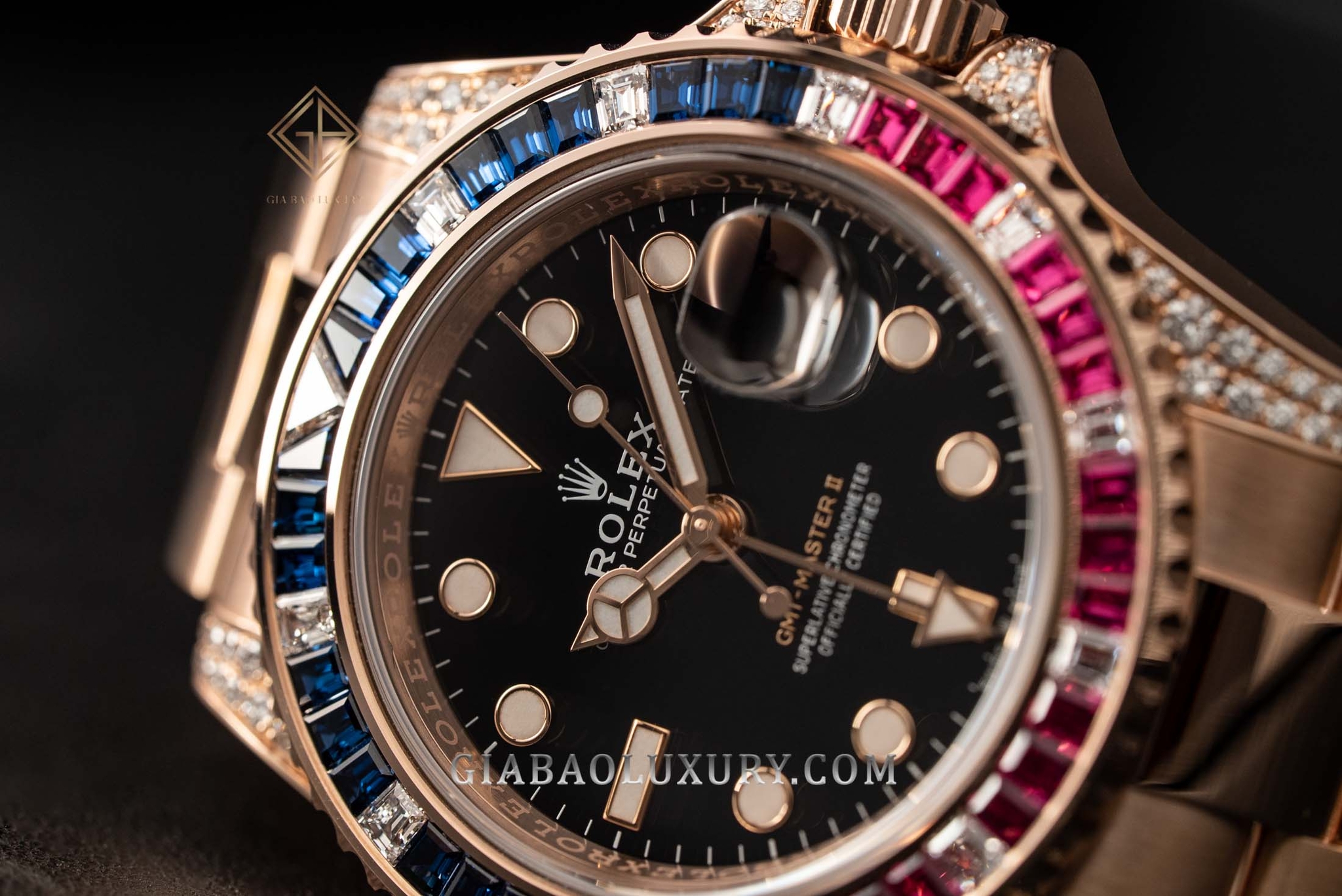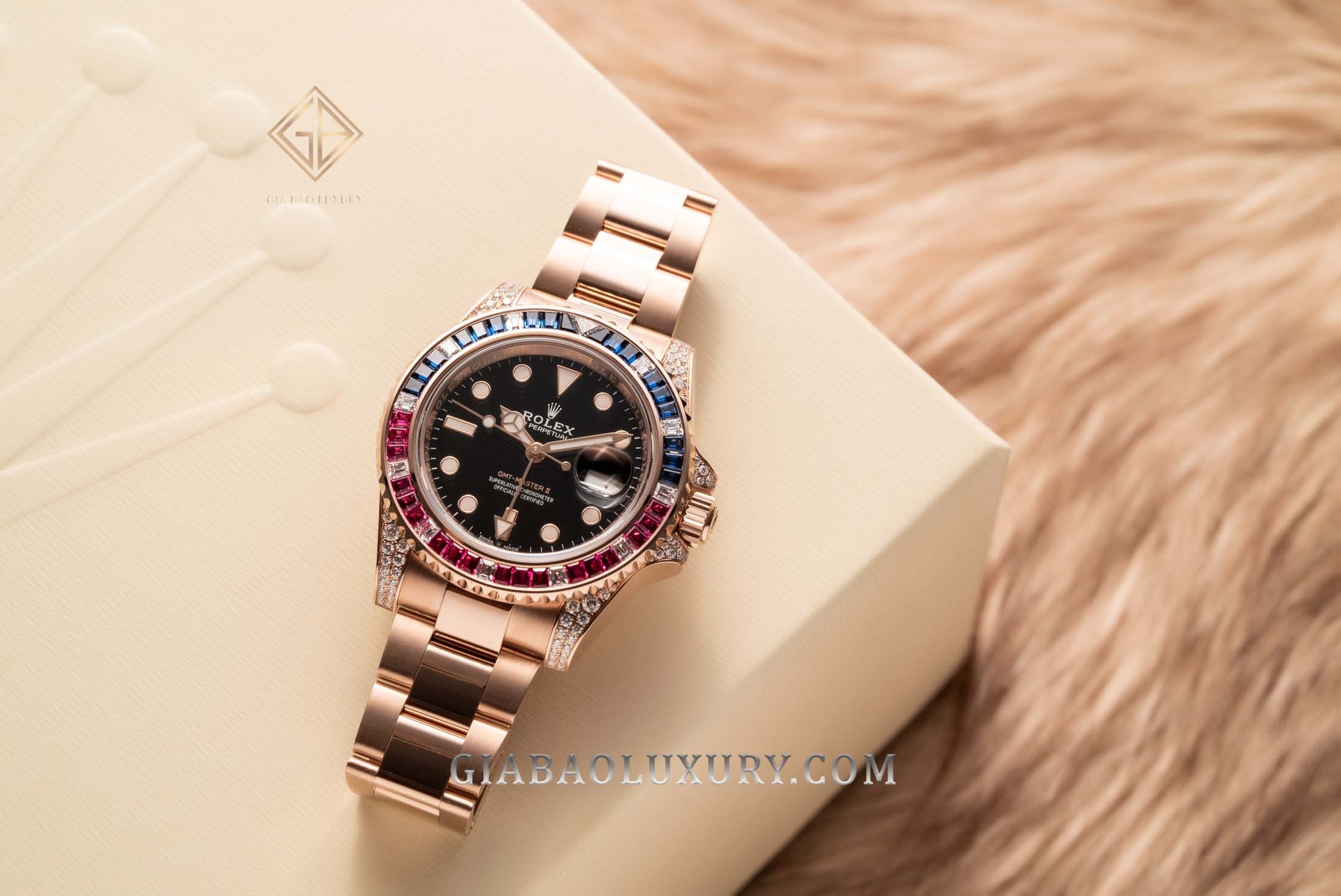 Sở hữu những thiết kế truyền thống của dòng Rolex GMT-Master II, tạo tác với vẻ đẹp thẩm mỹ nổi bật đã nhanh chóng thu hút người hâm mộ đồng hồ trên toàn thế giới. Đó là thiết kế vỏ Oyster huyền thoại bằng vàng hồng toát lên vẻ quý tộc, hiện đại, phù hợp với quan điểm thẩm mỹ của khách hàng hiện nay. Là vành bezel xoay chiều đặc trưng có lớp đệm Cerachrom chia 24 giờ được làm từ gốm Ceramic nay được thay thế bằng 48 viên đá hồng ngọc đang tỏa sắc màu khiến chiếc đồng hồ trở nên rực rỡ hơn bao giờ hết.