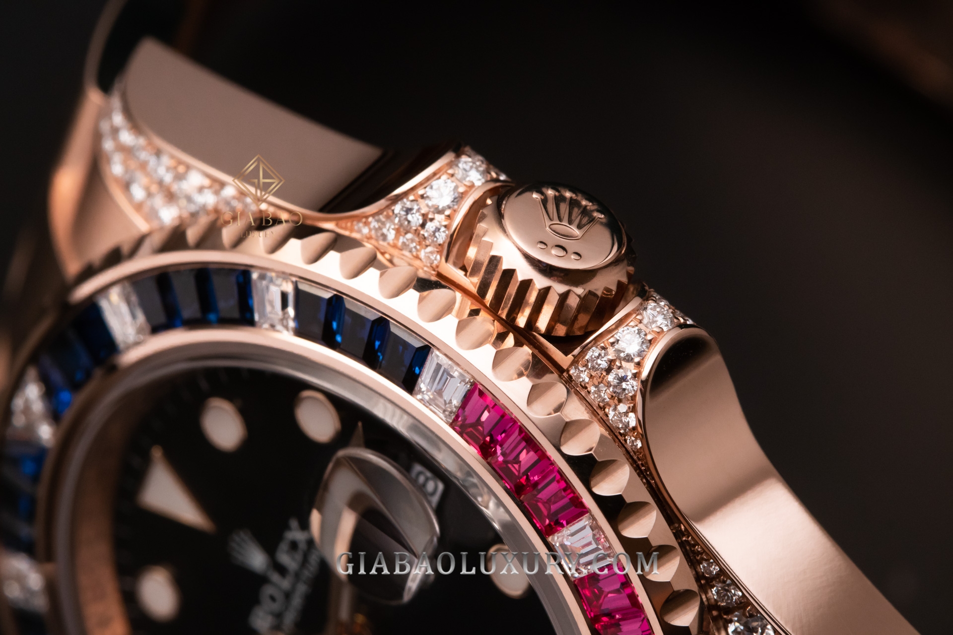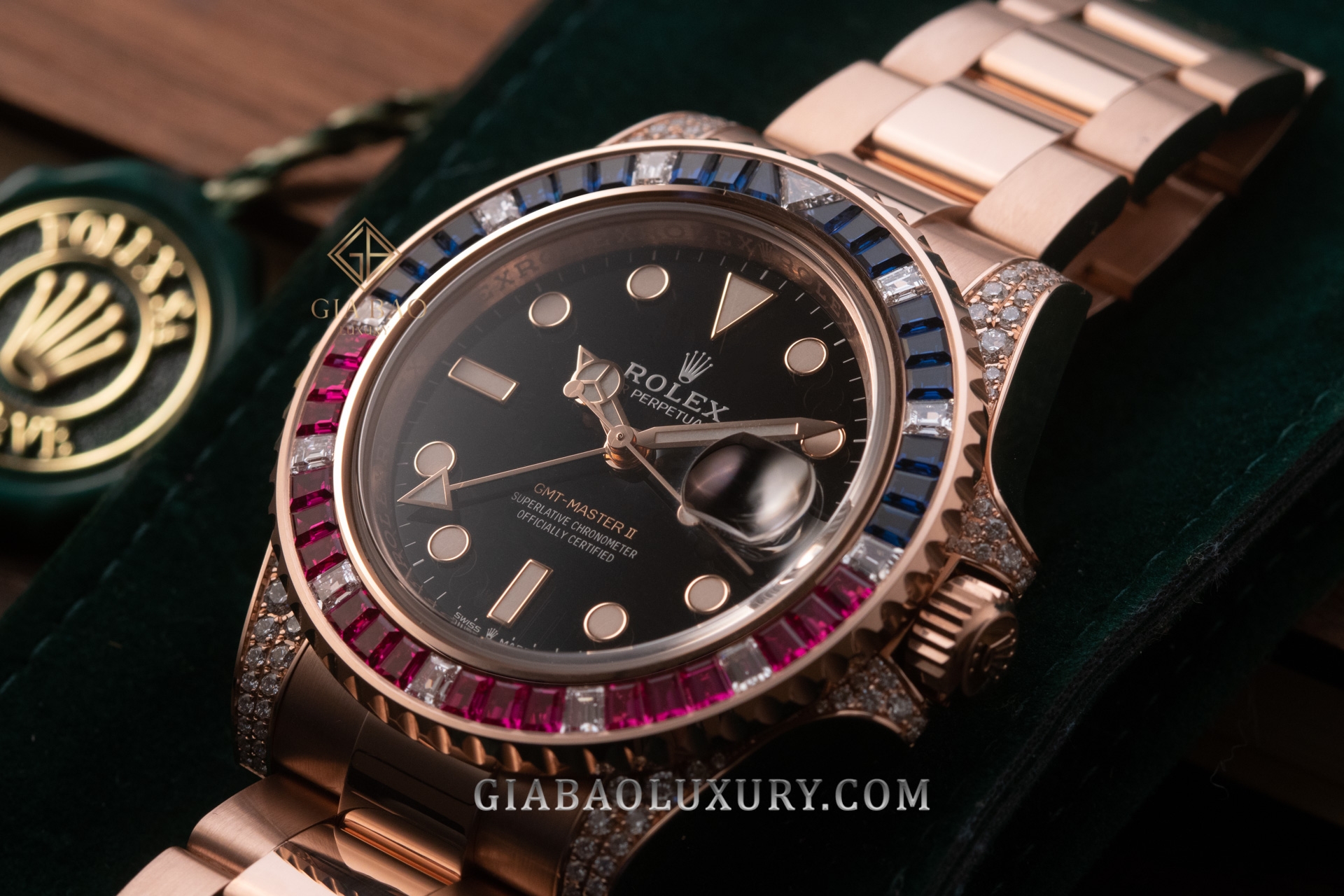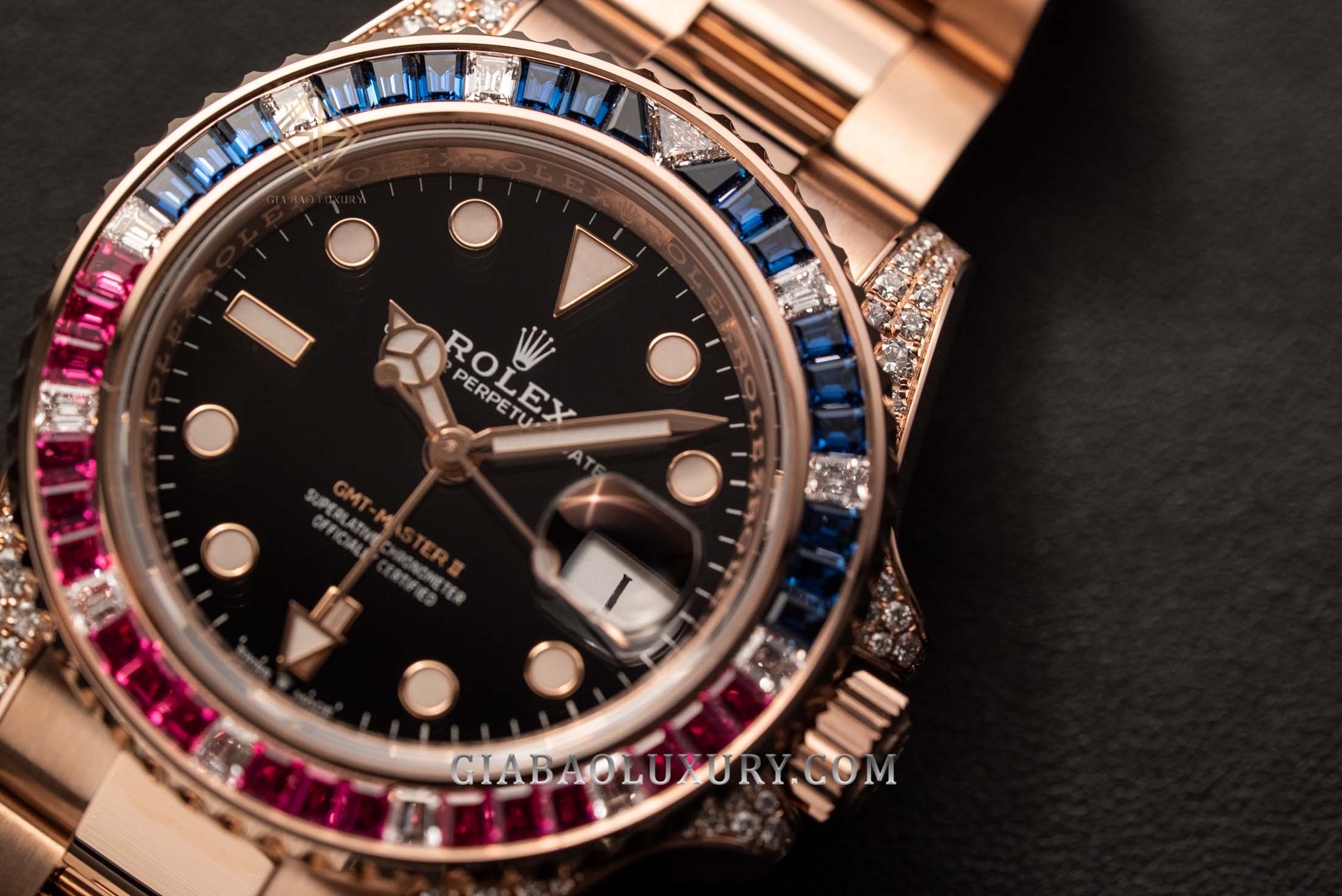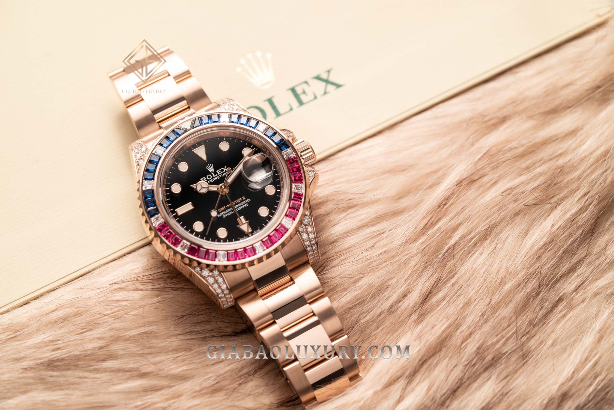 Sở hữu những thiết kế truyền thống của dòng Rolex GMT-Master II, tạo tác với vẻ đẹp thẩm mỹ nổi bật đã nhanh chóng thu hút người hâm mộ đồng hồ trên toàn thế giới. Đó là thiết kế vỏ Oyster huyền thoại bằng vàng hồng toát lên vẻ quý tộc, hiện đại, phù hợp với quan điểm thẩm mỹ của khách hàng hiện nay. Là vành bezel xoay chiều đặc trưng có lớp đệm Cerachrom chia 24 giờ được làm từ gốm Ceramic nay được thay thế bằng 48 viên đá hồng ngọc đang tỏa sắc màu khiến chiếc đồng hồ trở nên rực rỡ hơn bao giờ hết.