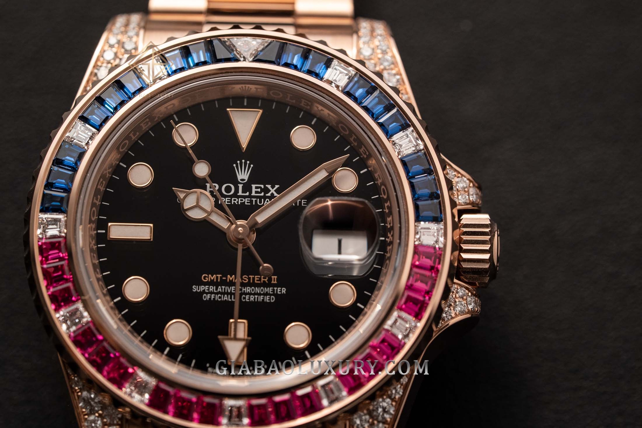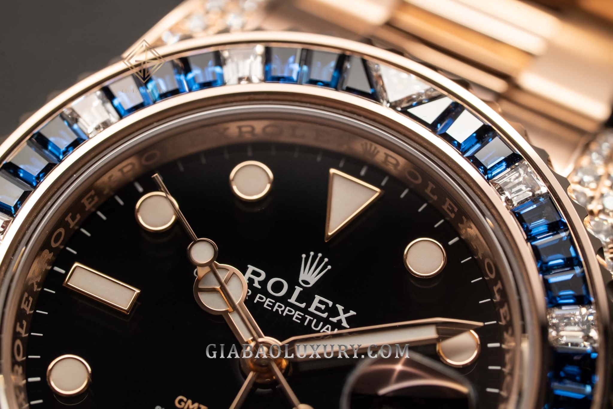 Lộng lẫy và cuốn hút, tạo tác gây ấn tượng mạnh với giới mộ điệu bởi sự đắt đỏ, đẳng cấp của bộ khung vỏ và hữu ích của mặt số đen huyền bí. Trên nền đen đầy mê hoặc là các cọc số hình học viền vàng được phủ chất phát quang Chromalight có khả năng phát sáng trong bóng tối. Cùng với đó là bộ kim trung tâm Mercedes có kim giây thứ hai hình mũi tên cũng cùng chất liệu với các cọc số vừa thực hiện chức năng chuyên dụng của dòng GMT-Master II vốn dành cho các nhà du hành, phi công, vừa tăng độ thẩm mỹ, dễ nhìn cho tạo tác.