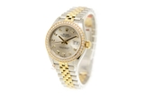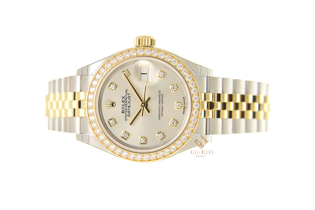 Đồng Hồ Rolex Lady-Datejust 28 279383RBR Mặt Số Bạc Nạm Kim Cương là một sản phẩm thuộc bộ sưu tập đồng hồ Lady - Datejust dành cho nữ của Rolex. Sản phẩm sở hữu dáng tròn nữ tính, nổi bật với vành bezel được làm từ chất liệu vàng vàng sáng bóng đính 46 viên kim cương cắt tròn lấp lánh.