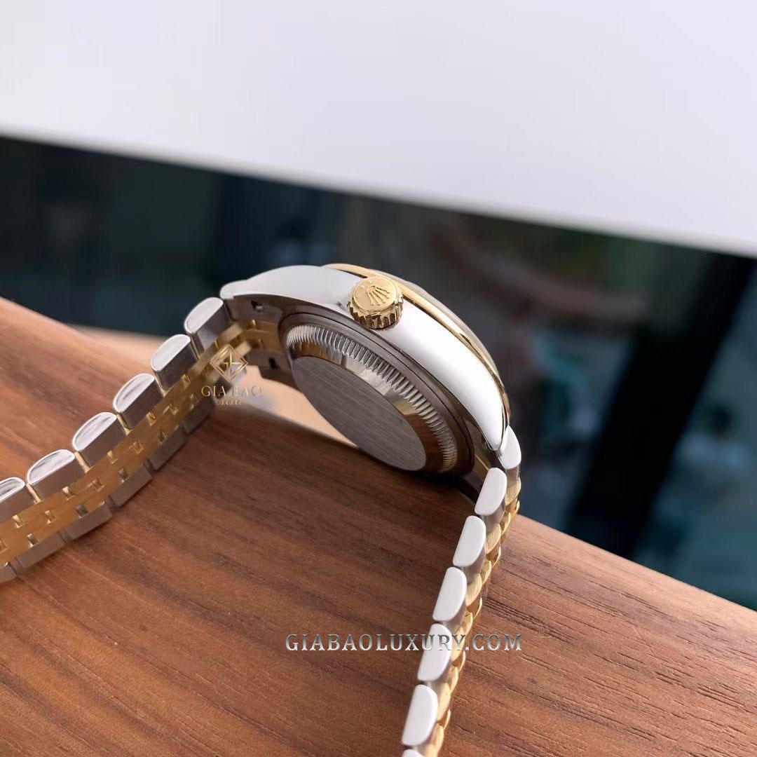Tổng thể chiếc Rolex Lady-Datejust 28 279383RBR là sự kết hợp hài hòa của hai gam màu trắng bạc và vàng tạo nên một tuyệt phẩm thời trang nơi cổ tay của những quý cô sang trọng.