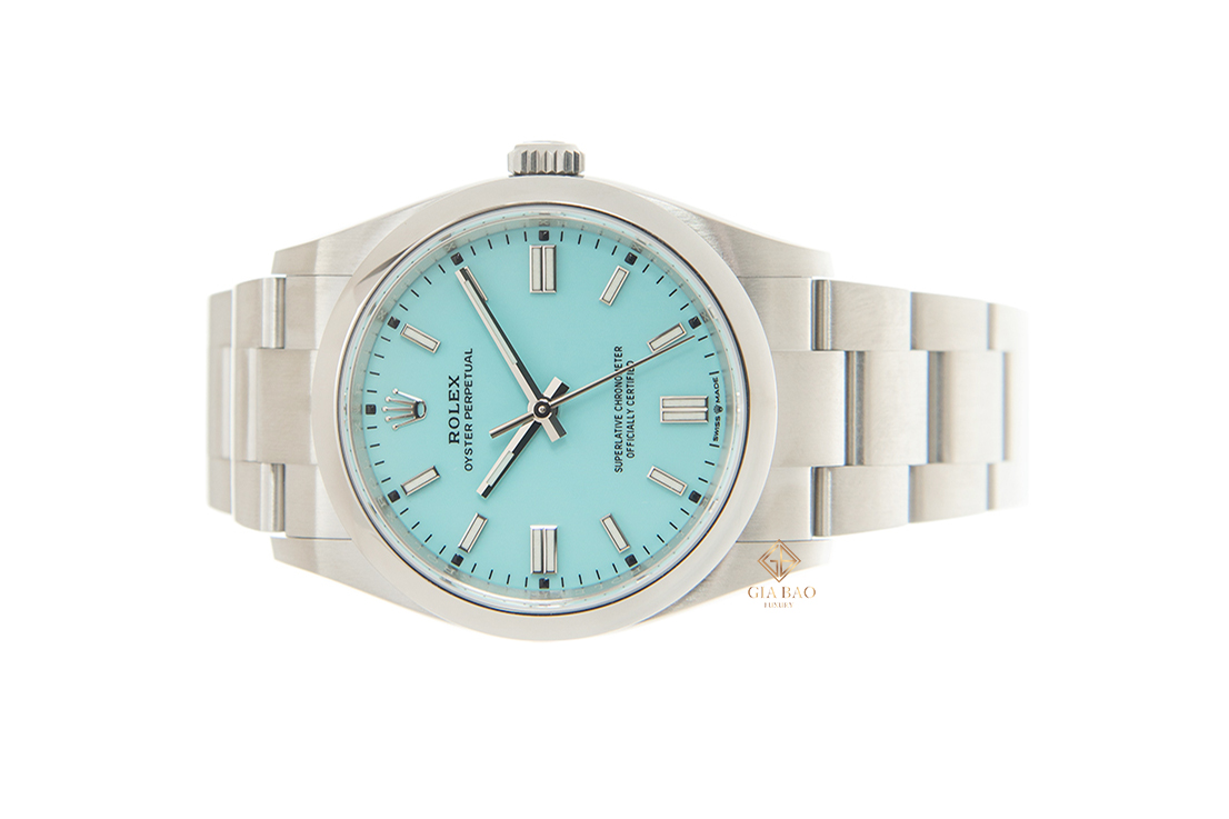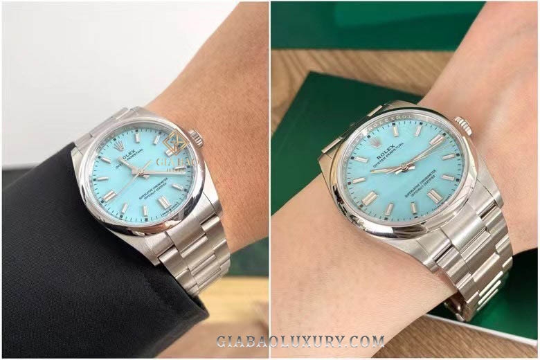 Nếu so sánh với những thiết kế sặc sỡ của Hublot hay Audemars Piguet, chúng ta đều phải công nhận rằng những chiếc Rolex trông hợp lý, dễ vào mắt hơn nhiều. Trong trường hợp của chiếc Rolex Oyster Perpetual 36 126000-0006, mặt số màu xanh ngọc được chuyển tông nhạt hơn (Ice Blue). Màu này có sự độc đáo, lạ mắt, nhưng vẫn không quá lòe loẹt và rất dễ sử dụng.