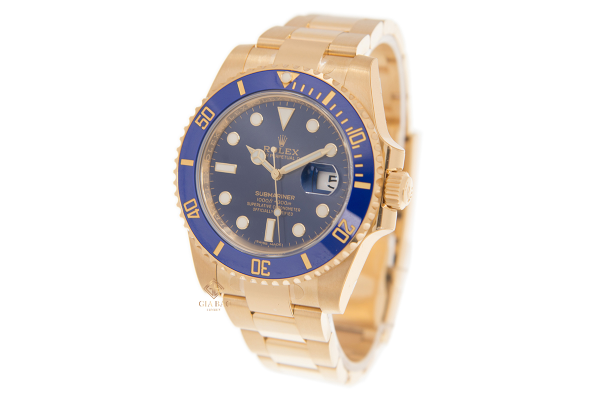 Không dừng lại ở vàng vàng, vành bezel trên bộ vỏ khung kích thước 40mm của cỗ máy Rolex Submariner Date 116618 còn được làm từ gốm cerachrom có màu xanh thẫm độc đáo. Tiên phong trong việc chế tạo gốm ceramic có màu sắc rực rỡ chính là Rolex. Không dừng lại ở màu xanh thẫm như trên mẫu Rolex Submariner Date 116618, người yêu đồng hồ còn có thể tìm thấy vành bezel cerachrom màu đỏ, xanh lá, nâu,… trên nhiều thiết kế khác của hãng.