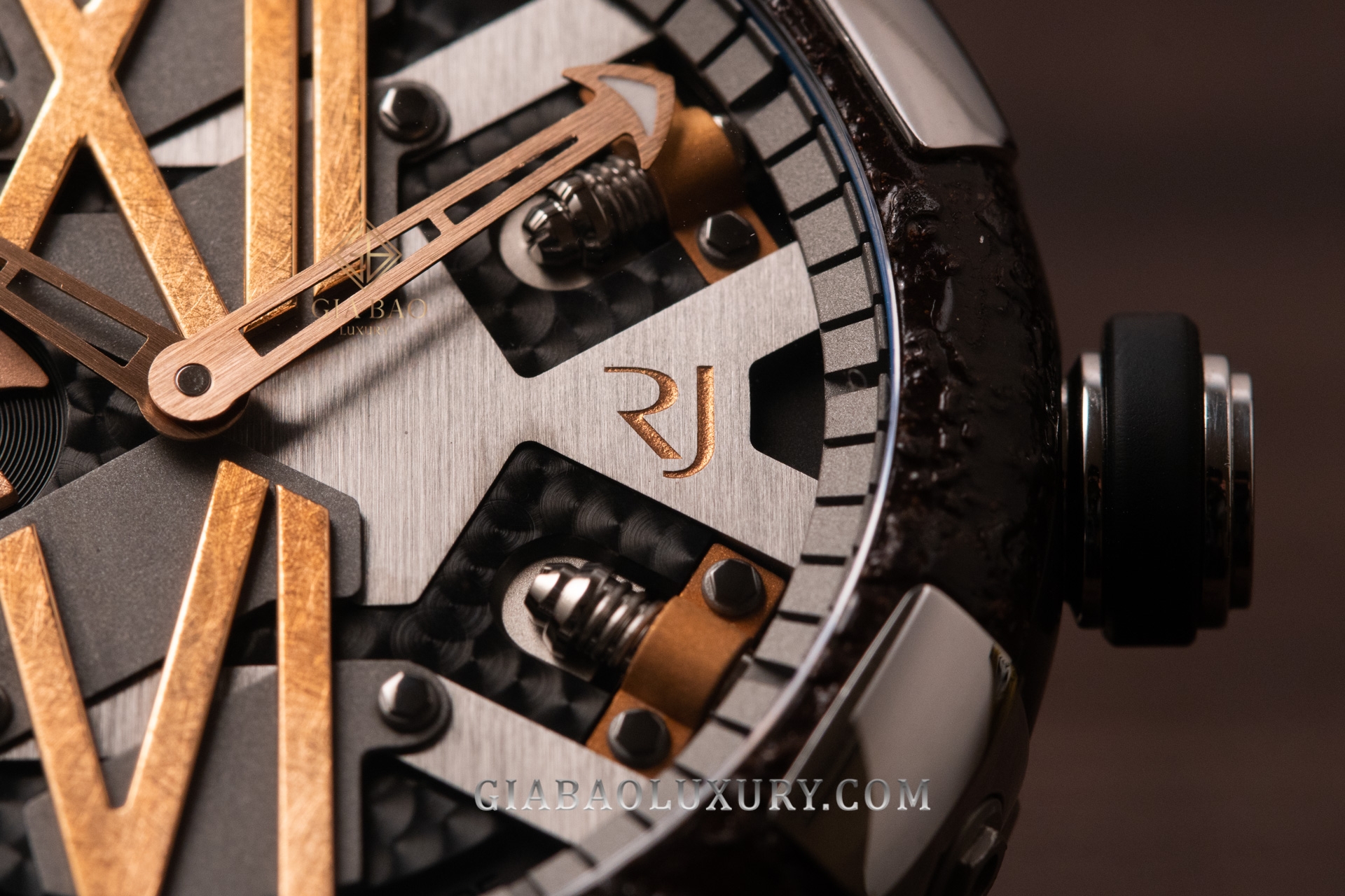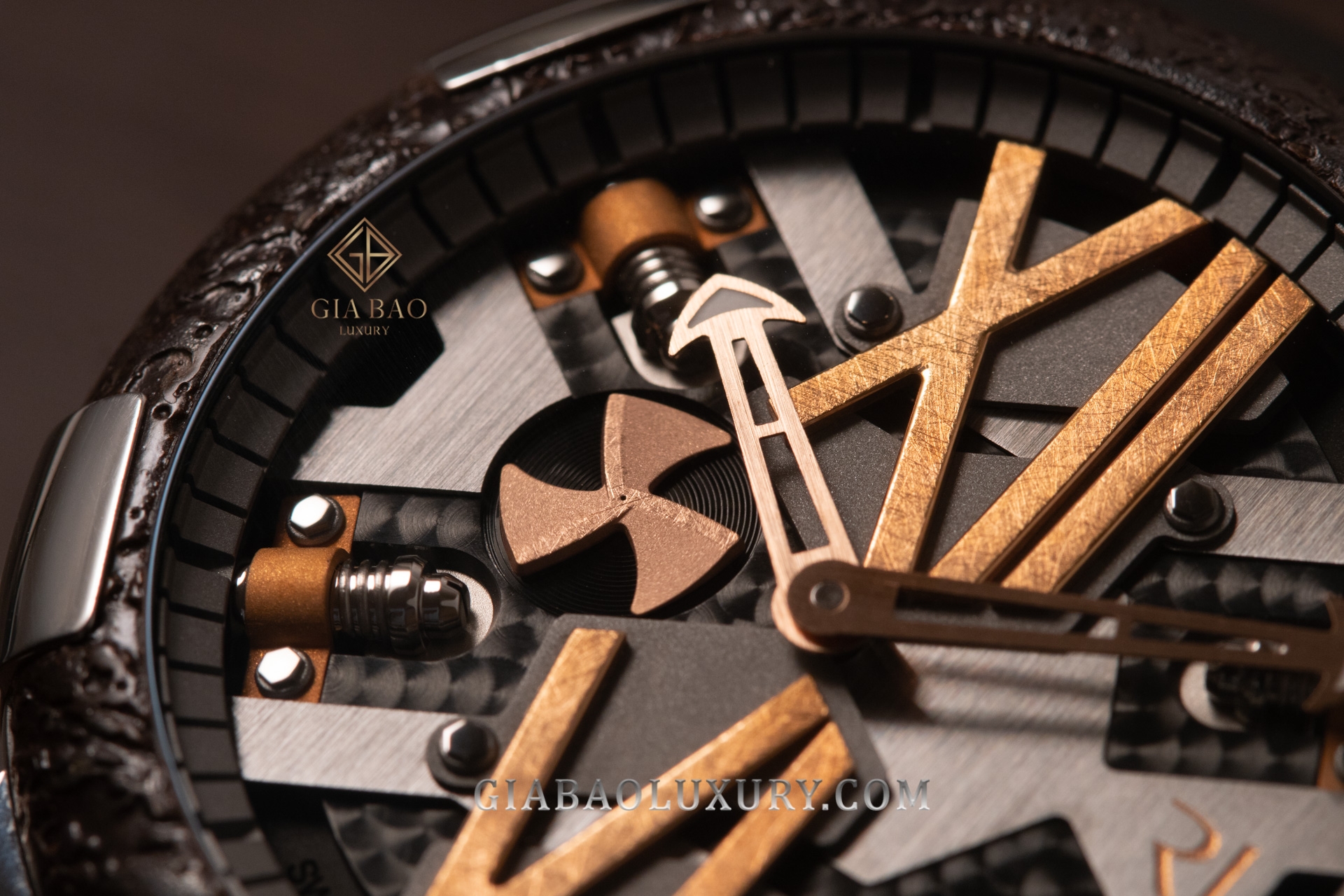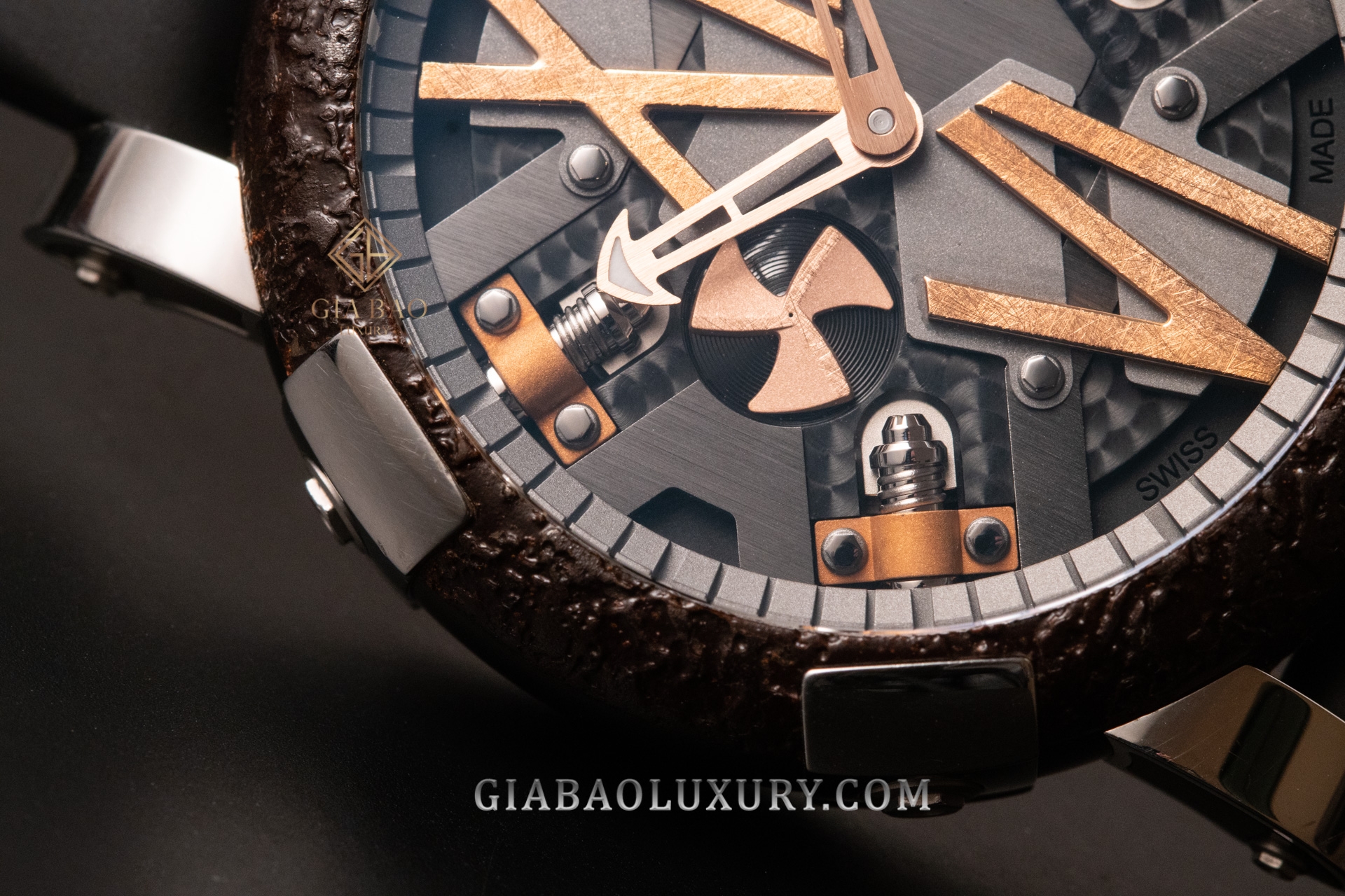 Thật thú vị, có rất nhiều hình thức hoàn thiện đã được thực hiện trên mặt số đồng hồ Romain Jerome Steampunk RJ.T.AU.SP.006.09. Rất dễ để chúng ta nhìn thấy những vân perlage xoáy sâu cuốn hút, chải xước satin mạnh mẽ, chải nhám “lộn xộn” trên cọc giờ số La Mã, cùng bề mặt sáng bóng của những đinh vít cố định từng cầu nối được giữ lại trên mặt số đã được thiết kế dạng skeleton khỏe khoắn. Còn lại logo thương hiệu đã được đặt góc 3 giờ rất dễ nhìn trên mặt số, gần với núm vặn cỡ lớn ngoài vỏ khung.