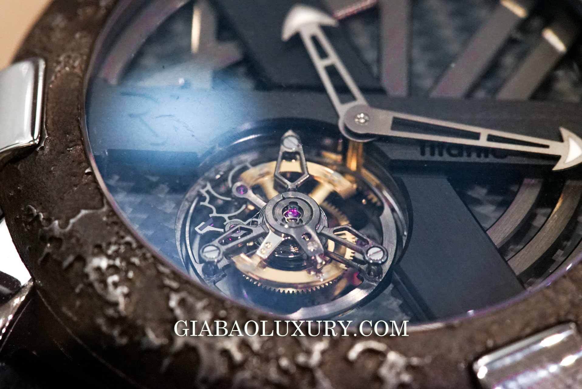 Mặt số đồng hồ được hoàn thiện với những họa tiết sợi Carbon và 3 cọc số 9, 12, 3 dạng số La Mã, được chia cắt bởi một dấu X lớn. Thiết kế này thể hiện rõ thêm phong cách mạnh mẽ của Titanic DNA. Ở góc 6 giờ là lồng Tourbillon có kích thước khá lớn, nổi bật và tạo thêm sức sống cho mặt số.