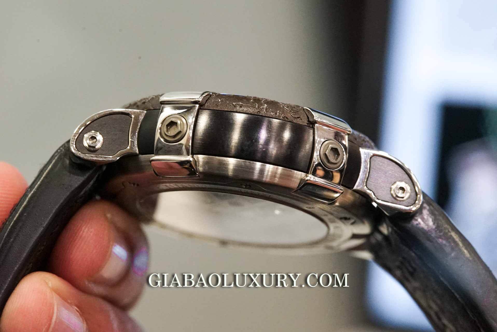 Ở mặt đáy, khung cảnh vẫn rất ấn tượng nhưng không có nhiều hoạt động như trên mặt số. Chúng ta chỉ thấy được một chữ X lớn chia cắt mặt số thành 4 phần. Họa tiết sợi Carbon vẫn tiếp tục được sử dụng ở 1/4 phía trên, trong khi đó phần còn lại được hoàn thiện sần và có thêm chút điểm nhấn nhờ chân kính và vài đinh ốc.