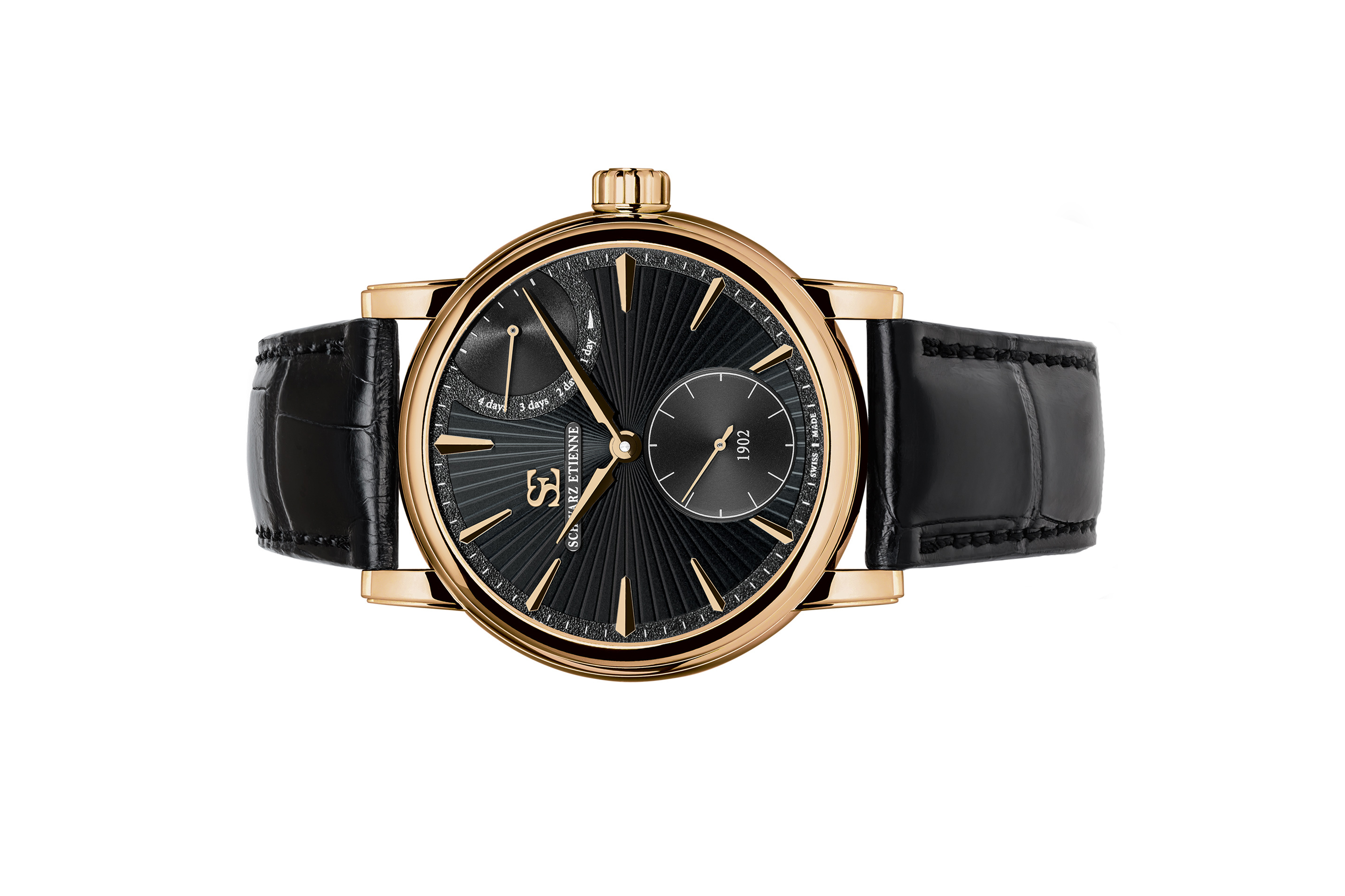 Để tô điểm cho phần mặt số rực rỡ, Schwarz Etienne chọn dây da nâu kiểu “aged” (giả cổ), lót bên trong màu xám, khiến đồng hồ toát lên vẻ thanh lịch mà không mất chất cổ điển. Phần khóa gập (folding buckle) bằng thép không gỉ, khắc logo Schwarz Etienne, đóng mở nhẹ nhàng và chắc chắn, giúp người đeo dễ dàng điều chỉnh sao cho ôm sát cổ tay.