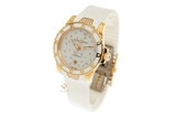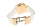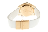 Để tăng thêm hiệu quả thẩm mỹ của sản phẩm, cũng như đáp ứng nhu cầu của người đeo, nhà Ulysse Nardin đã lựa chọn mẫu dây đeo màu trắng bằng cao su cho phiên bản đồng hồ này. Bên cạnh sự hài hòa, trang nhã mà màu dây đeo mang lại, chất liệu cao su cũng đem tới cho khách hàng những trải nghiệm đeo hết sức mới lạ, nhẹ nhàng và đặc biệt thanh thoát. Ở phía móc khóa dây tiếp nối với bộ vỏ, 30 viên kim cương cũng được đính lên vô cùng cẩn thận, tạo nên một màn trình diễn ánh sáng đầy ấn tượng cho chiếc đồng hồ.
