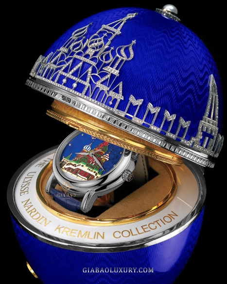 Sự đặc biệt của chiếc Ulysse Nardin Kremlin Automatic 139-10 chưa dừng lại ở thiết kế đồng hồ hay là mặt số, mà còn ở hộp đựng bên ngoài. Chiếc đồng hồ này được đặt trong quả trứng Faberge được tráng men xanh lam, trang trí bởi những họa tiết Guilloche và đá quý. Rìa quả trứng được hoàn thiện bằng vàng trắng, nạm thêm kim cương tạo hình giống với hình ảnh cung điện Kremlin. Tất cả những món đồ quý giá này lại được đặt bên trong một hộp gỗ cao cấp, đem đến cảm giác cực kỳ sang trọng.