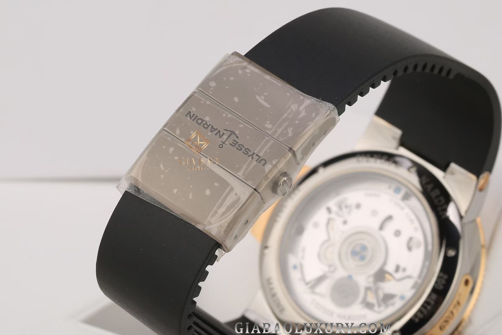 Bộ dây được làm từ chất liệu cao su, và theo lẽ thường người dùng sẽ phải cắt dây để phù hợp với kích thước cổ tay. Tuy nhiên, nếu cắt quá nhiều, khóa dây sẽ lệch về một phía và cọ vào cạnh bàn tay gây khó chịu. Hiểu được điều đó, Ulysse Nardin đã lắp thêm một miếng lót nhỏ bằng kim loại, vừa tạo hiệu ứng hình ảnh và vừa giúp người dùng căn chỉnh dây sao cho phù hợp.