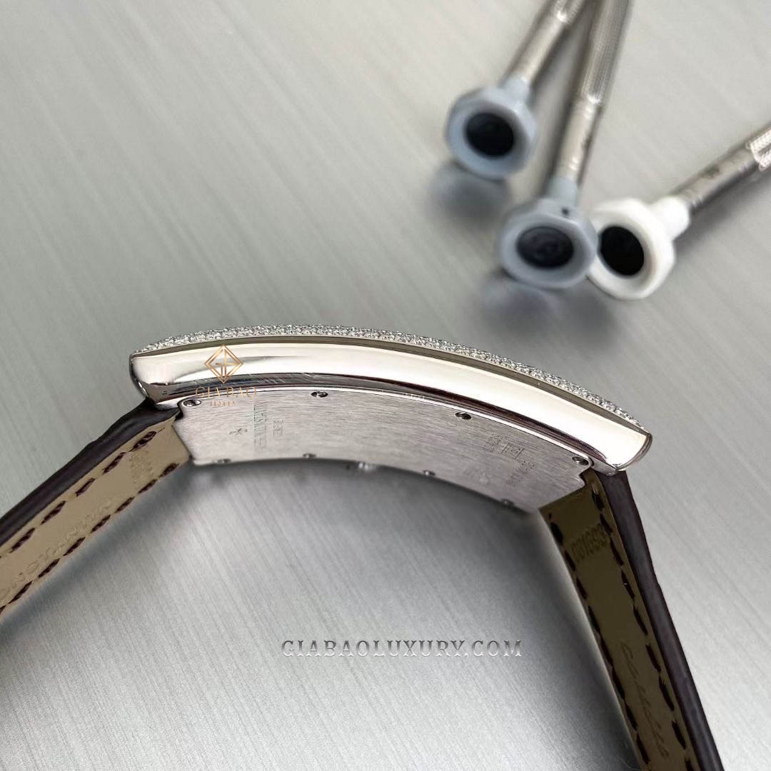 Trên vành bezel hình thang cân ấn tượng là 308 viên kim cương sáng lấp lánh. Những viên kim cương được tuyển chọn kỹ lưỡng và gia công cẩn thận, đẹp không tì vết mang tới cho chiếc đồng hồ không chỉ là vẻ đẹp hoàn mỹ mà còn là sự bền bỉ khi đây là một trong những loại đá quý có độ cứng vào bậc nhất trong kim hoàn. Góc 3 giờ bên ngoài bộ vỏ khung nhô ra núm điều chỉnh nhỏ nhắn với phần viền được khía rãnh đều đặn và sắc nét.